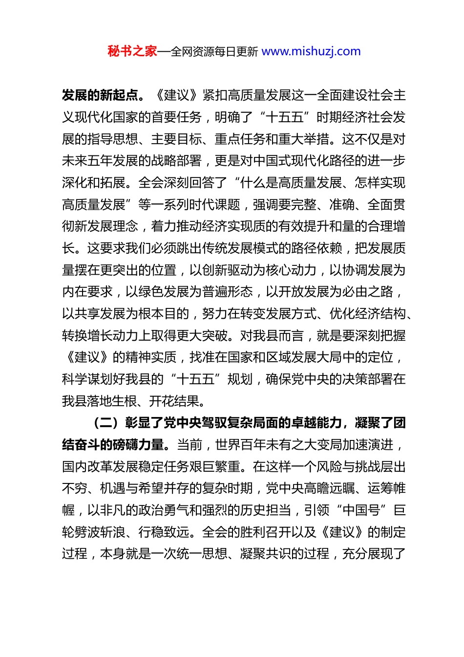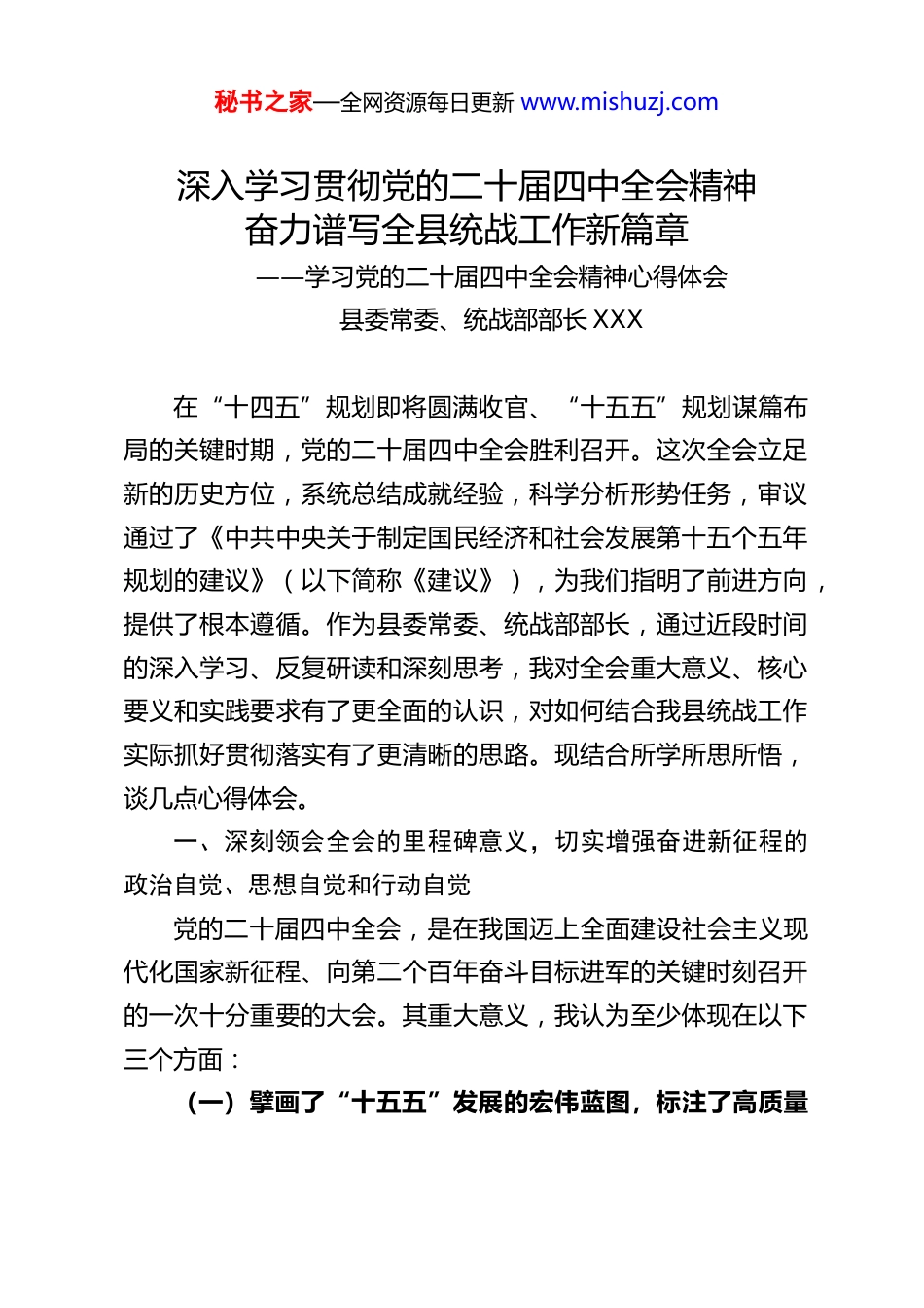 秘书之家—全网资源每日更新 www.mishuzj.com深入学习贯彻党的二十届四中全会精神奋力谱写全县统战工作新篇章——学习党的二十届四中全会精神心得体会县委常委、统战部部长 XXX在“十四五”规划即将圆满收官、“十五五”规划谋篇布局的关键时期,党的二十届四中全会胜利召开。这次全会立足新的历史方位,系统总结成就经验,科学分析形势任务,审议通过了《中共中央关于制定国民经济和社会发展第十五个五年规划的建议》(以下简称《建议》),为我们指明了前进方向,提供了根本遵循。作为县委常委、统战部部长,通过近段时间的深入学习、反复研读和深刻思考,我对全会重大意义、核心要义和实践要求有了更全面的认识,对如何结合我县统战工作实际抓好贯彻落实有了更清晰的思路。现结合所学所思所悟,谈几点心得体会。一、深刻领会全会的里程碑意义,切实增强奋进新征程的政治自觉、思想自觉和行动自觉党的二十届四中全会,是在我国迈上全面建设社会主义现代化国家新征程、向第二个百年奋斗目标进军的关键时刻召开的一次十分重要的大会。其重大意义,我认为至少体现在以下三个方面:(一)擘画了“十五五”发展的宏伟蓝图,标注了高质量秘书之家—全网资源每日更新 www.mishuzj.com发展的新起点。《建议》紧扣高质量发展这一全面建设社会主义现代化国家的首要任务,明确了“十五五”时期经济社会发展的指导思想、主要目标、重点任务和重大举措。这不仅是对未来五年发展的战略部署,更是对中国式现代化路径的进一步深化和拓展。全会深刻回答了“什么是高质量发展、怎样实现高质量发展”等一系列时代课题,强调要完整、准确、全面贯彻新发展理念,着力推动经济实现质的有效提升和量的合理增长。这要求我们必须跳出传统发展模式的路径依赖,把发展质量摆在更突出的位置,以创新驱动为核心动力,以协调发展为内在要求,以绿色发展为普遍形态,以开放发展为必由之路,以共享发展为根本目的,努力在转变发展方式、优化经济结构、转换增长动力上取得更大突破。对我县而言,就是要深刻把握《建议》的精神实质,找准在国家和区域发展大局中的定位,科学谋划好我县的“十五五”规划,确保党中央的决策部署在我县落地生根、开花结果。(二)彰显了党中央驾驭复杂局面的卓越能力,凝聚了团结奋斗的磅礴力量。当前,世界百年未有之大变局加速演进,国内改革发展稳定任务艰巨繁重。在这样一个风险与挑战层出不穷、机遇与希望并存的复杂时期,党中央高瞻远瞩、运筹帷幄,以非凡的政治勇气和强烈的历史担当,引领“中国号”巨轮劈波斩浪、行稳致远。全会的胜利召开以及《建议》的制定过程,本身就是一次统一思想、凝聚共识的过程,充分展现了秘书之家—全网资源每日更新 www.mishuzj.com我们党强大的政治领导力、思想引领力、群众组织力、社会号召力。会议成果集中了全党智慧,回应了人民期盼,必将进一步激发全国各族人民团结奋斗的热情和干劲,汇聚起攻坚克难、开拓前进的磅礴伟力。作为党员领导干部,特别是统战系统的负责人,我深感责任重大,必须带头维护党中央权威和集中统一领导,带头学习贯彻全会精神,切实把全县统战成员的思想和行动统一到全会确定的目标任务上来。(三)凸显了统一战线的重要法宝作用,拓展了服务大局的广阔空间。全会通过的《建议》,不仅为党和国家事业发展指明了方向,也为统一战线围绕中心、服务大局提供了根本遵循和行动指南。《建议》中蕴含的关于促进“两个健康”、激发各类市场主体活力、推进区域协调发展、全面推进乡村振兴、扎实推动共同富裕、发展社会主义民主政治、建设更高水平平安中国等一系列部署要求,都与统战工作密切相关,都需要统一战线发挥优势、贡献力量。会议强调要“持续巩固和发展最广泛的爱国统一战线”,这充分体现了党中央对统战工作的高度重视和殷切期望。全县统战系统必须深刻认识到,在实现“十五五”规划目标的征程中,统一战线肩负着凝聚人心、汇聚力量的神圣职责,拥有着施展才华、展现作为的广阔舞台。我们要进一步增强做好新时代统战工作的使命感、责任感和光荣感,把法宝作用更好地发挥出来。二、准确把握全会的核心要义和精神实...