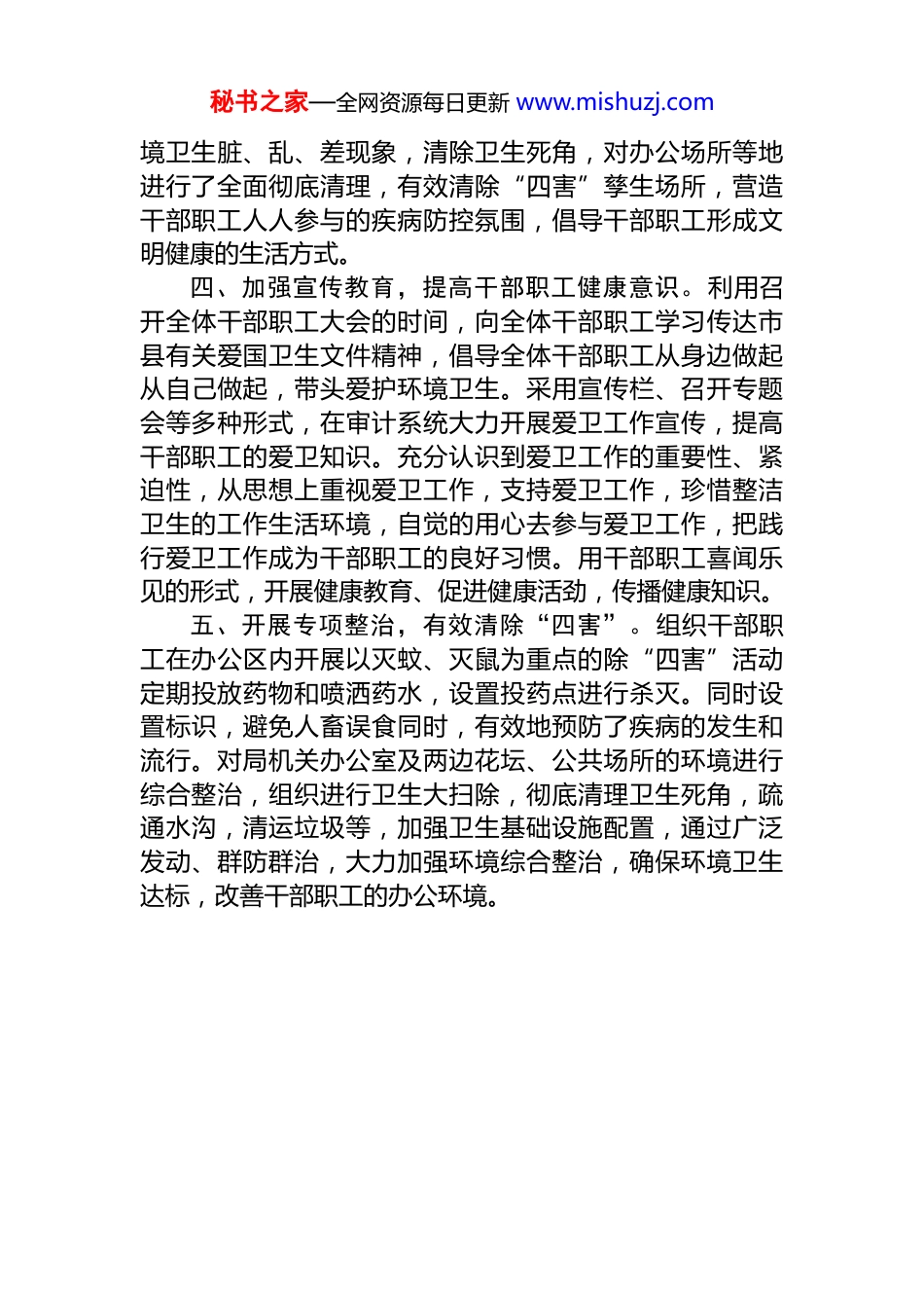 秘书之家—全网资源每日更新 www.mishuzj.com县审计局 2025 年爱国卫生运动工作总结2025 年,我局爱国卫生工作在县委、县政府正确领导和县爱卫办指导帮助下,按照爱国卫生工作部署要求,加强爱卫工作管理,加大爱卫宣传教育,抓好环境卫生治理,认真组织开展爱国卫生月活动和春季除“四害”活动,积极探索爱卫工作的长效机制。现将工作总结如下:一、加强组织领导,明确工作职责。成立了由局长任组长,分管领导任副组长,各股室负责人为成员的爱卫工作领导小组,定期召开工作会议、查找不足、制定措施、解决问题,做到爱卫工作有计划、有安排、有落实,确保爱卫工作处处有人管、事事有人问,采取灵活多样工作形式,对环境卫生工作实行动态管理,跟踪检查,有效确保爱卫工作顺利开展。二、建立长效机制,落实工作责任。坚持用制度管理人、用制度约束人的原则,严格落实责任承包制,加强落实保洁制度,完善卫生长效管理措施,修订完善了《卫生检查制度》责任规章制度,完善考核监督机制。抓好单位内部卫生管理,做到每日小扫除,每周大扫除。定期或不定期检查和抽查,根据检查情况,进行打分并通报,有效确保了各项制度落到实处,各项责任落实在人。三、广泛宣传,开展爱国卫生月活动。我局根据县爱卫办要求,研究制定了爱国卫生月活动计划和宣传方案,对活动进行了周密详细的布置安排,务求将活动落实到实处、取得实效。活动期间,充分利用宣传栏、张贴宣传画和悬挂横幅标语等多形式广泛深入开展宣传活动,开展以防止蚊虫、鼠等重要病媒生物和预防流行性传染病为重点宣传教育活动,进一步增强干部职工的自我防病能力,提高干部职工除害防病意识。组织机关干部职工积极参与治理环秘书之家—全网资源每日更新 www.mishuzj.com境卫生脏、乱、差现象,清除卫生死角,对办公场所等地进行了全面彻底清理,有效清除“四害”孳生场所,营造干部职工人人参与的疾病防控氛围,倡导干部职工形成文明健康的生活方式。四、加强宣传教育,提高干部职工健康意识。利用召开全体干部职工大会的时间,向全体干部职工学习传达市县有关爱国卫生文件精神,倡导全体干部职工从身边做起从自己做起,带头爱护环境卫生。采用宣传栏、召开专题会等多种形式,在审计系统大力开展爱卫工作宣传,提高干部职工的爱卫知识。充分认识到爱卫工作的重要性、紧迫性,从思想上重视爱卫工作,支持爱卫工作,珍惜整洁卫生的工作生活环境,自觉的用心去参与爱卫工作,把践行爱卫工作成为干部职工的良好习惯。用干部职工喜闻乐见的形式,开展健康教育、促进健康活劲,传播健康知识。五、开展专项整治,有效清除“四害”。组织干部职工在办公区内开展以灭蚊、灭鼠为重点的除“四害”活动定期投放药物和喷洒药水,设置投药点进行杀灭。同时设置标识,避免人畜误食同时,有效地预防了疾病的发生和流行。对局机关办公室及两边花坛、公共场所的环境进行综合整治,组织进行卫生大扫除,彻底清理卫生死角,疏通水沟,清运垃圾等,加强卫生基础设施配置,通过广泛发动、群防群治,大力加强环境综合整治,确保环境卫生达标,改善干部职工的办公环境。