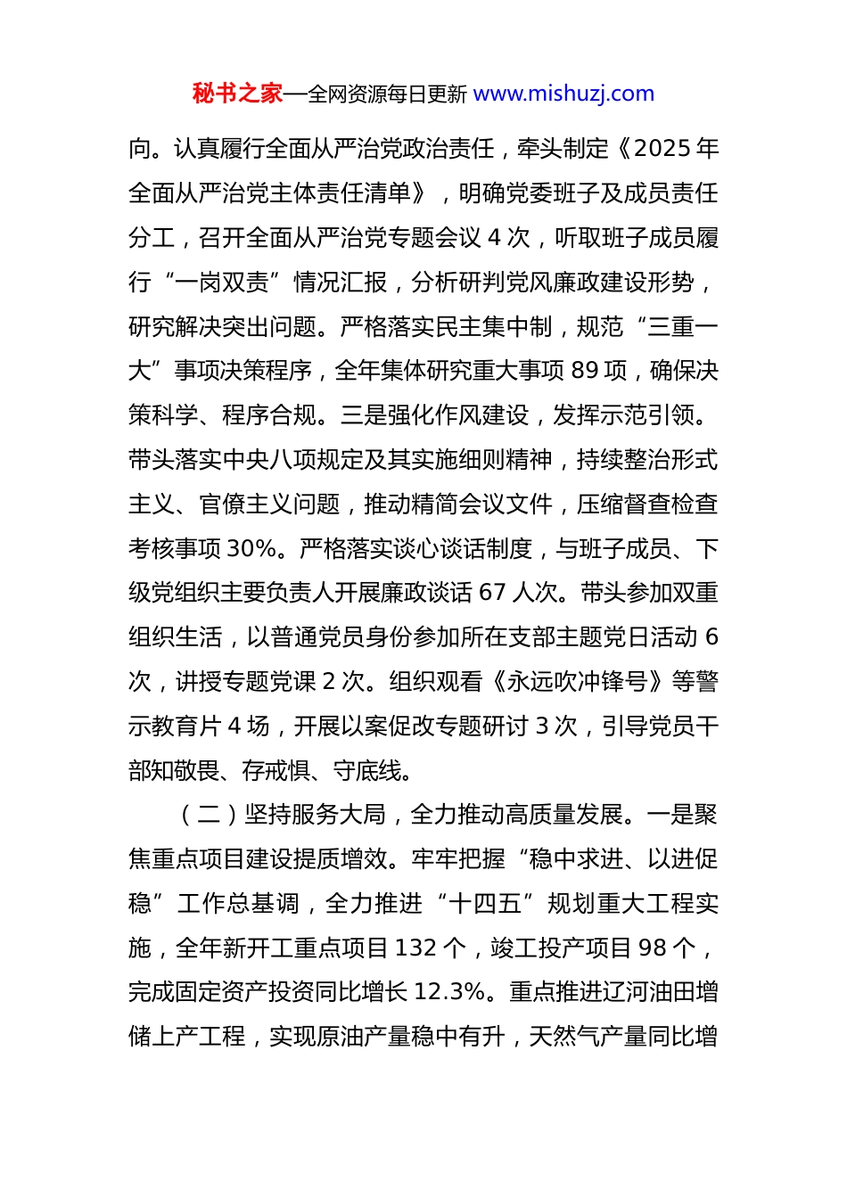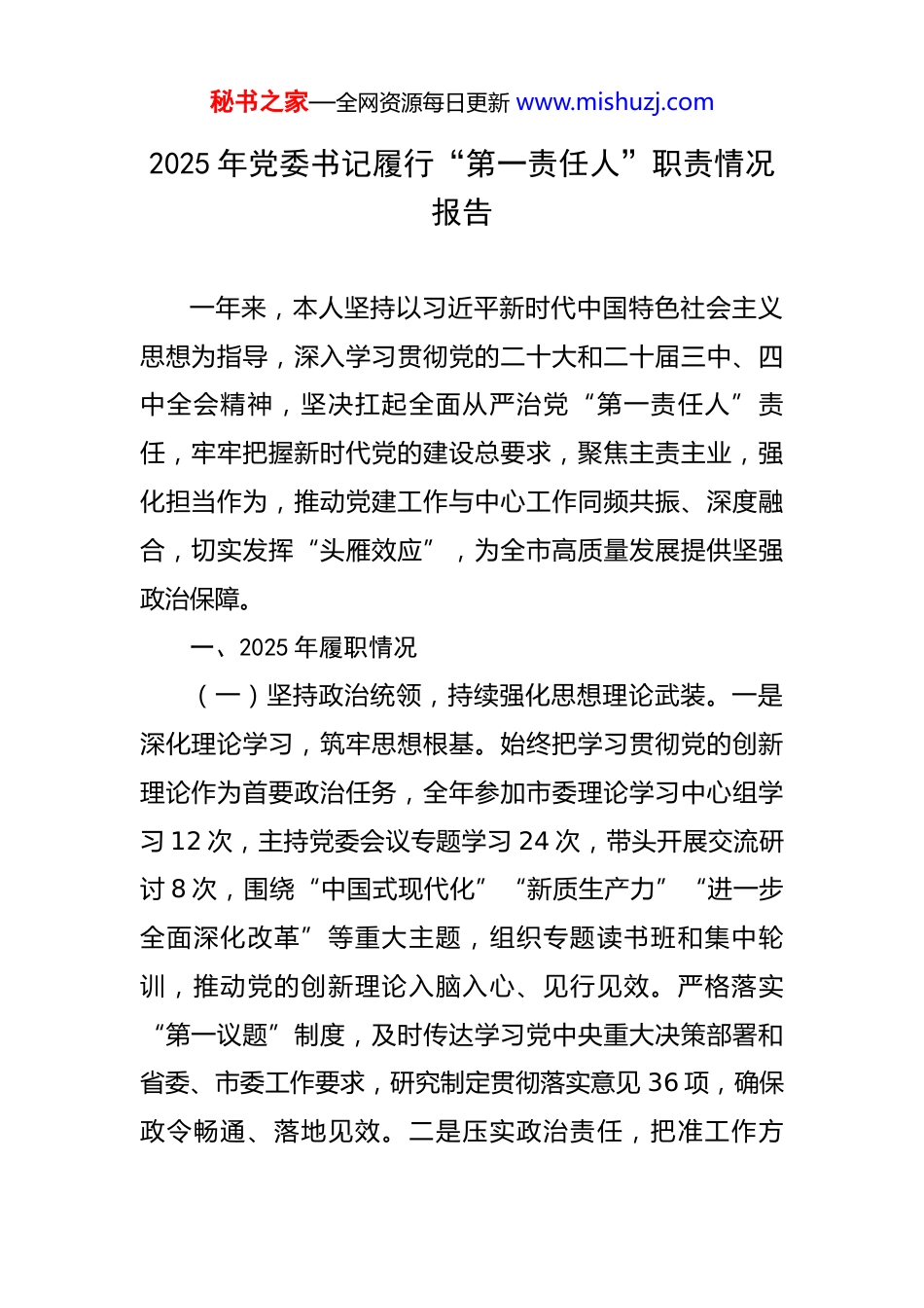 秘书之家—全网资源每日更新 www.mishuzj.com2025 年党委书记履行“第一责任人”职责情况报告 一年来,本人坚持以习近平新时代中国特色社会主义思想为指导,深入学习贯彻党的二十大和二十届三中、四中全会精神,坚决扛起全面从严治党“第一责任人”责任,牢牢把握新时代党的建设总要求,聚焦主责主业,强化担当作为,推动党建工作与中心工作同频共振、深度融合,切实发挥“头雁效应”,为全市高质量发展提供坚强政治保障。一、2025 年履职情况(一)坚持政治统领,持续强化思想理论武装。一是深化理论学习,筑牢思想根基。始终把学习贯彻党的创新理论作为首要政治任务,全年参加市委理论学习中心组学习 12 次,主持党委会议专题学习 24 次,带头开展交流研讨 8 次,围绕“中国式现代化”“新质生产力”“进一步全面深化改革”等重大主题,组织专题读书班和集中轮训,推动党的创新理论入脑入心、见行见效。严格落实“第一议题”制度,及时传达学习党中央重大决策部署和省委、市委工作要求,研究制定贯彻落实意见 36 项,确保政令畅通、落地见效。二是压实政治责任,把准工作方秘书之家—全网资源每日更新 www.mishuzj.com向。认真履行全面从严治党政治责任,牵头制定《2025 年全面从严治党主体责任清单》,明确党委班子及成员责任分工,召开全面从严治党专题会议 4 次,听取班子成员履行“一岗双责”情况汇报,分析研判党风廉政建设形势,研究解决突出问题。严格落实民主集中制,规范“三重一大”事项决策程序,全年集体研究重大事项 89 项,确保决策科学、程序合规。三是强化作风建设,发挥示范引领。带头落实中央八项规定及其实施细则精神,持续整治形式主义、官僚主义问题,推动精简会议文件,压缩督查检查考核事项 30%。严格落实谈心谈话制度,与班子成员、下级党组织主要负责人开展廉政谈话 67 人次。带头参加双重组织生活,以普通党员身份参加所在支部主题党日活动 6次,讲授专题党课 2 次。组织观看《永远吹冲锋号》等警示教育片 4 场,开展以案促改专题研讨 3 次,引导党员干部知敬畏、存戒惧、守底线。(二)坚持服务大局,全力推动高质量发展。一是聚焦重点项目建设提质增效。牢牢把握“稳中求进、以进促稳”工作总基调,全力推进“十四五”规划重大工程实施,全年新开工重点项目 132 个,竣工投产项目 98 个,完成固定资产投资同比增长 12.3%。重点推进辽河油田增储上产工程,实现原油产量稳中有升,天然气产量同比增秘书之家—全网资源每日更新 www.mishuzj.com长 8.5%;**扩能升级项目全面投产,年新增发电能力 120万千瓦;中海油流花油田开发进入稳产期,累计贡献产值超百亿元。谋划储备战略性新兴产业项目 45 个,推动形成“传统产业升级、新兴产业集聚”的发展格局。二是持续优化营商环境激发活力。深入实施营商环境优化提升三年行动,出台《2025 年营商环境攻坚行动方案》,全面推行“极简审批、极优服务”改革,工程建设项目审批时限压缩至 45 个工作日以内,社会投资类项目实现“拿地即开工”。深化“一网通办”改革,政务服务事项网上可办率达 98.7%,高频事项“跨省通办”覆盖率达 95%以上。建立企业诉求“接诉即办”机制,全年协调解决企业反映问题 327 件,企业满意度达 96.8%。三是精准发力招商引资积蓄动能。坚持招大引强、延链补链,组建 6 个专业化招商专班,赴京津冀、长三角、粤港澳大湾区等地开展专题招商活动 28 次,对接重点企业 180 余家。全年签约亿元以上项目 56 个,合同引资额突破 1200 亿元,其中高技术产业项目占比达 41%。成功引进新能源电池材料、高端装备制造等一批链主型项目,产业链集聚效应日益显现。(三)坚持人民至上,扎实推进平安法治建设。一是防范化解重大风险守牢底线。持续深化安全生产专项整治行动,聚焦城镇燃气、自建房、危化品、消防等重点领秘书之家—全网资源每日更新 www.mishuzj.com域,开展“拉网式”排查整治,累计排查整改安全隐患 1.2万项,挂牌督办重大隐患 43 项,实现较大及以上安全事故“零发生”。加强政府债务动态监控,严控新增隐性债务,...