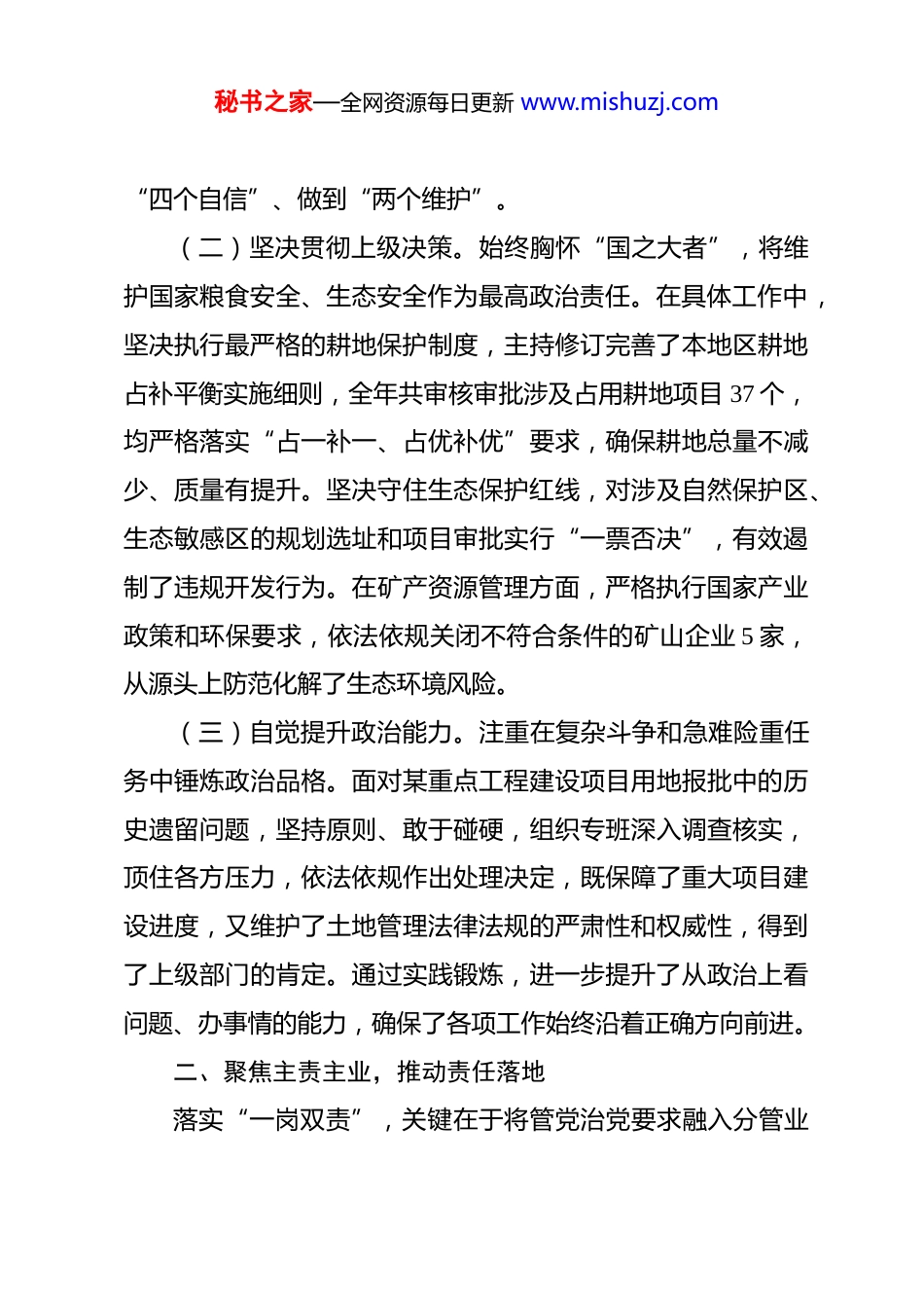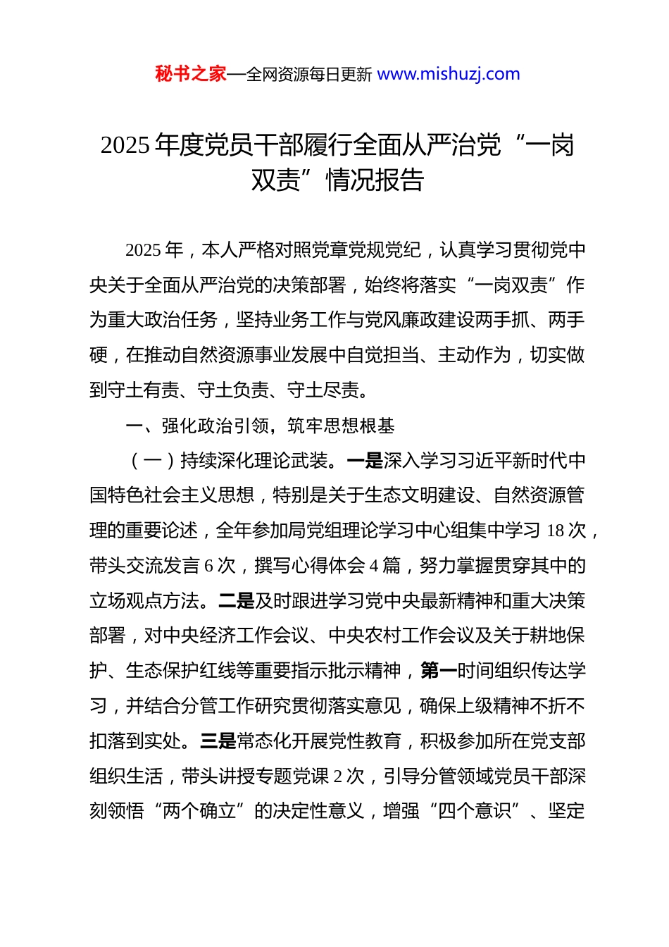 秘书之家—全网资源每日更新 www.mishuzj.com2025 年度党员干部履行全面从严治党“一岗双责”情况报告 2025 年,本人严格对照党章党规党纪,认真学习贯彻党中央关于全面从严治党的决策部署,始终将落实“一岗双责”作为重大政治任务,坚持业务工作与党风廉政建设两手抓、两手硬,在推动自然资源事业发展中自觉担当、主动作为,切实做到守土有责、守土负责、守土尽责。一、强化政治引领,筑牢思想根基(一)持续深化理论武装。一是深入学习习近平新时代中国特色社会主义思想,特别是关于生态文明建设、自然资源管理的重要论述,全年参加局党组理论学习中心组集中学习 18 次,带头交流发言 6 次,撰写心得体会 4 篇,努力掌握贯穿其中的立场观点方法。二是及时跟进学习党中央最新精神和重大决策部署,对中央经济工作会议、中央农村工作会议及关于耕地保护、生态保护红线等重要指示批示精神,第一时间组织传达学习,并结合分管工作研究贯彻落实意见,确保上级精神不折不扣落到实处。三是常态化开展党性教育,积极参加所在党支部组织生活,带头讲授专题党课 2 次,引导分管领域党员干部深刻领悟“两个确立”的决定性意义,增强“四个意识”、坚定秘书之家—全网资源每日更新 www.mishuzj.com“四个自信”、做到“两个维护”。(二)坚决贯彻上级决策。始终胸怀“国之大者”,将维护国家粮食安全、生态安全作为最高政治责任。在具体工作中,坚决执行最严格的耕地保护制度,主持修订完善了本地区耕地占补平衡实施细则,全年共审核审批涉及占用耕地项目 37 个,均严格落实“占一补一、占优补优”要求,确保耕地总量不减少、质量有提升。坚决守住生态保护红线,对涉及自然保护区、生态敏感区的规划选址和项目审批实行“一票否决”,有效遏制了违规开发行为。在矿产资源管理方面,严格执行国家产业政策和环保要求,依法依规关闭不符合条件的矿山企业 5 家,从源头上防范化解了生态环境风险。(三)自觉提升政治能力。注重在复杂斗争和急难险重任务中锤炼政治品格。面对某重点工程建设项目用地报批中的历史遗留问题,坚持原则、敢于碰硬,组织专班深入调查核实,顶住各方压力,依法依规作出处理决定,既保障了重大项目建设进度,又维护了土地管理法律法规的严肃性和权威性,得到了上级部门的肯定。通过实践锻炼,进一步提升了从政治上看问题、办事情的能力,确保了各项工作始终沿着正确方向前进。二、聚焦主责主业,推动责任落地落实“一岗双责”,关键在于将管党治党要求融入分管业秘书之家—全网资源每日更新 www.mishuzj.com务工作,做到知责于心、担责于身、履责于行,实现党建与业务同频共振、相互促进。(一)压实层级管理责任。一是明确责任分工。根据局党组统一部署,结合分管工作实际,制定个人年度“一岗双责”责任清单,细化分解目标任务,明确时间节点和具体措施,并与分管科室负责人签订党风廉政建设责任书,形成一级抓一级、层层抓落实的责任链条。二是加强日常督导。坚持定期听取分管科室党风廉政建设情况汇报,每季度至少开展一次专项检查或调研,重点检查政策执行、项目审批、资金使用等情况,及时发现苗头性、倾向性问题,提出整改要求。全年共开展监督检查 12 次,发现问题隐患 8 项,均已督促整改到位。三是强化考核问责。将党风廉政建设情况纳入分管科室年度绩效考核重要内容,与评优评先、干部推荐等挂钩,对履职不力的进行提醒谈话,切实传导压力、激发动力。(二)规范权力运行机制。一是优化审批流程。针对自然资源领域行政审批事项多、环节长的特点,牵头推进“放管服”改革,大力推行“互联网+政务服务”,将建设用地预审、规划许可等 15 项高频事项纳入网上办理平台,审批时限平均压缩 40%以上,有效减少了自由裁量空间,提高了服务效率。二是完善内控制度。组织修订《重大项目集体决策制度》《财务秘书之家—全网资源每日更新 www.mishuzj.com管理办法》《政府采购实施细则》等内部管理制度 6 项,进一步扎紧制度笼子。特别是在土地出让、矿业权设置等重点领域,严格执行“三重一大”决策程序,全年主持召开专题会议研究重大事项 ...