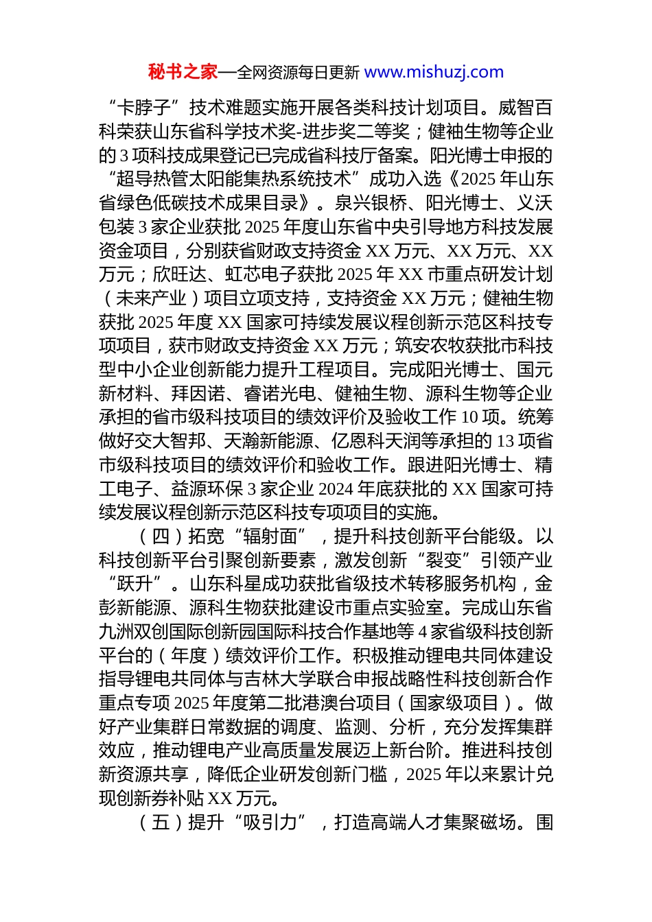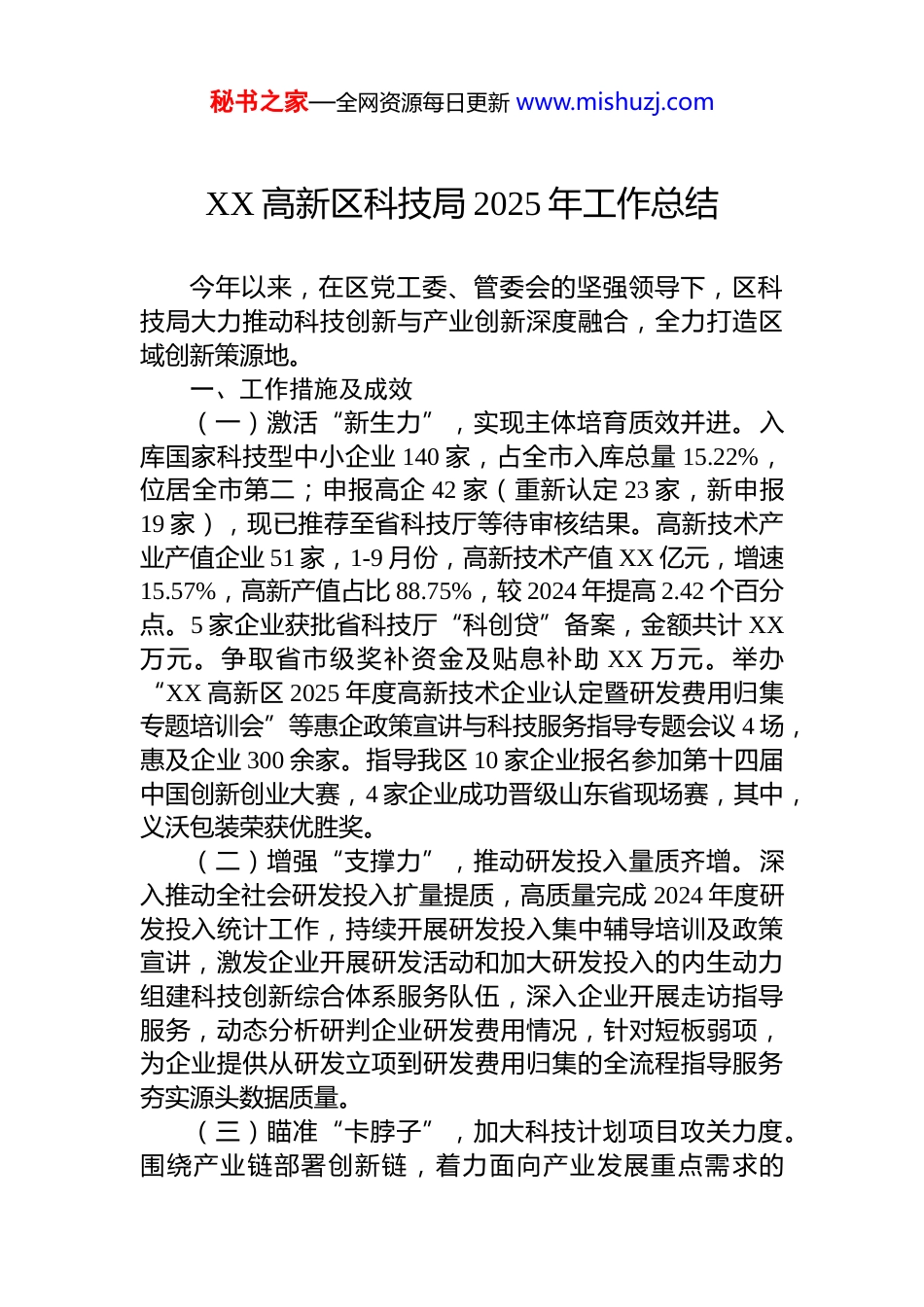 秘书之家—全网资源每日更新 www.mishuzj.comXX 高新区科技局 2025 年工作总结今年以来,在区党工委、管委会的坚强领导下,区科技局大力推动科技创新与产业创新深度融合,全力打造区域创新策源地。一、工作措施及成效(一)激活“新生力”,实现主体培育质效并进。入库国家科技型中小企业 140 家,占全市入库总量 15.22%,位居全市第二;申报高企 42 家(重新认定 23 家,新申报19 家),现已推荐至省科技厅等待审核结果。高新技术产业产值企业 51 家,1-9 月份,高新技术产值 XX 亿元,增速15.57%,高新产值占比 88.75%,较 2024 年提高 2.42 个百分点。5 家企业获批省科技厅“科创贷”备案,金额共计 XX万元。争取省市级奖补资金及贴息补助 XX 万元。举办“XX 高新区 2025 年度高新技术企业认定暨研发费用归集专题培训会”等惠企政策宣讲与科技服务指导专题会议 4 场,惠及企业 300 余家。指导我区 10 家企业报名参加第十四届中国创新创业大赛,4 家企业成功晋级山东省现场赛,其中,义沃包装荣获优胜奖。(二)增强“支撑力”,推动研发投入量质齐增。深入推动全社会研发投入扩量提质,高质量完成 2024 年度研发投入统计工作,持续开展研发投入集中辅导培训及政策宣讲,激发企业开展研发活动和加大研发投入的内生动力组建科技创新综合体系服务队伍,深入企业开展走访指导服务,动态分析研判企业研发费用情况,针对短板弱项,为企业提供从研发立项到研发费用归集的全流程指导服务夯实源头数据质量。(三)瞄准“卡脖子”,加大科技计划项目攻关力度。围绕产业链部署创新链,着力面向产业发展重点需求的秘书之家—全网资源每日更新 www.mishuzj.com“卡脖子”技术难题实施开展各类科技计划项目。威智百科荣获山东省科学技术奖-进步奖二等奖;健袖生物等企业的 3 项科技成果登记已完成省科技厅备案。阳光博士申报的“超导热管太阳能集热系统技术”成功入选《2025 年山东省绿色低碳技术成果目录》。泉兴银桥、阳光博士、义沃包装 3 家企业获批 2025 年度山东省中央引导地方科技发展资金项目,分别获省财政支持资金 XX 万元、XX 万元、XX万元;欣旺达、虹芯电子获批 2025 年 XX 市重点研发计划(未来产业)项目立项支持,支持资金 XX 万元;健袖生物获批 2025 年度 XX 国家可持续发展议程创新示范区科技专项项目,获市财政支持资金 XX 万元;筑安农牧获批市科技型中小企业创新能力提升工程项目。完成阳光博士、国元新材料、拜因诺、睿诺光电、健袖生物、源科生物等企业承担的省市级科技项目的绩效评价及验收工作 10 项。统筹做好交大智邦、天瀚新能源、亿恩科天润等承担的 13 项省市级科技项目的绩效评价和验收工作。跟进阳光博士、精工电子、益源环保 3 家企业 2024 年底获批的 XX 国家可持续发展议程创新示范区科技专项项目的实施。(四)拓宽“辐射面”,提升科技创新平台能级。以科技创新平台引聚创新要素,激发创新“裂变”引领产业“跃升”。山东科星成功获批省级技术转移服务机构,金彭新能源、源科生物获批建设市重点实验室。完成山东省九洲双创国际创新园国际科技合作基地等 4 家省级科技创新平台的(年度)绩效评价工作。积极推动锂电共同体建设指导锂电共同体与吉林大学联合申报战略性科技创新合作重点专项 2025 年度第二批港澳台项目(国家级项目)。做好产业集群日常数据的调度、监测、分析,充分发挥集群效应,推动锂电产业高质量发展迈上新台阶。推进科技创新资源共享,降低企业研发创新门槛,2025 年以来累计兑现创新券补贴 XX 万元。(五)提升“吸引力”,打造高端人才集聚磁场。围秘书之家—全网资源每日更新 www.mishuzj.com绕高新技术产业发展,积极引进海内外优秀人才,通过校企合作、猎头推荐等多渠道,累计推荐申报各级科技人才项目 20 余项,其中国家级人才 5 人,4 人由省科技厅推荐至科技部,等待最终结果;威智百科全职引进金海虹入选泰山产业领军人才(平台类),实现 5 年来该项工作的“新突破”;虹芯电子刘本强申报省“创业齐鲁·共赢未来”高层次人才创业...