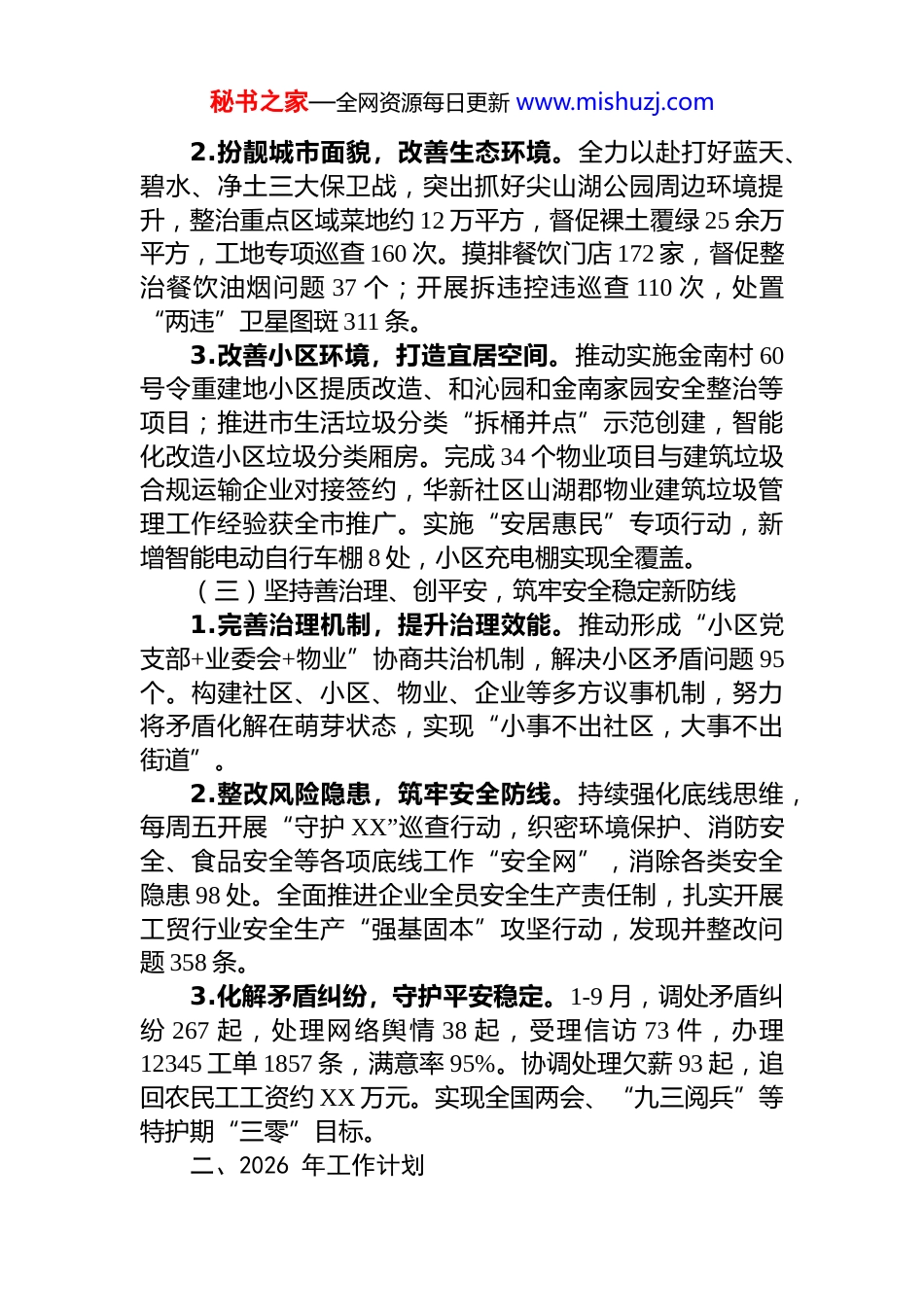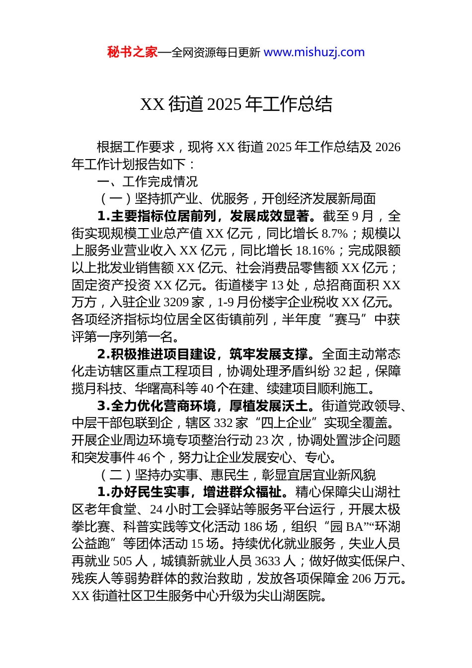 秘书之家—全网资源每日更新 www.mishuzj.comXX 街道 2025 年工作总结根据工作要求,现将 XX 街道 2025 年工作总结及 2026年工作计划报告如下:一、工作完成情况(一)坚持抓产业、优服务,开创经济发展新局面1.主要指标位居前列,发展成效显著。截至 9 月,全街实现规模工业总产值 XX 亿元,同比增长 8.7%;规模以上服务业营业收入 XX 亿元,同比增长 18.16%;完成限额以上批发业销售额 XX 亿元、社会消费品零售额 XX 亿元;固定资产投资 XX 亿元。街道楼宇 13 处,总招商面积 XX万方,入驻企业 3209 家,1-9 月份楼宇企业税收 XX 亿元。各项经济指标均位居全区街镇前列,半年度“赛马”中获评第一序列第一名。2.积极推进项目建设,筑牢发展支撑。全面主动常态化走访辖区重点工程项目,协调处理矛盾纠纷 32 起,保障揽月科技、华曙高科等 40 个在建、续建项目顺利施工。3.全力优化营商环境,厚植发展沃土。街道党政领导、中层干部包联到企,辖区 332 家“四上企业”实现全覆盖。开展企业周边环境专项整治行动 23 次,协调处置涉企问题和突发事件 46 个,努力让企业发展安心、专心。(二)坚持办实事、惠民生,彰显宜居宜业新风貌1.办好民生实事,增进群众福祉。精心保障尖山湖社区老年食堂、24 小时工会驿站等服务平台运行,开展太极拳比赛、科普实践等文化活动 186 场,组织“园 BA”“环湖公益跑”等团体活动 15 场。持续优化就业服务,失业人员再就业 505 人,城镇新就业人员 3633 人;做好做实低保户、残疾人等弱势群体的救治救助,发放各项保障金 206 万元。XX 街道社区卫生服务中心升级为尖山湖医院。秘书之家—全网资源每日更新 www.mishuzj.com2.扮靓城市面貌,改善生态环境。全力以赴打好蓝天、碧水、净土三大保卫战,突出抓好尖山湖公园周边环境提升,整治重点区域菜地约 12 万平方,督促裸土覆绿 25 余万平方,工地专项巡查 160 次。摸排餐饮门店 172 家,督促整治餐饮油烟问题 37 个;开展拆违控违巡查 110 次,处置“两违”卫星图斑 311 条。3.改善小区环境,打造宜居空间。推动实施金南村 60号令重建地小区提质改造、和沁园和金南家园安全整治等项目;推进市生活垃圾分类“拆桶并点”示范创建,智能化改造小区垃圾分类厢房。完成 34 个物业项目与建筑垃圾合规运输企业对接签约,华新社区山湖郡物业建筑垃圾管理工作经验获全市推广。实施“安居惠民”专项行动,新增智能电动自行车棚 8 处,小区充电棚实现全覆盖。(三)坚持善治理、创平安,筑牢安全稳定新防线1.完善治理机制,提升治理效能。推动形成“小区党支部+业委会+物业”协商共治机制,解决小区矛盾问题 95个。构建社区、小区、物业、企业等多方议事机制,努力将矛盾化解在萌芽状态,实现“小事不出社区,大事不出街道”。2.整改风险隐患,筑牢安全防线。持续强化底线思维,每周五开展“守护 XX”巡查行动,织密环境保护、消防安全、食品安全等各项底线工作“安全网”,消除各类安全隐患 98 处。全面推进企业全员安全生产责任制,扎实开展工贸行业安全生产“强基固本”攻坚行动,发现并整改问题 358 条。3.化解矛盾纠纷,守护平安稳定。1-9 月,调处矛盾纠纷 267 起,处理网络舆情 38 起,受理信访 73 件,办理12345 工单 1857 条,满意率 95%。协调处理欠薪 93 起,追回农民工工资约 XX 万元。实现全国两会、“九三阅兵”等特护期“三零”目标。二、2026 年工作计划秘书之家—全网资源每日更新 www.mishuzj.com(一)聚焦“一个核心”,推进党的建设1.深化理论武装。发挥街道工委党校主阵地作用,持续深入开展习近平新时代中国特色社会主义思想教育培训。2.夯实基层党建。组织召开区域化党建联席会议,制定需求、资源、项目“三张清单”;保障新兴领域党组织“两个覆盖”有成效、出实绩。3.强化人才支撑。认真做好“湘江英才”申报宣传及初审工作;组织开展人才服务活动,营造辖区创新创业、成长成才氛围。四是推进清廉建设。巩固深化党纪学习教育成果,锲而不舍落实中央八项规定精神,做好群众身边不...