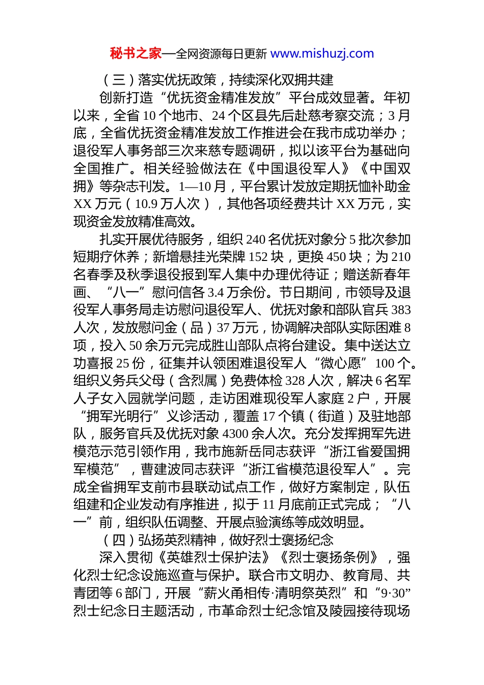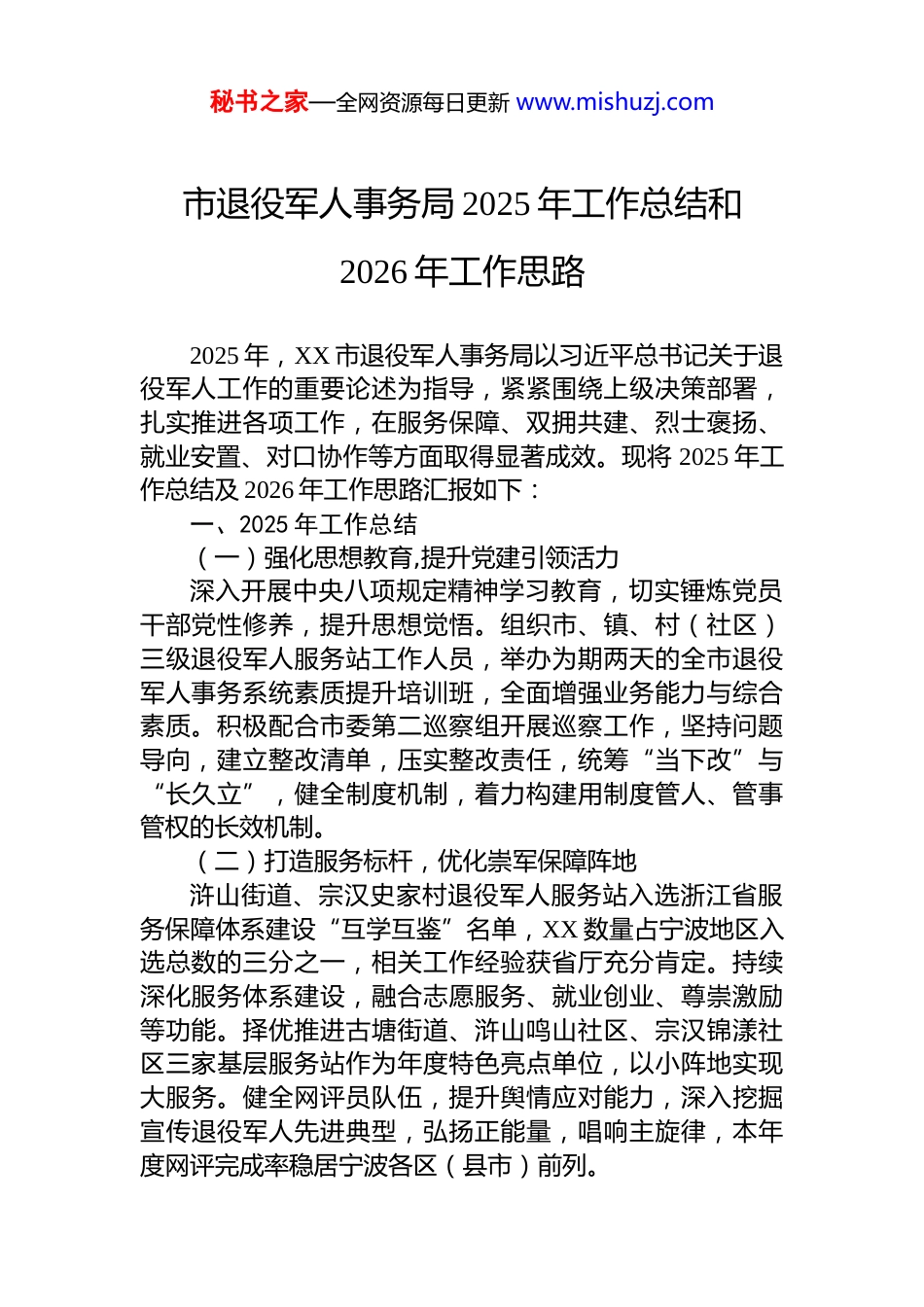 秘书之家—全网资源每日更新 www.mishuzj.com市退役军人事务局 2025 年工作总结和2026 年工作思路2025 年,XX 市退役军人事务局以习近平总书记关于退役军人工作的重要论述为指导,紧紧围绕上级决策部署,扎实推进各项工作,在服务保障、双拥共建、烈士褒扬、就业安置、对口协作等方面取得显著成效。现将 2025 年工作总结及 2026 年工作思路汇报如下:一、2025 年工作总结(一)强化思想教育,提升党建引领活力深入开展中央八项规定精神学习教育,切实锤炼党员干部党性修养,提升思想觉悟。组织市、镇、村(社区)三级退役军人服务站工作人员,举办为期两天的全市退役军人事务系统素质提升培训班,全面增强业务能力与综合素质。积极配合市委第二巡察组开展巡察工作,坚持问题导向,建立整改清单,压实整改责任,统筹“当下改”与“长久立”,健全制度机制,着力构建用制度管人、管事管权的长效机制。(二)打造服务标杆,优化崇军保障阵地浒山街道、宗汉史家村退役军人服务站入选浙江省服务保障体系建设“互学互鉴”名单,XX 数量占宁波地区入选总数的三分之一,相关工作经验获省厅充分肯定。持续深化服务体系建设,融合志愿服务、就业创业、尊崇激励等功能。择优推进古塘街道、浒山鸣山社区、宗汉锦漾社区三家基层服务站作为年度特色亮点单位,以小阵地实现大服务。健全网评员队伍,提升舆情应对能力,深入挖掘宣传退役军人先进典型,弘扬正能量,唱响主旋律,本年度网评完成率稳居宁波各区(县市)前列。秘书之家—全网资源每日更新 www.mishuzj.com(三)落实优抚政策,持续深化双拥共建创新打造“优抚资金精准发放”平台成效显著。年初以来,全省 10 个地市、24 个区县先后赴慈考察交流;3 月底,全省优抚资金精准发放工作推进会在我市成功举办;退役军人事务部三次来慈专题调研,拟以该平台为基础向全国推广。相关经验做法在《中国退役军人》《中国双拥》等杂志刊发。1—10 月,平台累计发放定期抚恤补助金XX 万元(10.9 万人次),其他各项经费共计 XX 万元,实现资金发放精准高效。扎实开展优待服务,组织 240 名优抚对象分 5 批次参加短期疗休养;新增悬挂光荣牌 152 块,更换 450 块;为 210名春季及秋季退役报到军人集中办理优待证;赠送新春年画、“八一”慰问信各 3.4 万余份。节日期间,市领导及退役军人事务局走访慰问退役军人、优抚对象和部队官兵 383人次,发放慰问金(品)37 万元,协调解决部队实际困难 8项,投入 50 余万元完成胜山部队点将台建设。集中送达立功喜报 25 份,征集并认领困难退役军人“微心愿”100 个。组织义务兵父母(含烈属)免费体检 328 人次,解决 6 名军人子女入园就学问题,走访困难现役军人家庭 2 户,开展“拥军光明行”义诊活动,覆盖 17 个镇(街道)及驻地部队,服务官兵及优抚对象 4300 余人次。充分发挥拥军先进模范示范引领作用,我市施新岳同志获评“浙江省爱国拥军模范”,曹建波同志获评“浙江省模范退役军人”。完成全省拥军支前市县联动试点工作,做好方案制定,队伍组建和企业发动有序推进,拟于 11 月底前正式完成;“八一”前,组织队伍调整、开展点验演练等成效明显。(四)弘扬英烈精神,做好烈士褒扬纪念深入贯彻《英雄烈士保护法》《烈士褒扬条例》,强化烈士纪念设施巡查与保护。联合市文明办、教育局、共青团等 6 部门,开展“薪火甬相传·清明祭英烈”和“9·30”烈士纪念日主题活动,市革命烈士纪念馆及陵园接待现场秘书之家—全网资源每日更新 www.mishuzj.com祭扫 600 余批次、2 万余人次,网上祭扫 6500 余人次,代祭烈士墓 35 个。围绕抗日战争胜利 80 周年,组织老兵宣讲团在 XX 革命烈士纪念馆开展红色宣讲,举办“铁血丹心翰墨铸魂”书法展及“红色九月”宣传活动,惠及学生群众 1.23 万余人。选派讲解员参加宁波市红色宣讲展演并获优秀奖。联合各镇(街道)开展上半年设施巡查,完成革命烈士陵园、龙山镇、逍林镇部分散葬烈士纪念设施修缮提质。革命烈士陵园改造项目稳步推进,已完成立项审批土地确权、评估及招标工作,拟于 11 ...