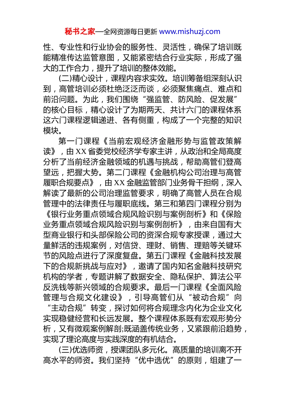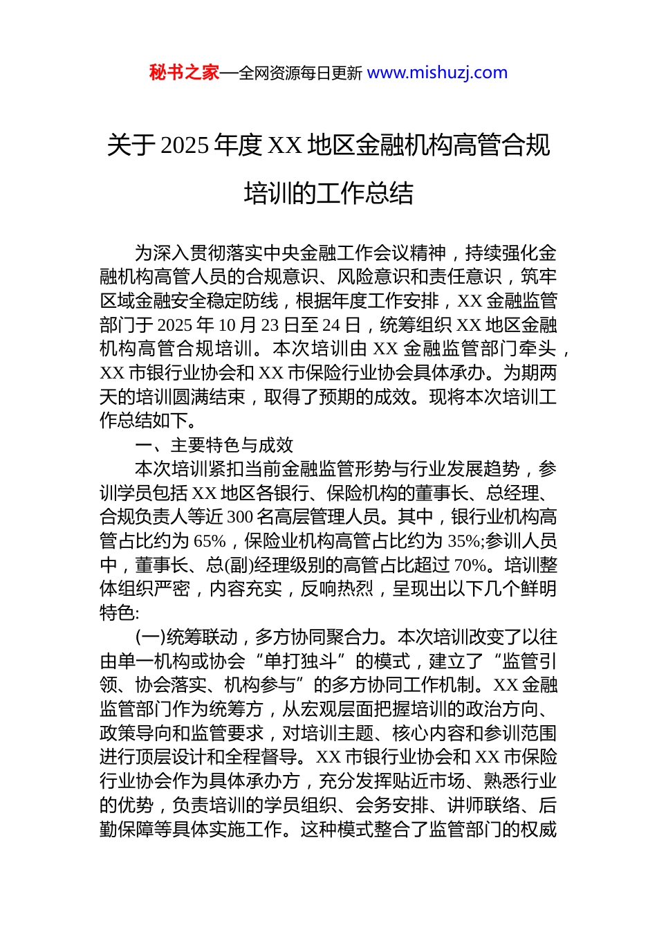 秘书之家—全网资源每日更新 www.mishuzj.com关于 2025 年度 XX 地区金融机构高管合规培训的工作总结为深入贯彻落实中央金融工作会议精神,持续强化金融机构高管人员的合规意识、风险意识和责任意识,筑牢区域金融安全稳定防线,根据年度工作安排,XX 金融监管部门于 2025 年 10 月 23 日至 24 日,统筹组织 XX 地区金融机构高管合规培训。本次培训由 XX 金融监管部门牵头,XX 市银行业协会和 XX 市保险行业协会具体承办。为期两天的培训圆满结束,取得了预期的成效。现将本次培训工作总结如下。一、主要特色与成效本次培训紧扣当前金融监管形势与行业发展趋势,参训学员包括 XX 地区各银行、保险机构的董事长、总经理、合规负责人等近 300 名高层管理人员。其中,银行业机构高管占比约为 65%,保险业机构高管占比约为 35%;参训人员中,董事长、总(副)经理级别的高管占比超过 70%。培训整体组织严密,内容充实,反响热烈,呈现出以下几个鲜明特色:(一)统筹联动,多方协同聚合力。本次培训改变了以往由单一机构或协会“单打独斗”的模式,建立了“监管引领、协会落实、机构参与”的多方协同工作机制。XX 金融监管部门作为统筹方,从宏观层面把握培训的政治方向、政策导向和监管要求,对培训主题、核心内容和参训范围进行顶层设计和全程督导。XX 市银行业协会和 XX 市保险行业协会作为具体承办方,充分发挥贴近市场、熟悉行业的优势,负责培训的学员组织、会务安排、讲师联络、后勤保障等具体实施工作。这种模式整合了监管部门的权威秘书之家—全网资源每日更新 www.mishuzj.com性、专业性和行业协会的服务性、灵活性,确保了培训既能精准传达监管意图,又能紧密结合行业实际,形成了强大的工作合力,提升了培训的整体效能。(二)精心设计,课程内容求实效。培训筹备组深刻认识到,高管培训必须杜绝泛泛而谈,必须聚焦痛点、难点和前沿问题。为此,我们围绕“强监管、防风险、促发展”的核心目标,精心设计了为期两天、共计六门的课程体系这六门课程逻辑递进、各有侧重,构成了一个完整的知识模块。第一门课程《当前宏观经济金融形势与监管政策解读》,由 XX 省委党校经济学专家主讲,从政治和全局高度分析了当前经济金融领域的机遇与挑战,帮助高管们登高望远,把握大势。第二门课程《金融机构公司治理与高管履职合规要点》,由 XX 金融监管部门业务骨干担纲,深入解读了最新的公司治理监管要求,明确了高管人员在合规管理中的法律责任与履职底线。第三和第四门课程分别为《银行业务重点领域合规风险识别与案例剖析》和《保险业务重点领域合规风险识别与案例剖析》,由来自国有大型商业银行和头部保险公司的资深合规专家授课,通过大量鲜活的违规案例,对信贷、理财、销售、理赔等关键环节的风险点进行了深度复盘。第五门课程《金融科技发展下的合规新挑战与应对》,邀请了国内知名金融科技研究机构的学者,专题讲解了数据安全、隐私保护、算法公平反洗钱等新兴领域的合规要求。最后一门课程《全面风险管理与合规文化建设》,引导高管们从“被动合规”向“主动合规”转变,探讨如何将合规理念内化为企业文化实现稳健经营和长远发展。整个课程体系既有宏观形势分析,又有微观案例解剖;既涵盖传统业务,又紧跟前沿趋势,实现了理论高度与实践深度的有机结合。(三)优选师资,授课团队多元化。高质量的培训离不开高水平的师资。我们坚持“优中选优”的原则,组建了一秘书之家—全网资源每日更新 www.mishuzj.com支由党校专家、监管骨干和行业讲师构成的“三位一体”多元化授课团队。党校专家站位高、视野宽,为培训提供了坚实的理论基础和宏观背景。XX 金融监管部门的业务骨干长期处于监管一线,对政策法规的理解最为深刻、权威他们的讲解能够帮助高管们准确把握监管尺度和政策边界行业讲师则来自市场主体,他们带来的案例和经验最接地气,能够引发学员的强烈共鸣,其分享的风险处置经验具有极强的现实指导意义。这种多元化的师资结构,实现了“理论、监管、实践”三种视角的互补与交融,确保了培训内容的权威性、针对性和实用性,受到了学员们的...