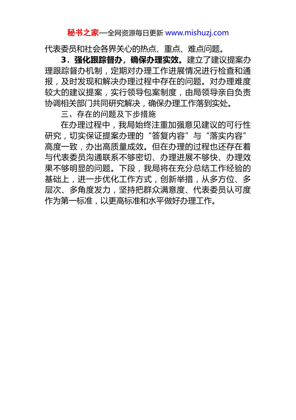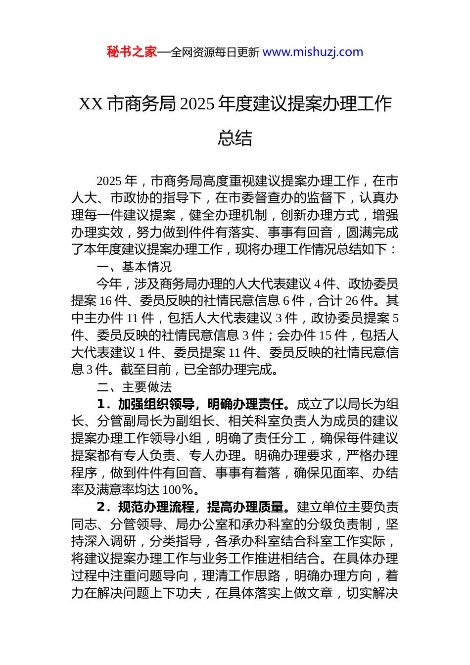 秘书之家—全网资源每日更新 www.mishuzj.comXX 市商务局 2025 年度建议提案办理工作总结2025 年,市商务局高度重视建议提案办理工作,在市人大、市政协的指导下,在市委督查办的监督下,认真办理每一件建议提案,健全办理机制,创新办理方式,增强办理实效,努力做到件件有落实、事事有回音,圆满完成了本年度建议提案办理工作,现将办理工作情况总结如下:一、基本情况今年,涉及商务局办理的人大代表建议 4 件、政协委员提案 16 件、委员反映的社情民意信息 6 件,合计 26 件。其中主办件 11 件,包括人大代表建议 3 件,政协委员提案 5件、委员反映的社情民意信息 3 件;会办件 15 件,包括人大代表建议 1 件、委员提案 11 件、委员反映的社情民意信息 3 件。截至目前,已全部办理完成。二、主要做法1.加强组织领导,明确办理责任。成立了以局长为组长、分管副局长为副组长、相关科室负责人为成员的建议提案办理工作领导小组,明确了责任分工,确保每件建议提案都有专人负责、专人办理。明确办理要求,严格办理程序,做到件件有回音、事事有着落,确保见面率、办结率及满意率均达 100%。2.规范办理流程,提高办理质量。建立单位主要负责同志、分管领导、局办公室和承办科室的分级负责制,坚持深入调研,分类指导,各承办科室结合科室工作实际,将建议提案办理工作与业务工作推进相结合。在具体办理过程中注重问题导向,理清工作思路,明确办理方向,着力在解决问题上下功夫,在具体落实上做文章,切实解决秘书之家—全网资源每日更新 www.mishuzj.com代表委员和社会各界关心的热点、重点、难点问题。3.强化跟踪督办,确保办理实效。建立了建议提案办理跟踪督办机制,定期对办理工作进展情况进行检查和通报,及时发现和解决办理过程中存在的问题。对办理难度较大的建议提案,实行领导包案制度,由局领导亲自负责协调相关部门共同研究解决,确保办理工作落到实处。三、存在的问题及下步措施在办理过程中,我局始终注重加强意见建议的可行性研究,切实保证提案办理的“答复内容”与“落实内容”高度一致,办出高质量成效。但在办理的过程也还存在着与代表委员沟通联系不够密切、办理进展不够快、办理效果不够明显的问题。下段,我局将在充分总结工作经验的基础上,进一步优化工作方式,创新举措,从多方位、多层次、多角度发力,坚持把群众满意度、代表委员认可度作为第一标准,以更高标准和水平做好办理工作。