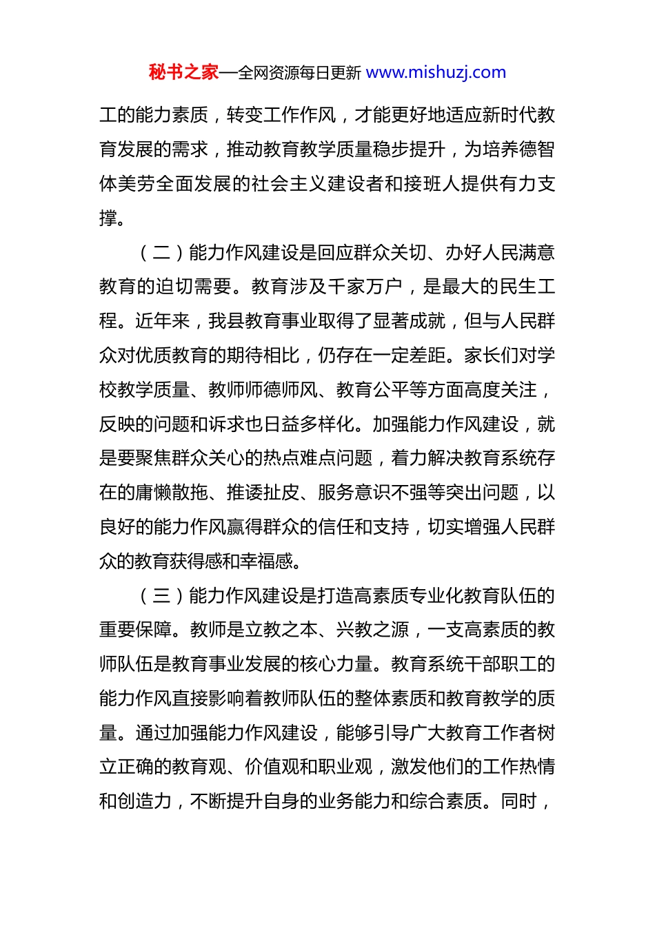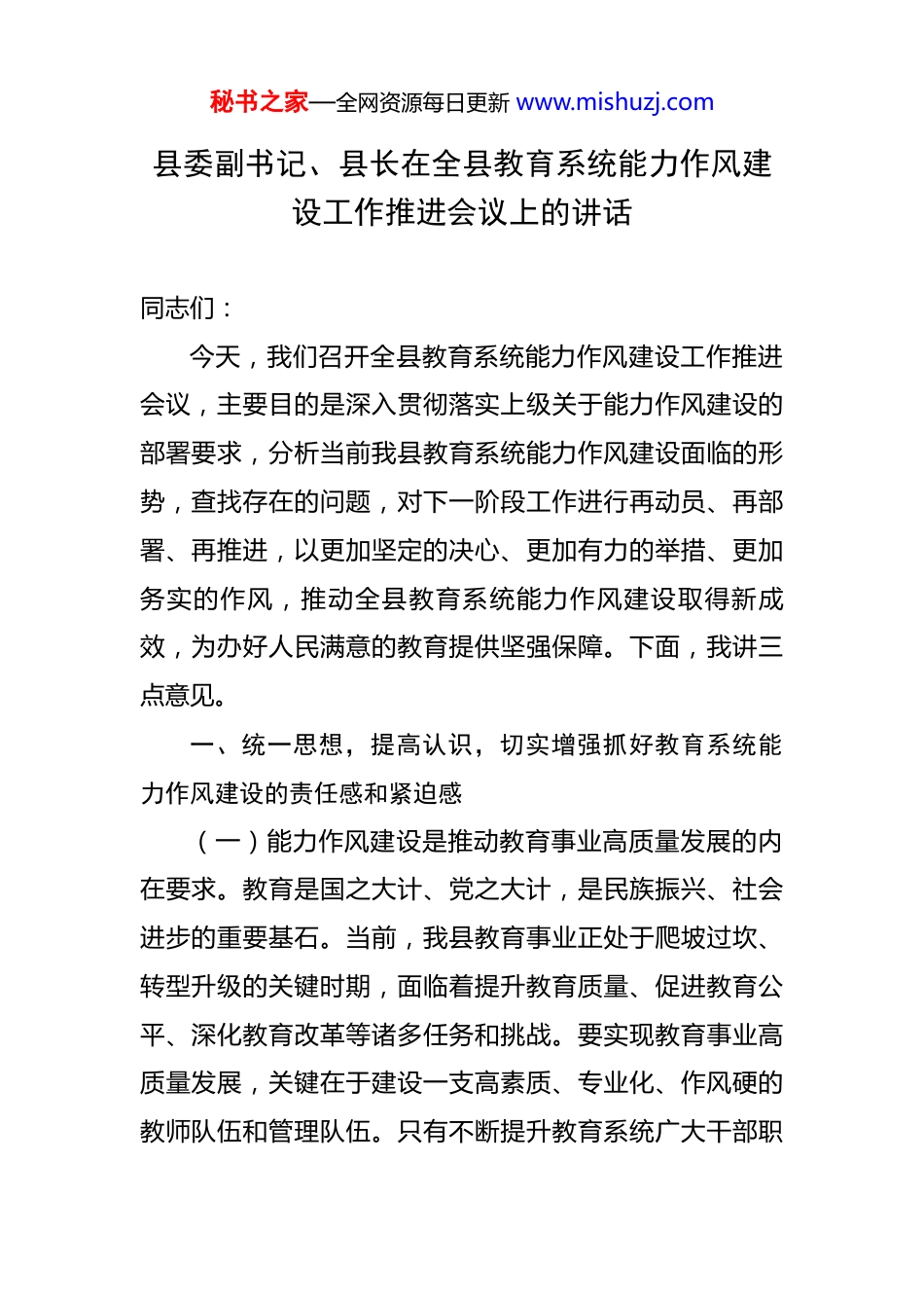 秘书之家—全网资源每日更新 www.mishuzj.com县委副书记、县长在全县教育系统能力作风建设工作推进会议上的讲话 同志们:今天,我们召开全县教育系统能力作风建设工作推进会议,主要目的是深入贯彻落实上级关于能力作风建设的部署要求,分析当前我县教育系统能力作风建设面临的形势,查找存在的问题,对下一阶段工作进行再动员、再部署、再推进,以更加坚定的决心、更加有力的举措、更加务实的作风,推动全县教育系统能力作风建设取得新成效,为办好人民满意的教育提供坚强保障。下面,我讲三点意见。一、统一思想,提高认识,切实增强抓好教育系统能力作风建设的责任感和紧迫感(一)能力作风建设是推动教育事业高质量发展的内在要求。教育是国之大计、党之大计,是民族振兴、社会进步的重要基石。当前,我县教育事业正处于爬坡过坎、转型升级的关键时期,面临着提升教育质量、促进教育公平、深化教育改革等诸多任务和挑战。要实现教育事业高质量发展,关键在于建设一支高素质、专业化、作风硬的教师队伍和管理队伍。只有不断提升教育系统广大干部职秘书之家—全网资源每日更新 www.mishuzj.com工的能力素质,转变工作作风,才能更好地适应新时代教育发展的需求,推动教育教学质量稳步提升,为培养德智体美劳全面发展的社会主义建设者和接班人提供有力支撑。(二)能力作风建设是回应群众关切、办好人民满意教育的迫切需要。教育涉及千家万户,是最大的民生工程。近年来,我县教育事业取得了显著成就,但与人民群众对优质教育的期待相比,仍存在一定差距。家长们对学校教学质量、教师师德师风、教育公平等方面高度关注,反映的问题和诉求也日益多样化。加强能力作风建设,就是要聚焦群众关心的热点难点问题,着力解决教育系统存在的庸懒散拖、推诿扯皮、服务意识不强等突出问题,以良好的能力作风赢得群众的信任和支持,切实增强人民群众的教育获得感和幸福感。(三)能力作风建设是打造高素质专业化教育队伍的重要保障。教师是立教之本、兴教之源,一支高素质的教师队伍是教育事业发展的核心力量。教育系统干部职工的能力作风直接影响着教师队伍的整体素质和教育教学的质量。通过加强能力作风建设,能够引导广大教育工作者树立正确的教育观、价值观和职业观,激发他们的工作热情和创造力,不断提升自身的业务能力和综合素质。同时,秘书之家—全网资源每日更新 www.mishuzj.com良好的作风能够营造风清气正的教育生态,吸引更多优秀人才投身教育事业,为教育事业的持续发展注入源源不断的动力。(四)当前我县教育系统能力作风建设存在的问题不容忽视。虽然我们在能力作风建设方面取得了一定成绩,但也必须清醒地认识到,与新时代教育发展的要求和人民群众的期望相比,还存在一些差距和不足。一是部分干部职工思想认识不够深刻,对能力作风建设的重要性、紧迫性认识不足,存在敷衍了事、走过场的现象。二是能力素质有待提升,一些教师教学方法陈旧,创新意识不强,难以适应新课程改革和素质教育的要求;部分管理人员缺乏科学的管理理念和方法,管理水平不高。三是工作作风不够扎实,存在形式主义、官僚主义问题,工作落实不到位,效率低下;个别教师师德师风失范,存在违规补课、收受礼品礼金等行为,损害了教师队伍的形象。这些问题严重影响了教育系统的整体形象和教育事业的发展,必须引起我们的高度重视,切实加以解决。二、突出重点,精准发力,扎实推进教育系统能力作风建设各项任务落实(一)聚焦能力提升,打造高素质专业化教师队伍。建立健全教师培训体系,制定科学合理的培训计划,加大秘书之家—全网资源每日更新 www.mishuzj.com培训投入力度。开展针对性强、实效性高的培训活动,包括新课程标准培训、教学方法培训、信息技术应用培训等,帮助教师更新教育观念,提升业务能力。鼓励教师参加学历提升教育和各类学术交流活动,拓宽视野,增长见识。定期组织开展教学能手评选、优质课竞赛、教学设计大赛等活动,为教师搭建展示自我、相互学习的平台。通过竞赛活动,激发教师的教学积极性和创造性,促进教师之间的交流与合作,推动教学水平的整体提升。对在竞赛中表现...