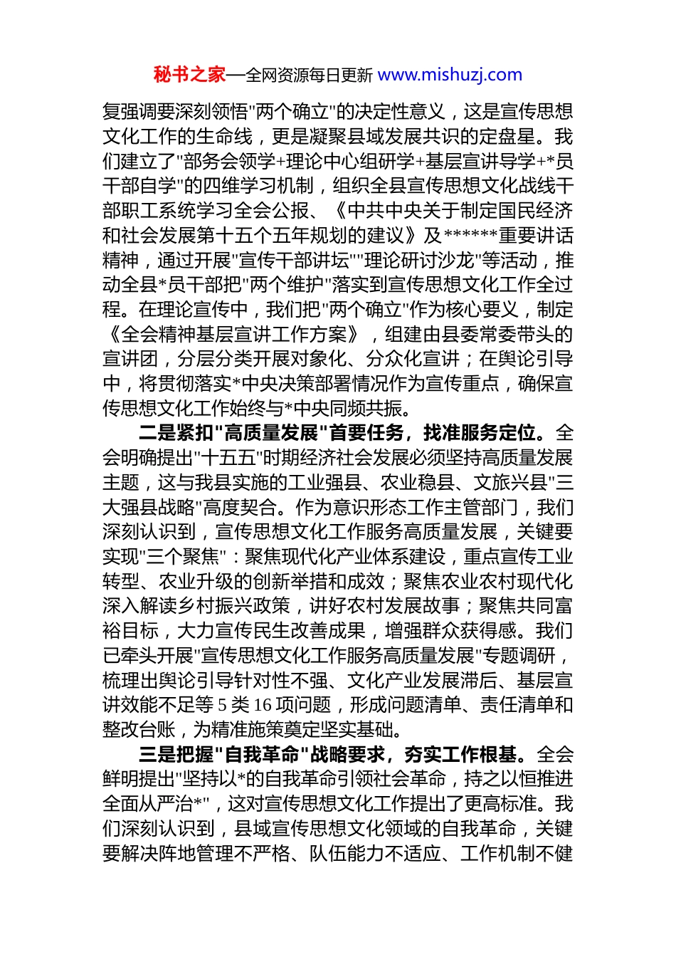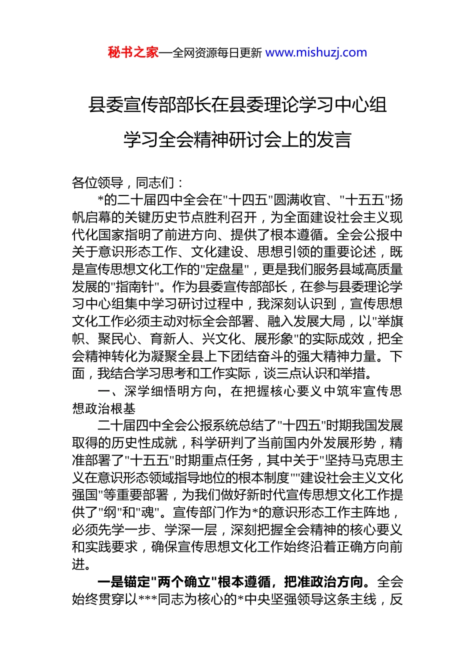 秘书之家—全网资源每日更新 www.mishuzj.com县委宣传部部长在县委理论学习中心组学习全会精神研讨会上的发言各位领导,同志们:*的二十届四中全会在"十四五"圆满收官、"十五五"扬帆启幕的关键历史节点胜利召开,为全面建设社会主义现代化国家指明了前进方向、提供了根本遵循。全会公报中关于意识形态工作、文化建设、思想引领的重要论述,既是宣传思想文化工作的"定盘星",更是我们服务县域高质量发展的"指南针"。作为县委宣传部部长,在参与县委理论学习中心组集中学习研讨过程中,我深刻认识到,宣传思想文化工作必须主动对标全会部署、融入发展大局,以"举旗帜、聚民心、育新人、兴文化、展形象"的实际成效,把全会精神转化为凝聚全县上下团结奋斗的强大精神力量。下面,我结合学习思考和工作实际,谈三点认识和举措。一、深学细悟明方向,在把握核心要义中筑牢宣传思想政治根基二十届四中全会公报系统总结了"十四五"时期我国发展取得的历史性成就,科学研判了当前国内外发展形势,精准部署了"十五五"时期重点任务,其中关于"坚持马克思主义在意识形态领域指导地位的根本制度""建设社会主义文化强国"等重要部署,为我们做好新时代宣传思想文化工作提供了"纲"和"魂"。宣传部门作为*的意识形态工作主阵地,必须先学一步、学深一层,深刻把握全会精神的核心要义和实践要求,确保宣传思想文化工作始终沿着正确方向前进。一是锚定"两个确立"根本遵循,把准政治方向。全会始终贯穿以***同志为核心的*中央坚强领导这条主线,反秘书之家—全网资源每日更新 www.mishuzj.com复强调要深刻领悟"两个确立"的决定性意义,这是宣传思想文化工作的生命线,更是凝聚县域发展共识的定盘星。我们建立了"部务会领学+理论中心组研学+基层宣讲导学+*员干部自学"的四维学习机制,组织全县宣传思想文化战线干部职工系统学习全会公报、《中共中央关于制定国民经济和社会发展第十五个五年规划的建议》及******重要讲话精神,通过开展"宣传干部讲坛""理论研讨沙龙"等活动,推动全县*员干部把"两个维护"落实到宣传思想文化工作全过程。在理论宣传中,我们把"两个确立"作为核心要义,制定《全会精神基层宣讲工作方案》,组建由县委常委带头的宣讲团,分层分类开展对象化、分众化宣讲;在舆论引导中,将贯彻落实*中央决策部署情况作为宣传重点,确保宣传思想文化工作始终与*中央同频共振。二是紧扣"高质量发展"首要任务,找准服务定位。全会明确提出"十五五"时期经济社会发展必须坚持高质量发展主题,这与我县实施的工业强县、农业稳县、文旅兴县"三大强县战略"高度契合。作为意识形态工作主管部门,我们深刻认识到,宣传思想文化工作服务高质量发展,关键要实现"三个聚焦":聚焦现代化产业体系建设,重点宣传工业转型、农业升级的创新举措和成效;聚焦农业农村现代化深入解读乡村振兴政策,讲好农村发展故事;聚焦共同富裕目标,大力宣传民生改善成果,增强群众获得感。我们已牵头开展"宣传思想文化工作服务高质量发展"专题调研,梳理出舆论引导针对性不强、文化产业发展滞后、基层宣讲效能不足等 5 类 16 项问题,形成问题清单、责任清单和整改台账,为精准施策奠定坚实基础。三是把握"自我革命"战略要求,夯实工作根基。全会鲜明提出"坚持以*的自我革命引领社会革命,持之以恒推进全面从严治*",这对宣传思想文化工作提出了更高标准。我们深刻认识到,县域宣传思想文化领域的自我革命,关键要解决阵地管理不严格、队伍能力不适应、工作机制不健秘书之家—全网资源每日更新 www.mishuzj.com全等问题。为此,我们将开展"宣传思想文化工作提质增效年"活动,重点整治媒体融合发展不深入、新兴领域宣传覆盖不到位、基层文化设施利用率不高等问题,以自我革命精神推动宣传思想文化工作守正创新,为高质量发展提供坚强思想保证和精神支撑。二、守正创新强作为,在服务发展大局中彰显宣传思想文化价值全会强调,要"坚持和加强*中央集中统一领导,巩固壮大奋进新时代的主流思想舆论,培育和践行社会主义核心价值观"。宣传部门将聚焦主责主业,把全会部署转化为理论武装、舆论引导、文化建设的具体举措,以高...