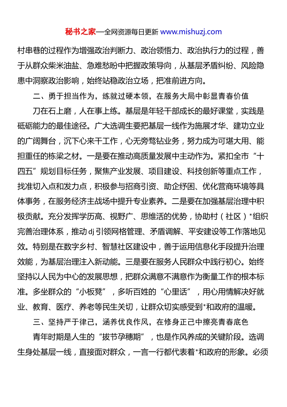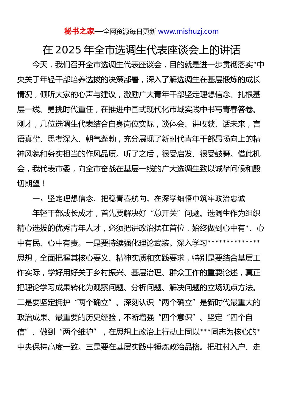 秘书之家—全网资源每日更新 www.mishuzj.com在 2025 年全市选调生代表座谈会上的讲话今天,我们召开全市选调生代表座谈会,目的就是进一步贯彻落实*中央关于年轻干部培养选拔的决策部署,深入了解选调生在基层锻炼的成长情况,倾听大家的心声与建议,激励广大青年干部坚定理想信念、扎根基层一线、勇挑时代重任,在推进中国式现代化市域实践中书写青春答卷。刚才,几位选调生代表结合自身岗位实际,谈体会、讲收获、话未来,言语真挚、思考深入、朝气蓬勃,充分展现了新时代青年干部昂扬向上的精神风貌和务实担当的作风品质。听了之后,很受启发、很受鼓舞。借此机会,我代表市委,向全市奋战在基层一线的广大选调生致以诚挚问候和殷切期望!一、坚定理想信念,把稳青春航向,在深学细悟中筑牢政治忠诚年轻干部成长成才,首先要解决好“总开关”问题。选调生作为组织精心选拔的优秀青年人才,必须把讲政治摆在首位,始终做到心中有*、心中有民、心中有责。一是要持续强化理论武装。深入学习**************思想,全面把握其核心要义、精神实质和实践要求,特别是要结合基层工作实际,学好用好关于乡村振兴、基层治理、群众工作的重要论述,真正把理论学习成果转化为观察问题、分析问题、解决问题的立场观点方法。二是要坚定拥护“两个确立”。深刻认识“两个确立”是新时代最重大的政治成果、最重要的历史经验,不断增强“四个意识”、坚定“四个自信”、做到“两个维护”,在思想上政治上行动上同以***同志为核心的*中央保持高度一致。三是要在基层实践中锤炼政治品格。把驻村入户、走秘书之家—全网资源每日更新 www.mishuzj.com村串巷的过程作为增强政治判断力、政治领悟力、政治执行力的过程,善于从群众柴米油盐、急难愁盼中把握政策导向,从基层矛盾纠纷、风险隐患中洞察政治影响,始终站稳政治立场,把准前进方向。二、勇于担当作为,练就过硬本领,在服务大局中彰显青春价值刀在石上磨,人在事上练。基层是年轻干部成长的最好课堂,实践是砥砺能力的最佳途径。广大选调生要把基层一线作为施展才华、建功立业的广阔舞台,沉下心来干工作,心无旁骛钻业务,努力成为可堪大用、能担重任的栋梁之材。一是要在推动高质量发展中主动作为。紧扣全市“十四五”规划目标任务,聚焦产业发展、项目建设、科技创新等重点工作,找准切入点和发力点,积极参与招商引资、助企纾困、优化营商环境等具体事务,在服务经济主战场中提升专业素养。二是要在加强基层治理中积极贡献。充分发挥学历高、视野广、思维活的优势,协助村(社区)*组织完善治理体系,推动 dj 引领网格管理、矛盾调解、平安建设等工作落地见效。特别是在数字乡村、智慧社区建设中,善于运用信息化手段提升治理效能,为基层治理注入新动能。三是要在服务人民群众中践行初心。始终坚持以人民为中心的发展思想,把群众满意不满意作为衡量工作的根本标准。多坐群众的“小板凳”,多听百姓的“心里话”,用心用情解决好就业、教育、医疗、养老等民生关切,让群众切实感受到*和政府的温暖。三、坚持严于律己,涵养优良作风,在修身正己中擦亮青春底色青年时期是人生的“拔节孕穗期”,也是作风养成的关键阶段。选调生身处基层一线,直接面对群众,一言一行都代表着*和政府的形象。必须秘书之家—全网资源每日更新 www.mishuzj.com时刻绷紧纪律规矩这根弦,扣好廉洁从政的“第一粒扣子”。一是要严守纪律底线。认真学习新修订的《中国共产 dj 律处分条例》,自觉遵守中央八项规定及其实施细则精神,坚决反对形式主义、官僚主义,做到心有所畏、言有所戒、行有所止。特别是在涉及惠民资金发放、项目申报审批等敏感事项上,要坚持原则、秉公办事,绝不越雷池一步。二是要弘扬务实作风。树立正确的政绩观,不搞“花架子”、不做“表面文章”,扑下身子察实情、出实招、求实效。对组织交办的任务,要雷厉风行、一抓到底;对群众反映的问题,要立说立行、及时回应,以实干赢得信任、以实绩赢得口碑。三是要保持清廉本色。注重加强家风建设,管好亲属和身边人,净化社交圈、生活圈、朋友圈。坚持艰苦奋斗、勤俭节约,反对铺张...