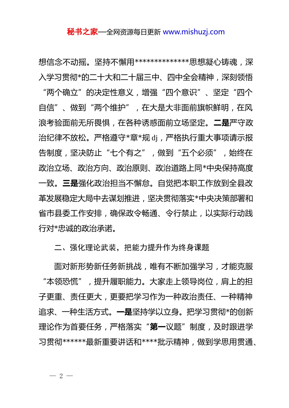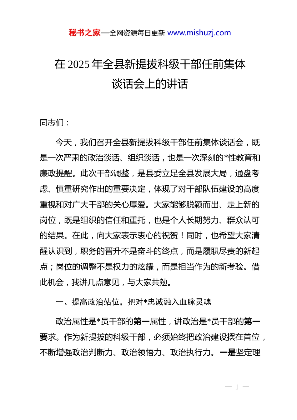 秘书之家—全网资源每日更新 www.mishuzj.com在 2025 年全县新提拔科级干部任前集体谈话会上的讲话同志们:今天,我们召开全县新提拔科级干部任前集体谈话会,既是一次严肃的政治谈话、组织谈话,也是一次深刻的*性教育和廉政提醒。此次干部调整,是县委立足全县发展大局,通盘考虑、慎重研究作出的重要决定,体现了对干部队伍建设的高度重视和对广大干部的关心厚爱。大家能够脱颖而出、走上新的岗位,既是组织的信任和重托,也是个人长期努力、群众认可的结果。在此,向大家表示衷心的祝贺!同时,也希望大家清醒认识到,职务的晋升不是奋斗的终点,而是履职尽责的新起点;岗位的调整不是权力的炫耀,而是担当作为的新考验。借此机会,我讲几点意见,与大家共勉。一、提高政治站位,把对*忠诚融入血脉灵魂政治属性是*员干部的第一属性,讲政治是*员干部的第一要求。作为新提拔的科级干部,必须始终把政治建设摆在首位,不断增强政治判断力、政治领悟力、政治执行力。一是坚定理— 1 —秘书之家—全网资源每日更新 www.mishuzj.com想信念不动摇。坚持不懈用**************思想凝心铸魂,深入学习贯彻*的二十大和二十届三中、四中全会精神,深刻领悟“两个确立”的决定性意义,增强“四个意识”、坚定“四个自信”、做到“两个维护”,在大是大非面前旗帜鲜明,在风浪考验面前无所畏惧,在各种诱惑面前立场坚定。二是严守政治纪律不放松。严格遵守*章*规 dj,严格执行重大事项请示报告制度,坚决防止“七个有之”,做到“五个必须”,始终在政治立场、政治方向、政治原则、政治道路上同*中央保持高度一致。三是强化政治担当不懈怠。自觉把本职工作放到全县改革发展稳定大局中去谋划推进,坚决贯彻落实*中央决策部署和省市县委工作安排,确保政令畅通、令行禁止,以实际行动践行对*忠诚的政治承诺。二、强化理论武装,把能力提升作为终身课题面对新形势新任务新挑战,唯有不断加强学习,才能克服“本领恐慌”,提升履职能力。大家走上领导岗位,肩上的担子更重、责任更大,更要把学习作为一种政治责任、一种精神追求、一种生活方式。一是坚持学以立身。把学习贯彻*的创新理论作为首要任务,严格落实“第一议题”制度,及时跟进学习贯彻******最新重要讲话和****批示精神,做到学思用贯通、— 2 —秘书之家—全网资源每日更新 www.mishuzj.com知信行统一。二是坚持学以增智。紧紧围绕推动高质量发展、乡村振兴、基层治理、民生保障等重点工作,加强对经济、法律、科技、管理等方面知识的学习,不断优化知识结构,提升专业素养。三是坚持学以致用。弘扬理论联系实际的优良学风,把学习成果转化为谋划工作的思路、破解难题的办法、推动落实的举措,在实践锻炼中增长才干、积累经验,努力成为本领域本行业的行家里手。三、勇于担当作为,把实干实绩写在基层一线干部干部,干字当头。组织选拔任用干部,看的是实绩、用的是实干。大家要珍惜岗位、珍惜机遇,以“功成不必在我”的精神境界和“功成必定有我”的历史担当,真抓实干、奋勇争先。一是聚焦中心任务抓落实。紧扣县委、县政府确定的年度重点工作任务,主动认领、细化措施、压实责任,确保各项部署落地见效。特别是在推进重点项目建设、优化营商环境、巩固拓展脱贫攻坚成果同乡村振兴有效衔接等方面,要靠前指挥、攻坚克难,切实发挥好“关键少数”的示范带动作用。二是聚焦群众关切办实事。始终坚持以人民为中心的发展思想,深入基层、深入群众,倾听民声、了解民意,着力解决群众急难愁盼问题。要把群众满意不满意作为检验工作成效的根本标— 3 —秘书之家—全网资源每日更新 www.mishuzj.com准,用心用情用力办好每一件民生实事,不断提升群众的获得感、幸福感、安全感。三是聚焦改革创新求突破。发扬敢为人先的精神,勇于打破思维定式和路径依赖,在政策允许范围内大胆探索、先行先试,努力在推动体制机制创新、提升治理效能上取得新进展。四、严守纪律底线,把清正廉洁作为立身之本廉洁自律是*员干部的立身之本、处事之基。大家走上新的领导岗位,手中掌握一定权力,面临的诱惑和考验更多,必须时刻绷紧纪律规矩...