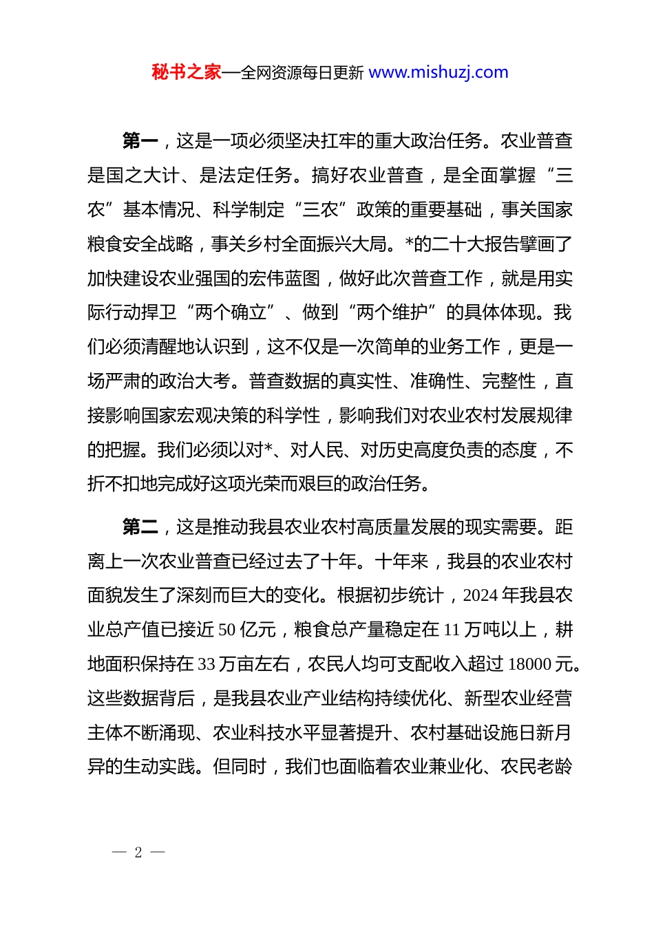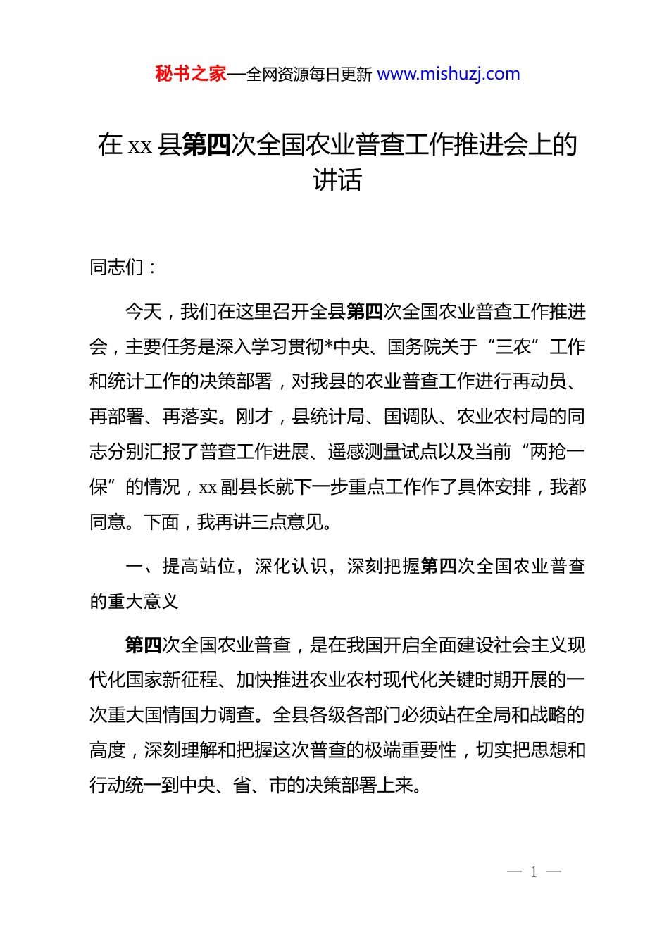 秘书之家—全网资源每日更新 www.mishuzj.com在 xx 县第四次全国农业普查工作推进会上的讲话同志们:今天,我们在这里召开全县第四次全国农业普查工作推进会,主要任务是深入学习贯彻*中央、国务院关于“三农”工作和统计工作的决策部署,对我县的农业普查工作进行再动员、再部署、再落实。刚才,县统计局、国调队、农业农村局的同志分别汇报了普查工作进展、遥感测量试点以及当前“两抢一保”的情况,xx 副县长就下一步重点工作作了具体安排,我都同意。下面,我再讲三点意见。一、提高站位,深化认识,深刻把握第四次全国农业普查的重大意义第四次全国农业普查,是在我国开启全面建设社会主义现代化国家新征程、加快推进农业农村现代化关键时期开展的一次重大国情国力调查。全县各级各部门必须站在全局和战略的高度,深刻理解和把握这次普查的极端重要性,切实把思想和行动统一到中央、省、市的决策部署上来。— 1 —秘书之家—全网资源每日更新 www.mishuzj.com第一,这是一项必须坚决扛牢的重大政治任务。农业普查是国之大计、是法定任务。搞好农业普查,是全面掌握“三农”基本情况、科学制定“三农”政策的重要基础,事关国家粮食安全战略,事关乡村全面振兴大局。*的二十大报告擘画了加快建设农业强国的宏伟蓝图,做好此次普查工作,就是用实际行动捍卫“两个确立”、做到“两个维护”的具体体现。我们必须清醒地认识到,这不仅是一次简单的业务工作,更是一场严肃的政治大考。普查数据的真实性、准确性、完整性,直接影响国家宏观决策的科学性,影响我们对农业农村发展规律的把握。我们必须以对*、对人民、对历史高度负责的态度,不折不扣地完成好这项光荣而艰巨的政治任务。第二,这是推动我县农业农村高质量发展的现实需要。距离上一次农业普查已经过去了十年。十年来,我县的农业农村面貌发生了深刻而巨大的变化。根据初步统计,2024 年我县农业总产值已接近 50 亿元,粮食总产量稳定在 11 万吨以上,耕地面积保持在 33 万亩左右,农民人均可支配收入超过 18000 元。这些数据背后,是我县农业产业结构持续优化、新型农业经营主体不断涌现、农业科技水平显著提升、农村基础设施日新月异的生动实践。但同时,我们也面临着农业兼业化、农民老龄— 2 —秘书之家—全网资源每日更新 www.mishuzj.com化、农村空心化等新情况新挑战。过去的家底已经不能完全反映今天的现实,旧的地图也无法导航未来的航程。我们迫切需要通过这次普查,精准摸清我县农业土地利用、产业发展、劳动力结构、新型经营主体、农村人居环境等方面的最新情况,为我们科学编制“十五五”时期农业农村发展规划、破解发展瓶颈、培育新质生产力、扎实推进乡村全面振兴提供最权威、最翔实的数据支撑。第三,这是检验干部队伍能力作风的“试金石”和“练兵场”。农业普查涉及范围广、参与部门多、技术要求高、工作任务重,是对我县各级领导班子组织协调能力、基层干部群众工作能力和广大普查员业务执行能力的一次全面检验。普查工作能不能做到精心组织、普查数据能不能做到真实准确、普查过程能不能得到群众支持,都直接反映出我们干部的责任担当、工作作风和能力水平。我们必须把这次普查作为提升干部队伍综合素质的实践课堂,在普查一线锻炼干部、考察干部、识别干部,以严谨细致、求真务实的工作作风,确保普查工作善始善终、善作善成,向全县人民交上一份满意的答卷。二、聚焦关键,精准发力,高标准高质量完成普查各项任务— 3 —秘书之家—全网资源每日更新 www.mishuzj.com做好第四次全国农业普查工作,任务艰巨、责任重大。我们必须严格遵循“依法普查、科学普查、为民普查、实事求是、守正创新”的总要求,紧盯关键环节,倒排工期、挂图作战,确保普查工作每一个步骤都精准到位、每一个环节都万无一失。一要坚持依法普查,牢牢守住工作底线。法治是普查工作的生命线。《中华人民共和国统计法》和《全国农业普查条例》是开展普查工作的根本遵循。各乡镇、各部门要组织普查工作人员深入学习,做到人人懂法、自觉用法、严格守法。要加大普法宣传力度,通过电视广播、官方网站、微...