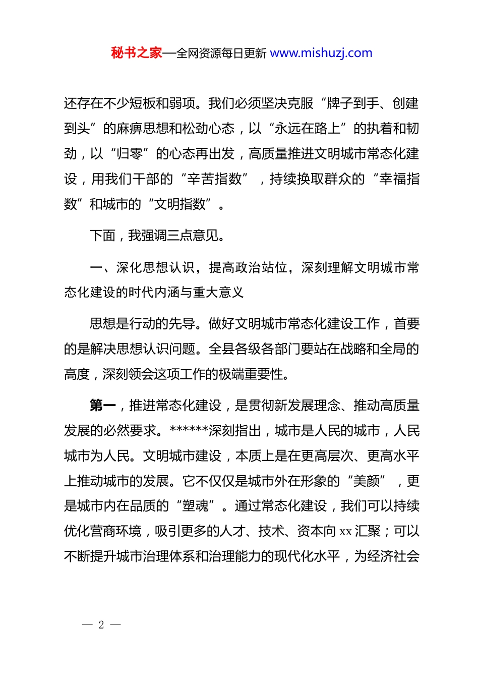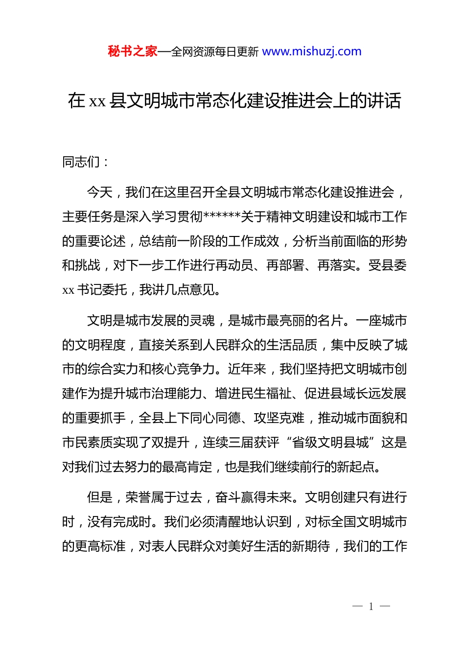 秘书之家—全网资源每日更新 www.mishuzj.com在 xx 县文明城市常态化建设推进会上的讲话同志们:今天,我们在这里召开全县文明城市常态化建设推进会,主要任务是深入学习贯彻******关于精神文明建设和城市工作的重要论述,总结前一阶段的工作成效,分析当前面临的形势和挑战,对下一步工作进行再动员、再部署、再落实。受县委xx 书记委托,我讲几点意见。文明是城市发展的灵魂,是城市最亮丽的名片。一座城市的文明程度,直接关系到人民群众的生活品质,集中反映了城市的综合实力和核心竞争力。近年来,我们坚持把文明城市创建作为提升城市治理能力、增进民生福祉、促进县域长远发展的重要抓手,全县上下同心同德、攻坚克难,推动城市面貌和市民素质实现了双提升,连续三届获评“省级文明县城”这是对我们过去努力的最高肯定,也是我们继续前行的新起点。但是,荣誉属于过去,奋斗赢得未来。文明创建只有进行时,没有完成时。我们必须清醒地认识到,对标全国文明城市的更高标准,对表人民群众对美好生活的新期待,我们的工作— 1 —秘书之家—全网资源每日更新 www.mishuzj.com还存在不少短板和弱项。我们必须坚决克服“牌子到手、创建到头”的麻痹思想和松劲心态,以“永远在路上”的执着和韧劲,以“归零”的心态再出发,高质量推进文明城市常态化建设,用我们干部的“辛苦指数”,持续换取群众的“幸福指数”和城市的“文明指数”。下面,我强调三点意见。一、深化思想认识,提高政治站位,深刻理解文明城市常态化建设的时代内涵与重大意义思想是行动的先导。做好文明城市常态化建设工作,首要的是解决思想认识问题。全县各级各部门要站在战略和全局的高度,深刻领会这项工作的极端重要性。第一,推进常态化建设,是贯彻新发展理念、推动高质量发展的必然要求。******深刻指出,城市是人民的城市,人民城市为人民。文明城市建设,本质上是在更高层次、更高水平上推动城市的发展。它不仅仅是城市外在形象的“美颜”,更是城市内在品质的“塑魂”。通过常态化建设,我们可以持续优化营商环境,吸引更多的人才、技术、资本向 xx 汇聚;可以不断提升城市治理体系和治理能力的现代化水平,为经济社会— 2 —秘书之家—全网资源每日更新 www.mishuzj.com高质量发展注入强大动能。我们打造的“xx 智慧渔业项目”,通过数字技术赋能传统产业,成功入围世界智慧城市大奖这正是城市文明与产业发展深度融合的生动体现。我们必须把文明城市建设融入经济社会发展的各方面和全过程,让文明成为 xx高质量发展的最厚重底色。第二,推进常态化建设,是顺应群众新期待、创造高品质生活的核心举措。城市工作的出发点和落脚点,都是为了让人民群众生活得更美好。随着生活水平的提高,群众对城市的要求早已超越了基本的物质需求,对优美的环境、优良的秩序、优质的服务、和谐的人际关系有了更强烈的期盼。文明城市建设,正是回应这种期盼的最直接、最有效的途径。我们要通过常态化建设,持续解决好群众反映强烈的交通拥堵、环境卫生、公共安全等“急难愁盼”问题,不断完善城市基础设施和公共服务体系,让市民在干净、整洁、有序、安全的城市环境中,拥有更多的获得感、幸福感、安全感。这既是我们的职责所在,也是民心所向。第三,推进常态化建设,是提升城市软实力、增强区域竞争力的战略选择。在区域竞争日趋激烈的今天,城市之间的比拼,早已从单纯的经济指标,扩展到包括文化、环境、社会治— 3 —秘书之家—全网资源每日更新 www.mishuzj.com理在内的综合实力较量。文明,就是一座城市最具吸引力、最有竞争力的软实力。一个文明的城市,必然是一个开放包容、充满活力、令人向往的地方。我们要通过常态化建设,持续擦亮 xx 这张“金字招牌”,不断提升 xx 的知名度、美誉度和影响力,让所有生活在 xx 的人感到自豪,让所有来到 xx 的人感到温暖,让“文明 xx”成为我们最响亮的品牌、最核心的竞争力。二、坚持问题导向,聚焦关键环节,精准破解文明城市常态化建设的瓶颈与难题肯定成绩的目的是为了增强信心,正视问题的目的是为了找准方向。当前,我县文明城市常态化...