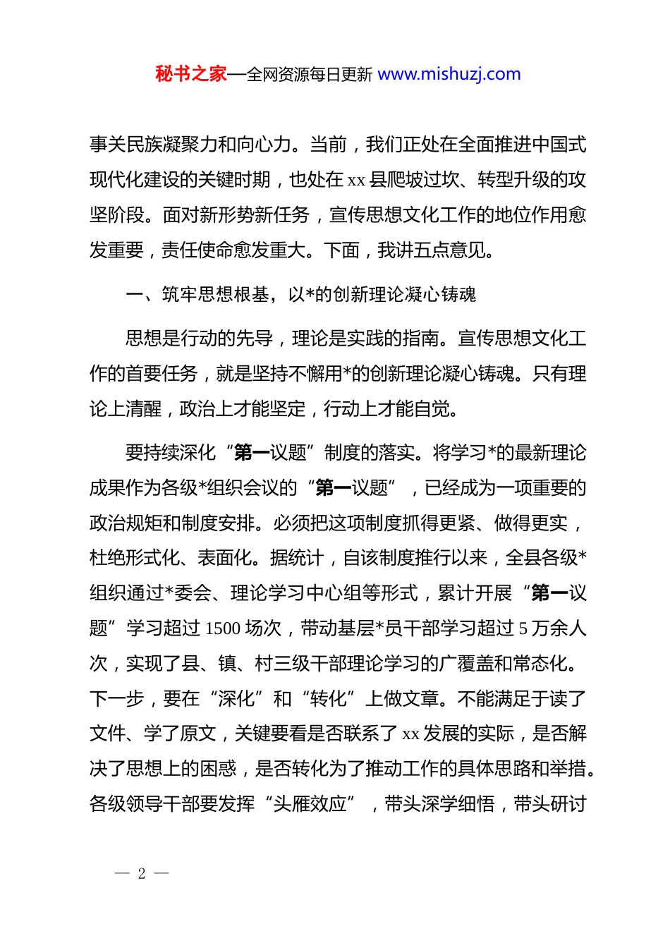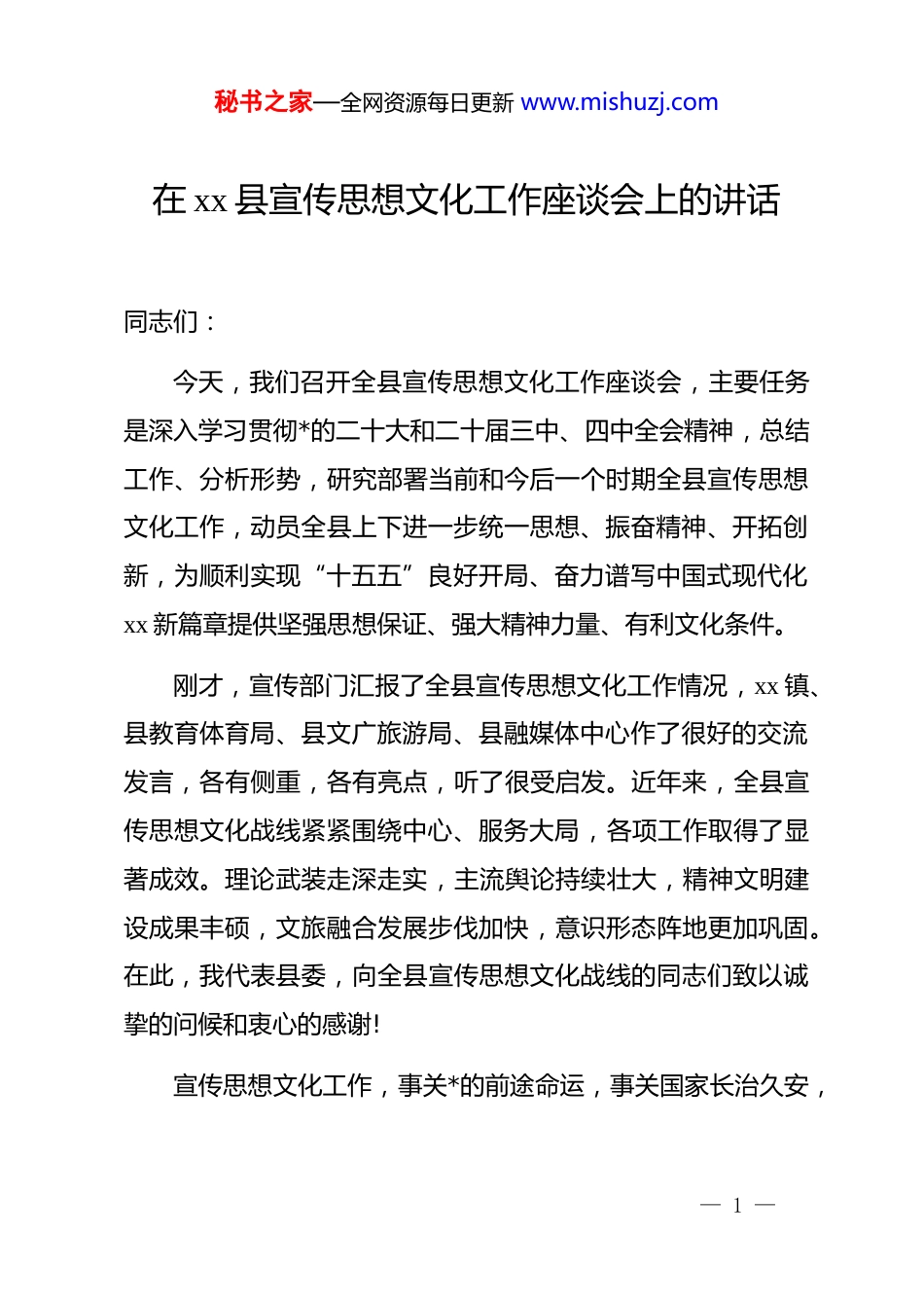 秘书之家—全网资源每日更新 www.mishuzj.com在 xx 县宣传思想文化工作座谈会上的讲话同志们:今天,我们召开全县宣传思想文化工作座谈会,主要任务是深入学习贯彻*的二十大和二十届三中、四中全会精神,总结工作、分析形势,研究部署当前和今后一个时期全县宣传思想文化工作,动员全县上下进一步统一思想、振奋精神、开拓创新,为顺利实现“十五五”良好开局、奋力谱写中国式现代化xx 新篇章提供坚强思想保证、强大精神力量、有利文化条件。刚才,宣传部门汇报了全县宣传思想文化工作情况,xx 镇、县教育体育局、县文广旅游局、县融媒体中心作了很好的交流发言,各有侧重,各有亮点,听了很受启发。近年来,全县宣传思想文化战线紧紧围绕中心、服务大局,各项工作取得了显著成效。理论武装走深走实,主流舆论持续壮大,精神文明建设成果丰硕,文旅融合发展步伐加快,意识形态阵地更加巩固。在此,我代表县委,向全县宣传思想文化战线的同志们致以诚挚的问候和衷心的感谢!宣传思想文化工作,事关*的前途命运,事关国家长治久安,— 1 —秘书之家—全网资源每日更新 www.mishuzj.com事关民族凝聚力和向心力。当前,我们正处在全面推进中国式现代化建设的关键时期,也处在 xx 县爬坡过坎、转型升级的攻坚阶段。面对新形势新任务,宣传思想文化工作的地位作用愈发重要,责任使命愈发重大。下面,我讲五点意见。一、筑牢思想根基,以*的创新理论凝心铸魂思想是行动的先导,理论是实践的指南。宣传思想文化工作的首要任务,就是坚持不懈用*的创新理论凝心铸魂。只有理论上清醒,政治上才能坚定,行动上才能自觉。要持续深化“第一议题”制度的落实。将学习*的最新理论成果作为各级*组织会议的“第一议题”,已经成为一项重要的政治规矩和制度安排。必须把这项制度抓得更紧、做得更实,杜绝形式化、表面化。据统计,自该制度推行以来,全县各级*组织通过*委会、理论学习中心组等形式,累计开展“第一议题”学习超过 1500 场次,带动基层*员干部学习超过 5 万余人次,实现了县、镇、村三级干部理论学习的广覆盖和常态化。下一步,要在“深化”和“转化”上做文章。不能满足于读了文件、学了原文,关键要看是否联系了 xx 发展的实际,是否解决了思想上的困惑,是否转化为了推动工作的具体思路和举措。各级领导干部要发挥“头雁效应”,带头深学细悟,带头研讨— 2 —秘书之家—全网资源每日更新 www.mishuzj.com交流,带头深入基层宣讲,引导全县广大*员干部真正做到学思用贯通、知信行统一。要把学习成效纳入干部考核和 dj 工作责任制考核,形成鲜明导向,推动理论学习从“软任务”变成“硬约束”。要不断创新理论宣讲的方式方法。理论宣讲不能只是简单地“我讲你听”,更要注重互动性、贴近性和实效性。要整合县委*校、百姓名嘴、先进典型等宣讲力量,组建一支结构合理、素质过硬的理论宣讲队伍。要推动宣讲工作向基层延伸、向群众靠近,多运用“院坝会”“田坎上”“车间里”的微宣讲模式,用群众听得懂的语言、身边看得见的事例,把“大道理”讲成“家常话”,让*的创新理论“飞入寻常百姓家”。要充分利用县融媒体中心的平台优势,打造一系列有深度、有温度、接地气的理论短视频、网络公开课等新媒体产品,扩大理论传播的覆盖面和影响力。二、壮大主流舆论,为高质量发展汇聚磅礴力量人心是最大的政治,共识是奋进的动力。在信息爆炸、舆论多元的时代,巩固和壮大积极健康向上的主流思想舆论,比以往任何时候都更加重要和紧迫。— 3 —秘书之家—全网资源每日更新 www.mishuzj.com要着力加强正面宣传和议题设置。围绕县委、县政府的中心工作,聚焦全县经济社会发展的亮点和成效,精心策划一批有分量、有影响的深度报道。要加强与中央、省级主流媒体和有影响力的网络平台的深度合作,变“被动约稿”为“主动策划”,共同推出一批能够充分展现 xx 发展活力、文化魅力和精神风貌的精品力作。要善于从日常工作中发现新闻价值,讲好xx 故事。比如,我们的产业项目建设取得了哪些新突破,乡村振兴涌现了哪些新典型,民生实事给群众带来了哪些新实惠,这些都是极...
