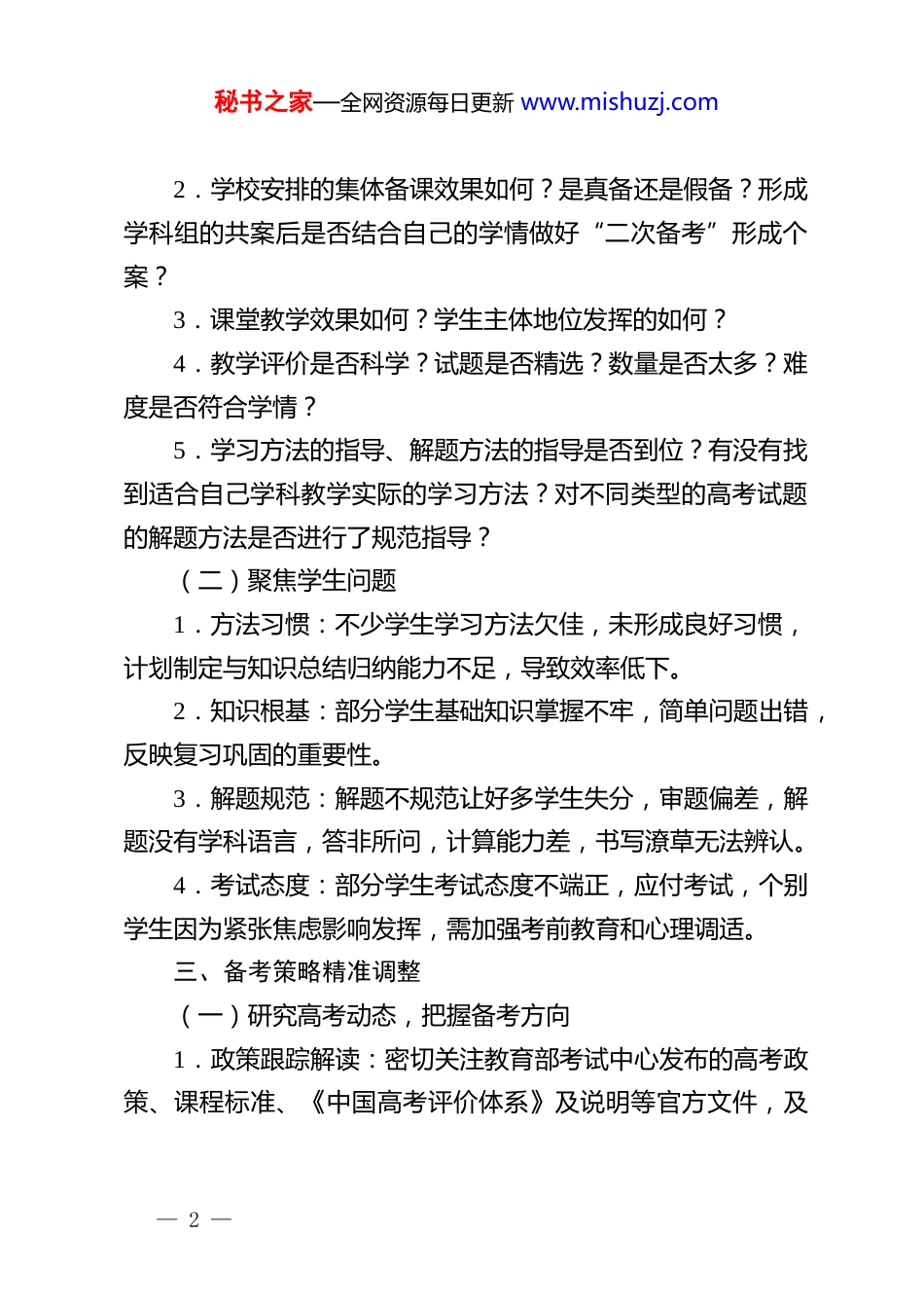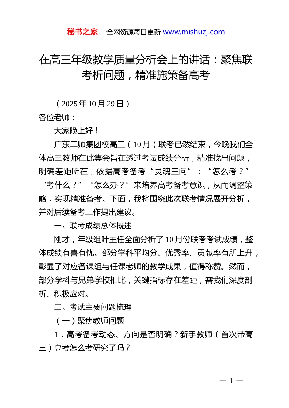 秘书之家—全网资源每日更新 www.mishuzj.com在高三年级教学质量分析会上的讲话:聚焦联考析问题,精准施策备高考(2025 年 10 月 29 日)各位老师:大家晚上好!广东二师集团校高三(10 月)联考已然结束,今晚我们全体高三教师在此集会旨在透过考试成绩分析,精准找出问题,明确差距所在,依据高考备考“灵魂三问”:“怎么考?”“考什么?”“怎么办?”来培养高考备考意识,从而调整策略,实现精准备考。下面,我将围绕此次联考情况展开分析,并对后续备考工作提出建议。一、联考成绩总体概述刚才,年级组叶主任全面分析了 10 月份联考考试成绩,整体成绩有喜有忧。部分学科平均分、优秀率、贡献率有所上升,彰显了对应备课组与任课老师的教学成果,值得称赞。然而,部分学科与兄弟学校相比,关键指标存在差距,需我们深度剖析、积极应对。二、考试主要问题梳理(一)聚焦教师问题1.高考备考动态、方向是否明确?新手教师(首次带高三)高考怎么考研究了吗?— 1 —秘书之家—全网资源每日更新 www.mishuzj.com2.学校安排的集体备课效果如何?是真备还是假备?形成学科组的共案后是否结合自己的学情做好“二次备考”形成个案?3.课堂教学效果如何?学生主体地位发挥的如何?4.教学评价是否科学?试题是否精选?数量是否太多?难度是否符合学情?5.学习方法的指导、解题方法的指导是否到位?有没有找到适合自己学科教学实际的学习方法?对不同类型的高考试题的解题方法是否进行了规范指导?(二)聚焦学生问题1.方法习惯:不少学生学习方法欠佳,未形成良好习惯,计划制定与知识总结归纳能力不足,导致效率低下。2.知识根基:部分学生基础知识掌握不牢,简单问题出错,反映复习巩固的重要性。3.解题规范:解题不规范让好多学生失分,审题偏差,解题没有学科语言,答非所问,计算能力差,书写潦草无法辨认。4.考试态度:部分学生考试态度不端正,应付考试,个别学生因为紧张焦虑影响发挥,需加强考前教育和心理调适。三、备考策略精准调整(一)研究高考动态,把握备考方向1.政策跟踪解读:密切关注教育部考试中心发布的高考政策、课程标准、《中国高考评价体系》及说明等官方文件,及— 2 —秘书之家—全网资源每日更新 www.mishuzj.com时收集整理相关信息,来探寻高考“考什么”的问题。备课组定期组织政策学习研讨会,深入解读高考政策的变化要点,分析其对教学内容和备考方向的影响。例如,若高考政策强调对学生创新思维和实践能力的考查,我们在教学中就要相应增加相关的教学活动和训练题目。2.真题研究分析:组织教师对近五年的高考真题(全国卷、广东卷)进行深入研究,从题型分布、知识点覆盖、命题角度、难度设置等方面进行细致分析,总结高考命题规律和趋势,来探寻高考“怎么考”的问题。比如,通过研究发现语文高考作文在主题上越来越贴近时代热点和社会现实,我们在作文教学中就应引导学生关注时事,积累相关素材,并进行针对性的写作训练。3.信息交流整合:鼓励教师参加各类高考研讨会、教学论坛等活动,与其他学校的教师交流备考经验,获取最新的高考资讯。同时,利用网络资源,关注教育专家、权威媒体发布的高考相关信息,整合多方信息,为我们的备考工作提供参考。(二)坚持因材施教,实施分层教学1.精准分层:依据联考成绩、平时作业完成情况以及课堂表现等多维度数据,对学生进行精准分层,可分为基础层、提高层和拓展层。基础层学生基础知识薄弱,需要重点巩固基础知识;提高层学生具备一定基础,但在知识的综合运用和解题技巧方面有待提升;拓展层学生基础知识扎实,学习能力较强,— 3 —秘书之家—全网资源每日更新 www.mishuzj.com旨在进一步拓展思维,冲击高分。2.分层备课:各备课组针对不同层次的学生制定个性化的教学目标和教学内容。对于基础层学生,备课重点放在基础知识的讲解和巩固上,采用通俗易懂的方式,多举实例,帮助学生理解和记忆;提高层学生则注重知识的拓展延伸和综合运用,设计一些具有一定难度的综合性题目,培养学生的解题能力;拓展层学生的备课内容要更具深度和广度,引入一些学科前沿知识和...