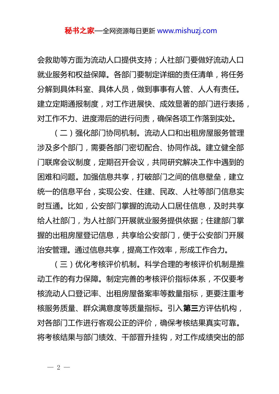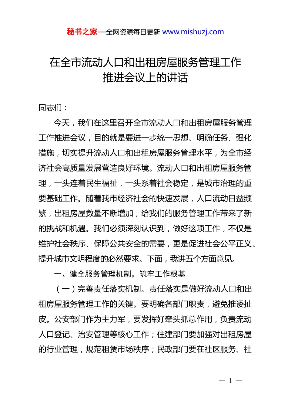 秘书之家—全网资源每日更新 www.mishuzj.com在全市流动人口和出租房屋服务管理工作推进会议上的讲话同志们:今天,我们在这里召开全市流动人口和出租房屋服务管理工作推进会议,目的就是要进一步统一思想、明确任务、强化措施,切实提升流动人口和出租房屋服务管理水平,为全市经济社会高质量发展营造良好环境。流动人口和出租房屋服务管理,一头连着民生福祉,一头系着社会稳定,是城市治理的重要基础工作。随着我市经济社会的快速发展,人口流动日益频繁,出租房屋数量不断增加,给我们的服务管理工作带来了新的挑战和机遇。我们必须深刻认识到,做好这项工作,不仅是维护社会秩序、保障公共安全的需要,更是促进社会公平正义、提升城市文明程度的必然要求。下面,我讲五个方面意见。一、健全服务管理机制,筑牢工作根基(一)完善责任落实机制。责任落实是做好流动人口和出租房屋服务管理工作的关键。要明确各部门职责,避免推诿扯皮。公安部门作为主力军,要发挥好牵头抓总作用,负责流动人口登记、治安管理等核心工作;住建部门要加强对出租房屋的行业管理,规范租赁市场秩序;民政部门要在社区服务、社— 1 —秘书之家—全网资源每日更新 www.mishuzj.com会救助等方面为流动人口提供支持;人社部门要做好流动人口就业服务和权益保障。各部门要制定详细的责任清单,将任务分解到具体科室、具体人员,做到事事有人管、人人有责任。建立定期通报制度,对工作进展快、成效显著的部门进行表扬,对工作不力、进度滞后的进行问责,确保各项工作落到实处。(二)强化部门协同机制。流动人口和出租房屋服务管理涉及多个部门,需要各部门密切配合、协同作战。建立健全部门联席会议制度,定期召开会议,共同研究解决工作中遇到的困难和问题。加强信息共享,打破部门之间的信息壁垒,建立统一的信息平台,实现公安、住建、民政、人社等部门信息实时互通。比如,公安部门掌握的流动人口居住信息,及时共享给人社部门,为人社部门开展就业服务提供依据;住建部门掌握的出租房屋登记信息,共享给公安部门,便于公安部门开展治安管理。通过信息共享,提高工作效率,形成工作合力。(三)优化考核评价机制。科学合理的考核评价机制是推动工作的有力保障。制定完善的考核评价指标体系,不仅要考核流动人口登记率、出租房屋备案率等数量指标,更要注重考核服务质量、群众满意度等质量指标。引入第三方评估机构,对各部门工作进行客观公正的评价,确保考核结果真实可靠。将考核结果与部门绩效、干部晋升挂钩,对工作成绩突出的部— 2 —秘书之家—全网资源每日更新 www.mishuzj.com门和个人给予表彰奖励,对考核不达标的进行约谈整改,充分调动各部门工作积极性。二、加强信息化建设,提升管理效能(一)打造综合信息平台。利用现代信息技术,打造全市统一的流动人口和出租房屋综合信息平台。平台要具备信息采集、登记备案、数据分析、预警提示等功能,实现对流动人口和出租房屋的全方位、动态化管理。开发手机 APP 等便捷的信息采集终端,方便流动人口自主申报信息,房东在线备案出租房屋。通过平台,实时掌握流动人口的流入流出情况、出租房屋的分布和使用情况,为精准管理提供数据支持。(二)推进数据整合共享。目前,各部门都掌握着一定的流动人口和出租房屋相关数据,但存在数据分散、标准不一等问题。要加大数据整合力度,将公安、住建、民政、教育、卫健等部门的数据进行汇总分析,消除数据孤岛。建立数据共享机制,明确数据共享的范围、方式和流程,确保各部门能够及时获取所需数据。通过数据共享,实现对流动人口和出租房屋的多维度分析,为政策制定、资源配置提供科学依据。(三)强化数据分析应用。大数据的价值在于分析应用。利用数据分析技术,对流动人口和出租房屋信息进行深度挖掘。分析流动人口的来源地、年龄结构、就业分布等特征,为产业— 3 —秘书之家—全网资源每日更新 www.mishuzj.com布局、公共服务设施建设提供参考;分析出租房屋的租金水平、空置率等情况,为房地产市场调控提供依据。建立风险预警模型,通过对数据的实时监测,及时发现潜在的安全隐患和...