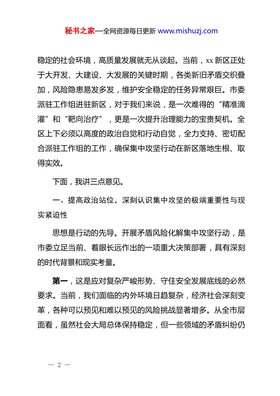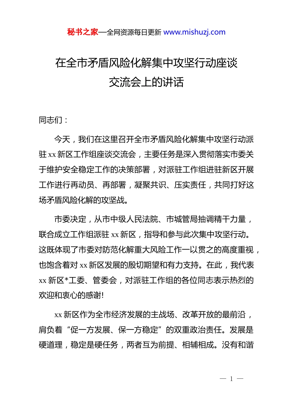 秘书之家—全网资源每日更新 www.mishuzj.com在全市矛盾风险化解集中攻坚行动座谈交流会上的讲话同志们:今天,我们在这里召开全市矛盾风险化解集中攻坚行动派驻 xx 新区工作组座谈交流会,主要任务是深入贯彻落实市委关于维护安全稳定工作的决策部署,对派驻工作组进驻新区开展工作进行再动员、再部署,凝聚共识、压实责任,共同打好这场矛盾风险化解的攻坚战。市委决定,从市中级人民法院、市城管局抽调精干力量,联合成立工作组派驻 xx 新区,指导和参与此次集中攻坚行动。这既体现了市委对防范化解重大风险工作一以贯之的高度重视,也饱含着对 xx 新区发展的殷切期望和有力支持。在此,我代表xx 新区*工委、管委会,对派驻工作组的各位同志表示热烈的欢迎和衷心的感谢!xx 新区作为全市经济发展的主战场、改革开放的最前沿,肩负着“促一方发展、保一方稳定”的双重政治责任。发展是硬道理,稳定是硬任务,两者互为前提、相辅相成。没有和谐— 1 —秘书之家—全网资源每日更新 www.mishuzj.com稳定的社会环境,高质量发展就无从谈起。当前,xx 新区正处于大开发、大建设、大发展的关键时期,各类新旧矛盾交织叠加,风险隐患易发多发,维护安全稳定的任务异常艰巨。市委派驻工作组进驻新区,对于我们来说,是一次难得的“精准滴灌”和“靶向治疗”,更是一次提升治理能力的宝贵契机。全区上下必须以高度的政治自觉和行动自觉,全力支持、密切配合派驻工作组的工作,确保集中攻坚行动在新区落地生根、取得实效。下面,我讲三点意见。一、提高政治站位,深刻认识集中攻坚的极端重要性与现实紧迫性思想是行动的先导。开展矛盾风险化解集中攻坚行动,是市委立足当前、着眼长远作出的一项重大决策部署,具有深刻的时代背景和现实考量。第一,这是应对复杂严峻形势、守住安全发展底线的必然要求。当前,我们面临的内外环境日趋复杂,经济社会深刻变革,各种可以预见和难以预见的风险挑战显著增多。从全市层面看,虽然社会大局总体保持稳定,但一些领域的矛盾纠纷仍— 2 —秘书之家—全网资源每日更新 www.mishuzj.com处于高位运行状态。根据相关部门的统计分析,2025 年以来,全市各级行业部门累计排查化解各类矛盾纠纷已超过 6242 件,化解率达到 96.33%;公安系统排查化解的各类矛盾纠纷也超过了 3000 起。这些数据一方面反映了我们前期工作的成效,但另一方面也揭示了矛盾存量之大、增量之多、化解压力之巨的严峻现实。特别是那些涉及面广、利益诉求复杂、历时较长的“骨头案”“钉子案”,常规化的处理方式往往难见其效,必须通过集中攻坚、提级办理的方式,以雷霆之势予以破解。xx新区作为全市发展的核心板块,各类要素高度聚集,矛盾风险也更为集中,任何一个风险点的失控,都可能引发连锁反应,冲击发展大局。因此,开展集中攻坚,既是为全市大局分忧,也是为新区自身行稳致远扫清障碍。第二,这是践行以人民为中心的发展思想、厚植*的执政根基的内在要求。国泰民安是人民群众最基本、最普遍的愿望。矛盾风险化解工作,本质上就是群众工作,事关人民群众的切身利益,事关社会的公平正义。无论是征地拆迁、项目建设引发的利益纠葛,还是房地产、金融等领域的涉众型风险,抑或是劳资、医患、邻里之间的日常摩擦,都直接关系到群众的获得感、幸福感、安全感。据不完全统计,去年全市成功调处的— 3 —秘书之家—全网资源每日更新 www.mishuzj.com各类矛盾纠纷高达 98179 起,调处成功率超过 93%这背后是无数个家庭的安宁和社会的和谐。如果对群众的合理诉求视而不见、久拖不决,就会损耗政府的公信力,侵蚀*的执政基础。此次攻坚行动,就是要旗帜鲜明地向那些漠视群众利益、激化社会矛盾的行为亮剑,就是要用心用情用力解决好群众的急难愁盼问题,通过实实在在的化解成效,让人民群众感受到*和政府的温暖,从而把人心凝聚到改革发展的共同事业上来。第三,这是推动社会治理体系和治理能力现代化、实现长治久安的战略要求。化解矛盾纠纷,不能满足于“按下葫芦浮起瓢”的被动应付,更要追求“釜底抽薪、标本兼治”的长效常治。传统的、分散的、单一的治...