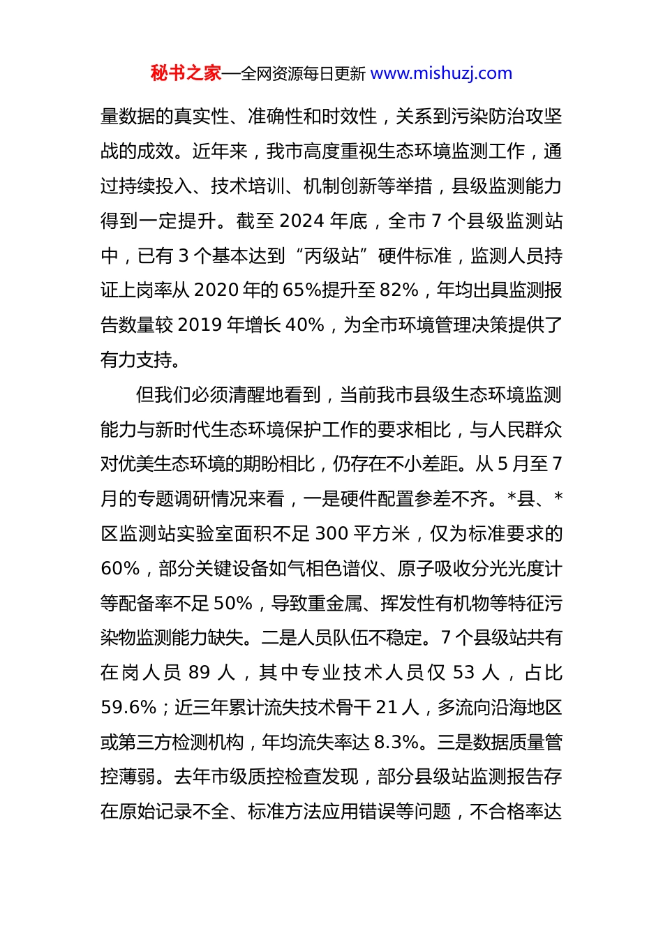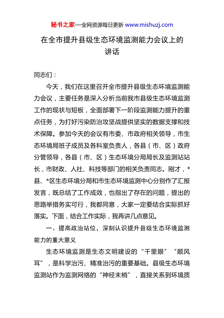 秘书之家—全网资源每日更新 www.mishuzj.com在全市提升县级生态环境监测能力会议上的讲话 同志们:今天,我们在这里召开全市提升县级生态环境监测能力会议,主要任务是深入分析当前我市县级生态环境监测工作的现状与短板,全面部署下一阶段监测能力提升的重点任务,为打好污染防治攻坚战提供坚实的数据支撑和技术保障。参加今天的会议有市委、市政府相关领导,市生态环境局班子成员及各科室负责人,各县(市、区)政府分管领导,各县(市、区)生态环境分局局长及监测站站长,市财政、人社、科技等部门的相关负责同志。刚才,*县、*区生态环境分局和市生态环境监测中心分别作了汇报发言,既总结了工作成效,也指出了存在的问题,提出的思路举措务实可行,我都同意,大家一定要结合实际抓好落实。下面,结合工作实际,我再讲几点意见。一、提高政治站位,深刻认识提升县级生态环境监测能力的重大意义生态环境监测是生态文明建设的“千里眼”“顺风耳”,是科学治污、精准治污的重要基础。县级生态环境监测站作为监测网络的“神经末梢”,直接关系到环境质秘书之家—全网资源每日更新 www.mishuzj.com量数据的真实性、准确性和时效性,关系到污染防治攻坚战的成效。近年来,我市高度重视生态环境监测工作,通过持续投入、技术培训、机制创新等举措,县级监测能力得到一定提升。截至 2024 年底,全市 7 个县级监测站中,已有 3 个基本达到“丙级站”硬件标准,监测人员持证上岗率从 2020 年的 65%提升至 82%,年均出具监测报告数量较 2019 年增长 40%,为全市环境管理决策提供了有力支持。但我们必须清醒地看到,当前我市县级生态环境监测能力与新时代生态环境保护工作的要求相比,与人民群众对优美生态环境的期盼相比,仍存在不小差距。从 5 月至 7月的专题调研情况来看,一是硬件配置参差不齐。*县、*区监测站实验室面积不足 300 平方米,仅为标准要求的60%,部分关键设备如气相色谱仪、原子吸收分光光度计等配备率不足 50%,导致重金属、挥发性有机物等特征污染物监测能力缺失。二是人员队伍不稳定。7 个县级站共有在 岗 人 员 89 人 , 其 中 专 业 技 术 人 员 仅 53 人 , 占 比59.6%;近三年累计流失技术骨干 21 人,多流向沿海地区或第三方检测机构,年均流失率达 8.3%。三是数据质量管控薄弱。去年市级质控检查发现,部分县级站监测报告存在原始记录不全、标准方法应用错误等问题,不合格率达秘书之家—全网资源每日更新 www.mishuzj.com15%,影响了数据的公信力。当前,我市正处于深入打好污染防治攻坚战的关键时期,长江经济带生态保护、洞庭湖生态环境治理等重大任务叠加,对生态环境监测数据的需求日益迫切。如果县级监测能力跟不上,就会出现“数据断档”“监管盲区”,直接影响污染溯源、应急处置和考核评价的科学性。各县(市、区)、各相关部门要从践行习近平生态文明思想的高度,从推动高质量发展的全局出发,充分认识提升县级监测能力的极端重要性和紧迫性,把这项工作作为一项硬任务来抓,切实抓出成效。二、聚焦关键环节,全面提升县级生态环境监测能力建设水平提升县级生态环境监测能力是一项系统工程,必须坚持问题导向、目标导向、结果导向,紧扣“补短板、强弱项、提效能”的总体思路,重点抓好以下几方面工作:(一)强化硬件建设,筑牢监测能力基础。硬件设施是监测工作的“武器装备”,必须优先保障。一是明确建设标准。严格按照国家“丙级站”建设标准,全面梳理县级监测站硬件需求清单,重点补齐实验室功能分区、基础设备、应急监测装备等短板。到 2025 年底,所有县级站实验室面积必须达到 500 平方米以上,核心设备配备率达到秘书之家—全网资源每日更新 www.mishuzj.com100%,具备水、气、土等 28 项基本因子的监测能力。*县、区要作为重点攻坚对象,今年内完成实验室扩建和设备采购,市生态环境局要会同市财政局加强督导。二是加大资金投入。建立“市级引导、县级为主、多元补充”的资金保障机制,市级财政每年安排不少于 2000 万元的专项补助资金,对达标验收的县级站给予 50 万-100...