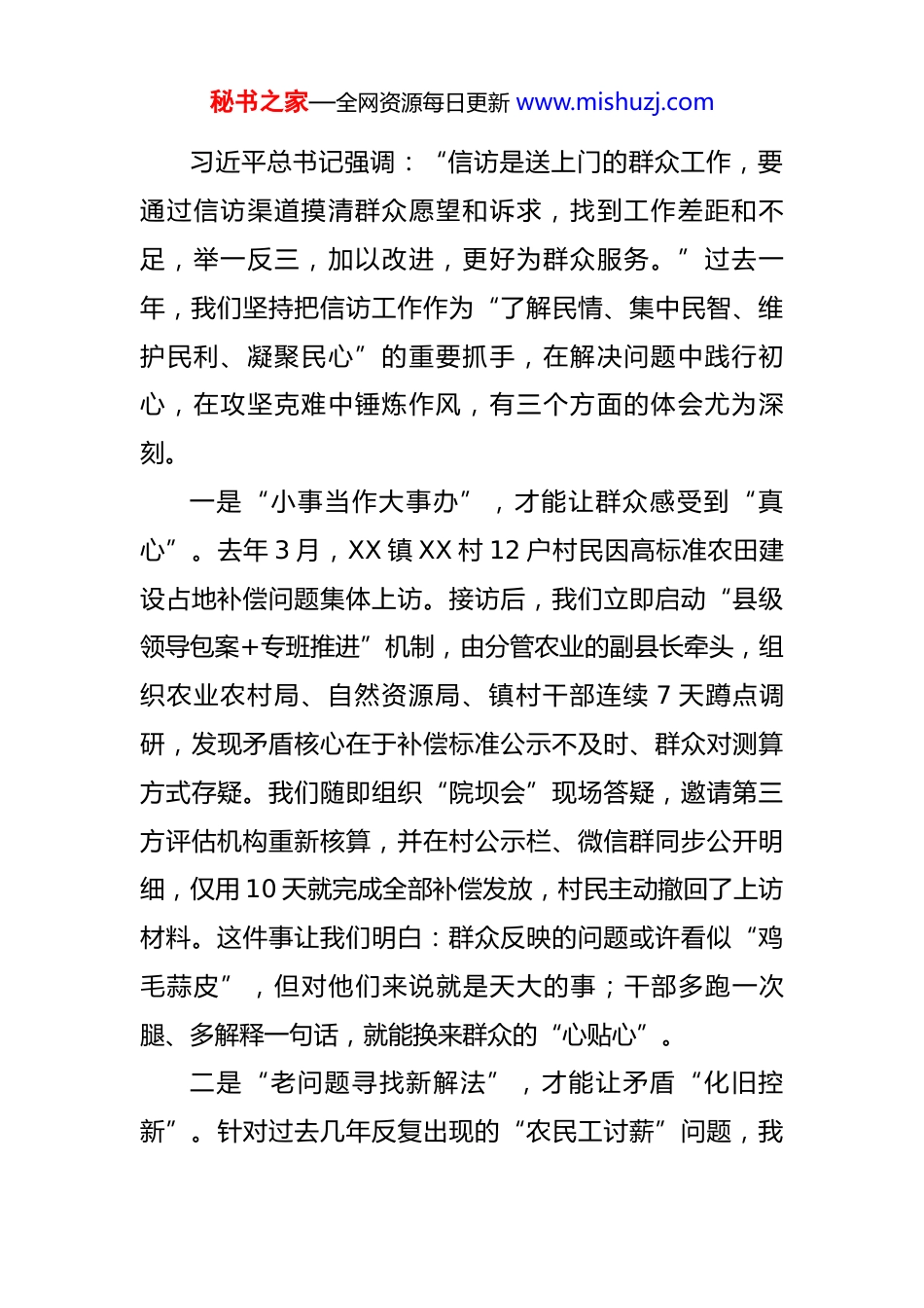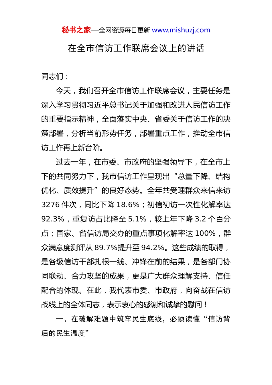 秘书之家—全网资源每日更新 www.mishuzj.com在全市信访工作联席会议上的讲话 同志们:今天,我们召开全市信访工作联席会议,主要任务是深入学习贯彻习近平总书记关于加强和改进人民信访工作的重要指示精神,全面落实中央、省委关于信访工作的决策部署,分析当前形势任务,部署重点工作,推动全市信访工作再上新台阶。过去一年,在市委、市政府的坚强领导下,在全市上下的共同努力下,我市信访工作呈现出“总量下降、结构优化、质效提升”的良好态势。全年共受理群众来信来访3276 件次,同比下降 18.6%;初信初访一次性化解率达92.3%,重复访占比降至 5.1%,较上年下降 3.2 个百分点;国家、省信访局交办的重点事项化解率达 100%,群众满意度测评从 89.7%提升至 94.2%。这些成绩的取得,是各级信访干部扎根一线、冲锋在前的结果,是各部门协同联动、合力攻坚的成果,更是广大群众理解支持、信任配合的体现。在此,我代表市委、市政府,向奋战在信访战线上的全体同志,表示衷心的感谢和诚挚的慰问!一、在破解难题中筑牢民生底线,必须读懂“信访背后的民生温度”秘书之家—全网资源每日更新 www.mishuzj.com习近平总书记强调:“信访是送上门的群众工作,要通过信访渠道摸清群众愿望和诉求,找到工作差距和不足,举一反三,加以改进,更好为群众服务。”过去一年,我们坚持把信访工作作为“了解民情、集中民智、维护民利、凝聚民心”的重要抓手,在解决问题中践行初心,在攻坚克难中锤炼作风,有三个方面的体会尤为深刻。一是“小事当作大事办”,才能让群众感受到“真心”。去年 3 月,XX 镇 XX 村 12 户村民因高标准农田建设占地补偿问题集体上访。接访后,我们立即启动“县级领导包案+专班推进”机制,由分管农业的副县长牵头,组织农业农村局、自然资源局、镇村干部连续 7 天蹲点调研,发现矛盾核心在于补偿标准公示不及时、群众对测算方式存疑。我们随即组织“院坝会”现场答疑,邀请第三方评估机构重新核算,并在村公示栏、微信群同步公开明细,仅用 10 天就完成全部补偿发放,村民主动撤回了上访材料。这件事让我们明白:群众反映的问题或许看似“鸡毛蒜皮”,但对他们来说就是天大的事;干部多跑一次腿、多解释一句话,就能换来群众的“心贴心”。二是“老问题寻找新解法”,才能让矛盾“化旧控新”。针对过去几年反复出现的“农民工讨薪”问题,我秘书之家—全网资源每日更新 www.mishuzj.com们没有停留在“接访—交办—督办”的传统流程,而是联合人社、住建、交通等部门建立“源头预防+动态监测+快速处置”机制:年初在企业推行“工资保证金+电子合同”双轨制,年中开展“用工规范”专项检查,年底依托“智慧信访”平台实时抓取欠薪线索。去年全年,农民工讨薪类信访事项同比下降 41%,其中通过网络平台解决的占比达 68%。这启示我们:面对复杂矛盾,既要发扬“钉钉子精神”抓落实,更要跳出“路径依赖”找创新,用改革思维破解“老大难”。三是“干部下沉一线干”,才能让基层成为“主阵地”。我们严格落实“县级领导接访日”“乡镇干部包村(社区)”等制度,全年县级领导接访 126 批次,乡镇干部入户走访 1.2 万次,推动 37 个“骨头案”“钉子案”在一线化解。特别值得一提的是 XX 街道“信访代理员”制度——由社区“两委”成员、老党员、志愿者担任代理员,主动收集群众诉求,全程跟踪办理进度,去年共代理信访事项 213 件,办结率 100%,群众评价“干部就在身边,问题不用跑远”。这说明:基层是信访工作的“根”,只有把力量沉到一线,把服务送到家门口,才能真正打通矛盾化解的“最后一公里”。二、在直面挑战中强化底线思维,必须清醒认识“信秘书之家—全网资源每日更新 www.mishuzj.com访工作的复杂变量”当前,世界百年变局加速演进,国内改革发展稳定任务艰巨繁重,我市正处于“产业转型攻坚期、城市更新加速期、基层治理优化期”叠加阶段,信访工作面临许多新情况、新挑战,需要我们高度警惕、认真应对。从外部环境看,“三叠加”矛盾易发多发。一是经济转型与利益调整的叠加。随着传统产业升级、新兴产业培育,部...