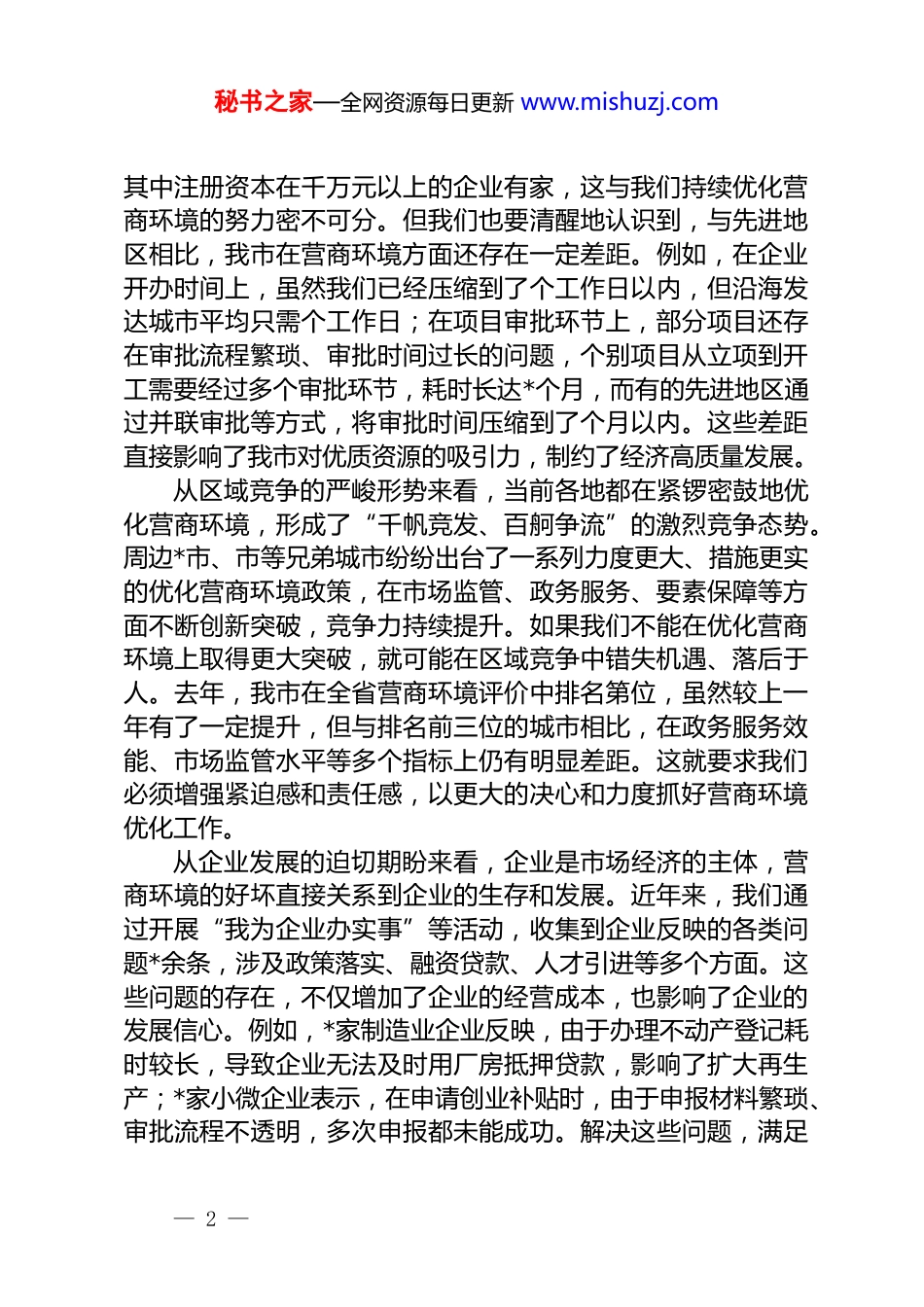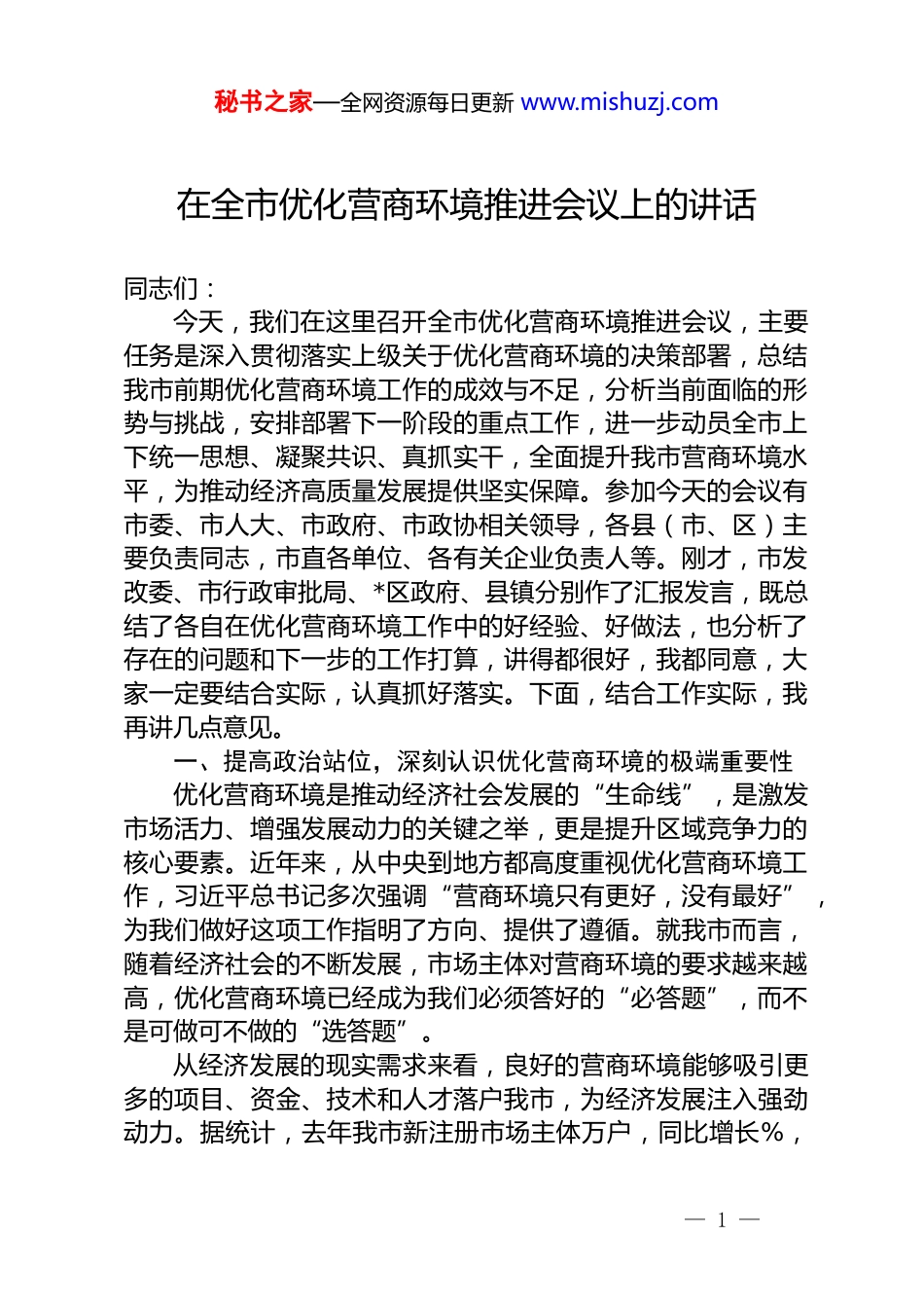秘书之家—全网资源每日更新 www.mishuzj.com在全市优化营商环境推进会议上的讲话同志们:今天,我们在这里召开全市优化营商环境推进会议,主要任务是深入贯彻落实上级关于优化营商环境的决策部署,总结我市前期优化营商环境工作的成效与不足,分析当前面临的形势与挑战,安排部署下一阶段的重点工作,进一步动员全市上下统一思想、凝聚共识、真抓实干,全面提升我市营商环境水平,为推动经济高质量发展提供坚实保障。参加今天的会议有市委、市人大、市政府、市政协相关领导,各县(市、区)主要负责同志,市直各单位、各有关企业负责人等。刚才,市发改委、市行政审批局、*区政府、县镇分别作了汇报发言,既总结了各自在优化营商环境工作中的好经验、好做法,也分析了存在的问题和下一步的工作打算,讲得都很好,我都同意,大家一定要结合实际,认真抓好落实。下面,结合工作实际,我再讲几点意见。一、提高政治站位,深刻认识优化营商环境的极端重要性优化营商环境是推动经济社会发展的“生命线”,是激发市场活力、增强发展动力的关键之举,更是提升区域竞争力的核心要素。近年来,从中央到地方都高度重视优化营商环境工作,习近平总书记多次强调“营商环境只有更好,没有最好”,为我们做好这项工作指明了方向、提供了遵循。就我市而言,随着经济社会的不断发展,市场主体对营商环境的要求越来越高,优化营商环境已经成为我们必须答好的“必答题”,而不是可做可不做的“选答题”。从经济发展的现实需求来看,良好的营商环境能够吸引更多的项目、资金、技术和人才落户我市,为经济发展注入强劲动力。据统计,去年我市新注册市场主体万户,同比增长%,— 1 —秘书之家—全网资源每日更新 www.mishuzj.com其中注册资本在千万元以上的企业有家,这与我们持续优化营商环境的努力密不可分。但我们也要清醒地认识到,与先进地区相比,我市在营商环境方面还存在一定差距。例如,在企业开办时间上,虽然我们已经压缩到了个工作日以内,但沿海发达城市平均只需个工作日;在项目审批环节上,部分项目还存在审批流程繁琐、审批时间过长的问题,个别项目从立项到开工需要经过多个审批环节,耗时长达*个月,而有的先进地区通过并联审批等方式,将审批时间压缩到了个月以内。这些差距直接影响了我市对优质资源的吸引力,制约了经济高质量发展。从区域竞争的严峻形势来看,当前各地都在紧锣密鼓地优化营商环境,形成了“千帆竞发、百舸争流”的激烈竞争态势。周边*市、市等兄弟城市纷纷出台了一系列力度更大、措施更实的优化营商环境政策,在市场监管、政务服务、要素保障等方面不断创新突破,竞争力持续提升。如果我们不能在优化营商环境上取得更大突破,就可能在区域竞争中错失机遇、落后于人。去年,我市在全省营商环境评价中排名第位,虽然较上一年有了一定提升,但与排名前三位的城市相比,在政务服务效能、市场监管水平等多个指标上仍有明显差距。这就要求我们必须增强紧迫感和责任感,以更大的决心和力度抓好营商环境优化工作。从企业发展的迫切期盼来看,企业是市场经济的主体,营商环境的好坏直接关系到企业的生存和发展。近年来,我们通过开展“我为企业办实事”等活动,收集到企业反映的各类问题*余条,涉及政策落实、融资贷款、人才引进等多个方面。这些问题的存在,不仅增加了企业的经营成本,也影响了企业的发展信心。例如,*家制造业企业反映,由于办理不动产登记耗时较长,导致企业无法及时用厂房抵押贷款,影响了扩大再生产;*家小微企业表示,在申请创业补贴时,由于申报材料繁琐、审批流程不透明,多次申报都未能成功。解决这些问题,满足— 2 —秘书之家—全网资源每日更新 www.mishuzj.com企业的合理诉求,是我们优化营商环境的重要目标。二、肯定成绩,正视不足,准确把握我市优化营商环境工作现状近年来,市委、市政府始终把优化营商环境作为“头号工程”来抓,坚持问题导向、目标导向和结果导向,出台了一系列政策措施,取得了阶段性成效。在政务服务效能提升方面,我们持续深化“放管服”改革推进“一网通办”“一窗受理”。目前,我市政务服务事项网上可办率...