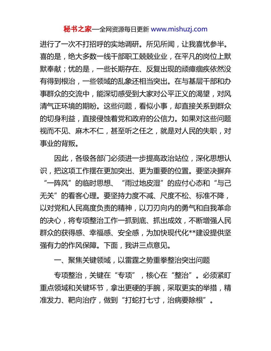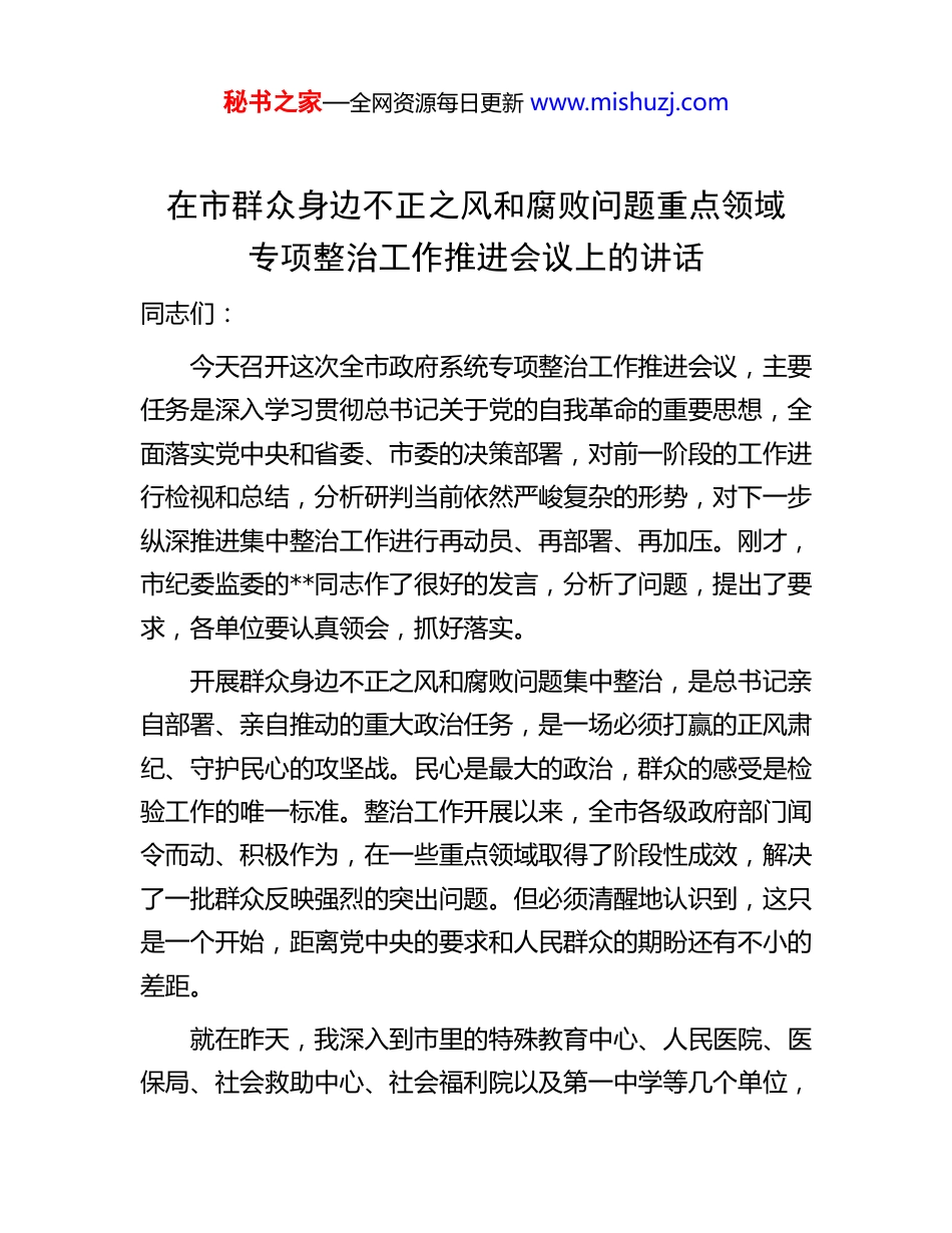 秘书之家—全网资源每日更新 www.mishuzj.com在市群众身边不正之风和腐败问题重点领域专项整治工作推进会议上的讲话同志们:今天召开这次全市政府系统专项整治工作推进会议,主要任务是深入学习贯彻总书记关于党的自我革命的重要思想,全面落实党中央和省委、市委的决策部署,对前一阶段的工作进行检视和总结,分析研判当前依然严峻复杂的形势,对下一步纵深推进集中整治工作进行再动员、再部署、再加压。刚才,市纪委监委的**同志作了很好的发言,分析了问题,提出了要求,各单位要认真领会,抓好落实。开展群众身边不正之风和腐败问题集中整治,是总书记亲自部署、亲自推动的重大政治任务,是一场必须打赢的正风肃纪、守护民心的攻坚战。民心是最大的政治,群众的感受是检验工作的唯一标准。整治工作开展以来,全市各级政府部门闻令而动、积极作为,在一些重点领域取得了阶段性成效,解决了一批群众反映强烈的突出问题。但必须清醒地认识到,这只是一个开始,距离党中央的要求和人民群众的期盼还有不小的差距。就在昨天,我深入到市里的特殊教育中心、人民医院、医保局、社会救助中心、社会福利院以及第一中学等几个单位,秘书之家—全网资源每日更新 www.mishuzj.com进行了一次不打招呼的实地调研。所见所闻,让我喜忧参半。喜的是,绝大多数一线干部职工兢兢业业,在平凡的岗位上默默奉献;忧的是,一些长期存在、反复出现的顽瘴痼疾依然没有得到根治,一些领域的乱象还相当突出。在与基层干部和办事群众的交流中,能深切感受到大家对公平正义的渴望,对风清气正环境的期盼。这些问题,看似小事,却直接关系到群众的切身利益,直接侵蚀着党和政府的公信力。如果对这些问题视而不见、麻木不仁,甚至听之任之,就是对人民的失职,对事业的背叛。因此,各级各部门必须进一步提高政治站位,深化思想认识,把这项工作摆在更加突出、更为重要的位置。要坚决摒弃“一阵风”的临时思想、“雨过地皮湿”的应付心态和“与己无关”的看客心理。要坚持力度不减、尺度不松、标准不降,以对党和人民高度负责的精神,以刀刃向内的勇气和自我革命的决心,将专项整治工作一抓到底、抓出成效,不断增强人民群众的获得感、幸福感、安全感,为加快现代化**建设提供坚强有力的作风保障。下面,我讲三点意见。一、聚焦关键领域,以雷霆之势重拳整治突出问题专项整治,关键在“专项”,核心在“整治”。必须紧盯重点领域和关键环节,拿出更硬的手腕,采取更实的举措,精准发力、靶向治疗,做到“打蛇打七寸,治病要除根”。秘书之家—全网资源每日更新 www.mishuzj.com第一,要从严抓好民生保障领域整治,坚决守护群众的“奶酪”。民生无小事,枝叶总关情。教育、医疗、社保、养老、殡葬等领域,与群众生活息息相关,是社会公平的底线,也是腐败和不正之风易发多发的“重灾区”。在教育领域,要对“校园餐”问题进行一次彻底的排查和整治。学生的营养餐、食堂的管理,绝不仅仅是吃饭问题,更是关系到下一代健康成长的国之大计。要严查采购、供应、制作等各个环节中可能存在的利益输送、以次充好、克扣分量等行为。教育部门要牵头,联合市场监管、卫健等部门,建立健全从田间到餐桌的全链条监管体系,引入家长监督和社会监督,真正把食堂办成让学生吃得放心、家长安心的“良心食堂”。不能让本该充满书香的校园,沾染上铜臭气。在医疗领域,要持续扎紧管好医保基金这个“救命钱”的口子。医保基金是人民群众的“看病钱”“保命钱”,一分一厘都不能乱动。要聚焦虚假住院、伪造病历、过度诊疗、骗取套取医保基金等突出问题,发挥大数据等技术优势,强化智能监控和筛查预警能力。卫健、医保部门要协同发力,加大对定点医疗机构的飞行检查和现场核查力度,对违法违规行为发现一起、查处一起、曝光一起,形成强大震慑。同时,要深化医疗服务价格和药品耗材采购改革,从源头上斩断医药购销领域的腐败链条。在社会救助和殡葬服务领域,要重点纠治优亲厚友、吃拿卡要、服务冷硬横推以及殡葬行业收费不透明、强制消费等问题。社会救助是传递党和政府温暖秘书之家—全网资源每日更新 www.mishuzj.com的最后一...