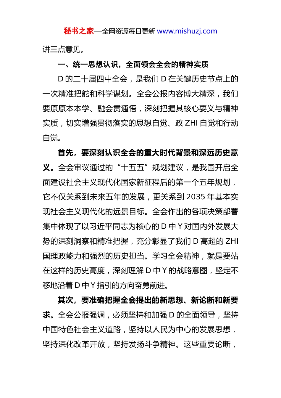 秘书之家—全网资源每日更新 www.mishuzj.com在市教育局专题传达学习二十届四中全会精神会议上的讲话同志们:今天,我们在这里召开专题会议,主要任务是传达学习刚刚胜利闭幕的中国共产 D 第二十届中 Y 委员会第四次全体会议精神。这次全会,是在中华人民共和国成立 76 周年之际,也是在全 D 全国各族人民迈上全面建设社会主义现代化国家新征程、向第二个百年奋斗目标进军的关键时刻,召开的一次具有全局性、历史性意义的重要会议。全会听取和讨论了习近平总书记受中 Y 政 ZHI 局委托作的工作报告,审议通过了《中共中 Y 关于制定国民经济和社会发展第十五个五年规划的建议》。XX 社已于今日受权发布了全会公报高屋建瓴、思想深邃,全面擘画了我国未来五年乃至更长时期发展的宏伟蓝图,为我们做好当前和今后一个时期的各项工作提供了根本遵循和行动指南。我们教育系统作为 D 的事业的重要组成部分,学习好、宣传好、贯彻好二十届四中全会精神,是当前和今后一个时期的首要政 ZHI 任务。全市教育系统的各级 D 组织和广大 D 员干部、教职员工,必须迅速把思想和行动统一到全会精神上来,把智慧和力量凝聚到实现全会确定的各项任务目标上来。下面,根据市委的统一部署和局 D 组的研究意见,我秘书之家—全网资源每日更新 www.mishuzj.com讲三点意见。一、统一思想认识,全面领会全会的精神实质D 的二十届四中全会,是我们 D 在关键历史节点上的一次精准把舵和科学谋划。全会公报内容博大精深,我们要原原本本学、融会贯通悟,深刻把握其核心要义与精神实质,切实增强贯彻落实的思想自觉、政 ZHI 自觉和行动自觉。首先,要深刻认识全会的重大时代背景和深远历史意义。全会审议通过的“十五五”规划建议,是我国开启全面建设社会主义现代化国家新征程后的第一个五年规划,它不仅关系到未来五年的发展,更关系到 2035 年基本实现社会主义现代化的远景目标。全会作出的各项决策部署集中体现了以习近平同志为核心的 D 中 Y 对国内外发展大势的深刻洞察和精准把握,充分彰显了我们 D 高超的 ZHI国理政能力和强烈的历史担当。学习全会精神,就是要站在这样的历史高度,深刻理解 D 中 Y 的战略意图,坚定不移地沿着 D 中 Y 指引的方向奋勇前进。其次,要准确把握全会提出的新思想、新论断和新要求。全会公报强调,必须坚持和加强 D 的全面领导,坚持中国特色社会主义道路,坚持以人民为中心的发展思想,坚持深化改革开放,坚持发扬斗争精神。这些重要论断,秘书之家—全网资源每日更新 www.mishuzj.com是对新时代十年伟大变革宝贵经验的深刻总结,也是“十五五”时期必须牢牢把握的重大原则。全会围绕推进中国式现代化,就经济社会发展作出了一系列重大部署,特别是在推动高质量发展、加快实现高水平科技自立自强、全面深化改革、促进城乡区域协调发展、建设更高水平开放型经济新体制、提升国家文化软实力、增进民生福祉、推动绿色发展、统筹发展和安全等方面,提出了明确的目标和任务。这些部署相互联系、有机统一,构成了一个完整的战略体系,为我们描绘了未来发展的清晰路线图。特别是,全会公报将“推进国家 ZHI 理体系和 ZHI 理能力现代化”摆在了突出位置。这既是 D 的十九届四中全会精神的延续和深化,也是适应新发展阶段、贯彻新发展理念、构建新发展格局的必然要求。对教育领域而言,这意味着我们的改革发展必须更加注重系统性、整体性和协同性,要善于运用法 ZHI 思维和法 ZHI 方式深化改革、推动发展、化解矛盾,全面提升教育 ZHI 理的科学化、精细化、法ZHI 化水平。全市教育系统要将学习全会精神与学习贯彻习近平新时代中国特色社会主义思想,特别是习近平总书记关于教育的重要论述结合起来,一体学习、一体领会、一体贯彻,真正做到学深悟透、入脑入心。再者,要切实将全会精神转化为实际行动和工作成效。秘书之家—全网资源每日更新 www.mishuzj.com统一思想认识不能仅仅停留在口头上、纸面上,更要落实到具体工作中。全市教育系统广大干部职工要以全会精神为指引,立足本职岗位,积极担当作为。在日常教育...