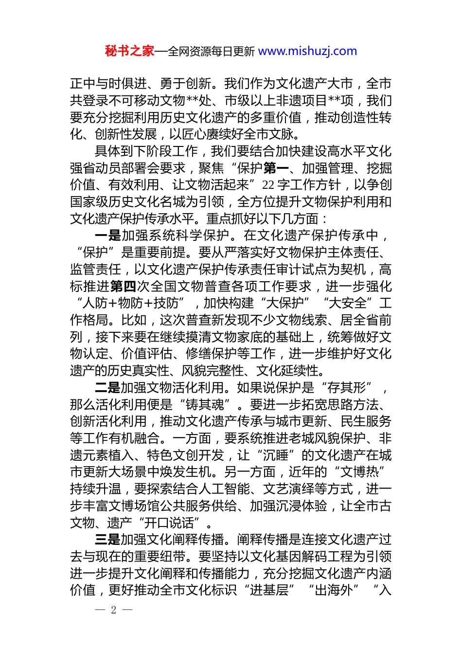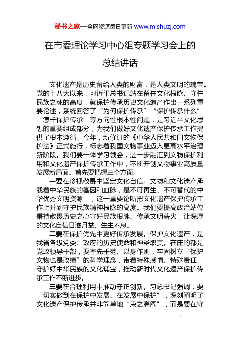 秘书之家—全网资源每日更新 www.mishuzj.com在市委理论学习中心组专题学习会上的总结讲话文化遗产是历史留给人类的财富,是人类文明的瑰宝。党的十八大以来,习近平总书记站在留住文化根脉、守住民族之魂的高度,就保护传承历史文化遗产作出一系列重要论述,系统回答了“为何保护传承”“保护传承什么”“怎样保护传承”等方向性根本性问题,是习近平文化思想的重要组成部分,为我们做好文化遗产保护传承工作提供了根本遵循。今年,新修订的《中华人民共和国文物保护法》正式施行,标志着我国文物事业迈入更高水平治理新阶段。我们要一体学习领会,进一步融汇到文物保护利用和文化遗产保护传承工作中,不断开创文物事业高质量发展新局面。首先要把握三个方面。一要在珍视敬畏中坚定文化自信。文物和文化遗产承载着中华民族的基因和血脉,是不可再生、不可替代的中华优秀文明资源”,这一重要论断把文化遗产保护传承工作上升到守护民族精神根脉的高度。我们要提高政治站位秉持敬畏历史之心守好民族根脉、传承文明薪火,让深厚的文化自信日滋月益、生生不息。二要在保护优先中更好传承发展。保护文化遗产,是我省各级党委、政府的历史使命和神圣职责。在座的都是党政领导干部,要率先垂范、以身作则,牢固树立“保护文物也是政绩”的科学理念,带着特殊感情、特殊责任,守护好中华民族的文化瑰宝,推动新时代文化遗产保护传承工作不断进步。三要在合理利用中推动守正创新。习总书记强调,要“切实做到在保护中发展、在发展中保护”,深刻阐明了文化遗产保护传承并非简单地“束之高阁”,而是要在守— 1 —秘书之家—全网资源每日更新 www.mishuzj.com正中与时俱进、勇于创新。我们作为文化遗产大市,全市共登录不可移动文物**处、市级以上非遗项目**项,我们要充分挖掘利用历史文化遗产的多重价值,推动创造性转化、创新性发展,以匠心赓续好全市文脉。具体到下阶段工作,我们要结合加快建设高水平文化强省动员部署会要求,聚焦“保护第一、加强管理、挖掘价值、有效利用、让文物活起来”22 字工作方针,以争创国家级历史文化名城为引领,全方位提升文物保护利用和文化遗产保护传承水平。重点抓好以下几方面:一是加强系统科学保护。在文化遗产保护传承中,“保护”是重要前提。要从严落实好文物保护主体责任、监管责任,以文化遗产保护传承责任审计试点为契机,高标推进第四次全国文物普查各项工作要求,进一步强化“人防+物防+技防”,加快构建“大保护”“大安全”工作格局。比如,这次普查新发现不少文物线索、居全省前列,接下来要在继续摸清文物家底的基础上,统筹做好文物认定、价值评估、修缮保护等工作,进一步维护好文化遗产的历史真实性、风貌完整性、文化延续性。二是加强文物活化利用。如果说保护是“存其形”,那么活化利用便是“铸其魂”。要进一步拓宽思路方法、创新活化利用,推动文化遗产传承与城市更新、民生服务等工作有机融合。一方面,要系统推进老城风貌保护、非遗元素植入、特色文创开发,让“沉睡”的文化遗产在城市更新大场景中焕发生机。另一方面,近年的“文博热”持续升温,要探索结合人工智能、文艺演绎等方式,进一步丰富文博场馆公共服务供给、加强沉浸体验,让全市古文物、遗产“开口说话”。三是加强文化阐释传播。阐释传播是连接文化遗产过去与现在的重要纽带。要坚持以文化基因解码工程为引领进一步提升文化阐释和传播能力,充分挖掘文化遗产内涵价值,更好推动全市文化标识“进基层”“出海外”“入— 2 —秘书之家—全网资源每日更新 www.mishuzj.com人心”。比如,要以全市通史编纂工作为契机,进一步整合文物、史料、档案、地方志等多方资源,系统梳理文化遗产的历史脉络,让广大群众在文化著作中品读历史沧桑看见岁月留痕、留住城市文脉。再比如,要积极探索文化出海路径,办好用好新一届文化论坛工作,加强国际传播能力建设,带动历史文化“借势出海”。四是加强人才队伍建设。推动文化遗产保护传承,关键在人。当前,全市仍面临专业人才队伍青黄不接、基层干部保护意识淡薄等问题,一定程度上制约了文化遗产保护传承工作。接下...