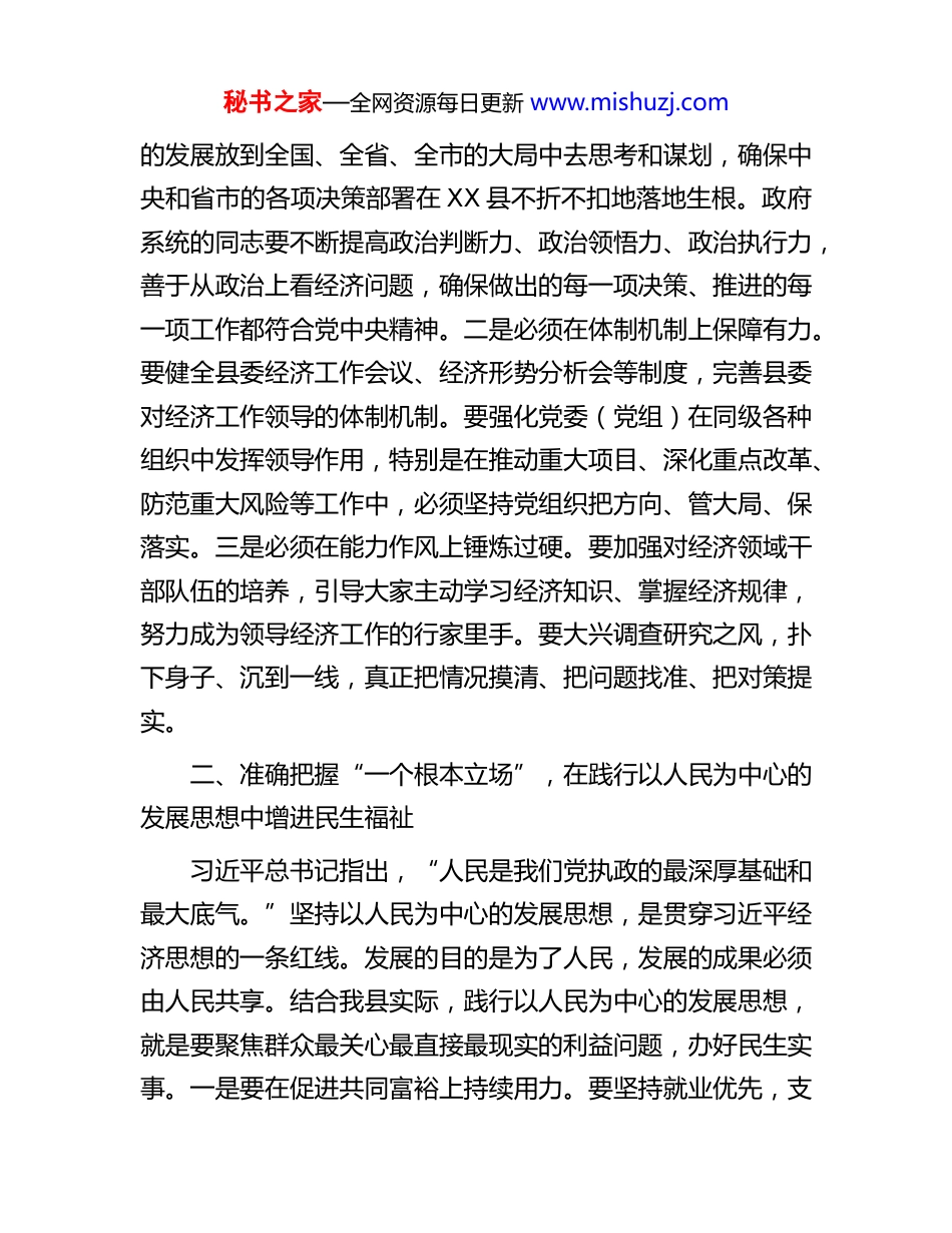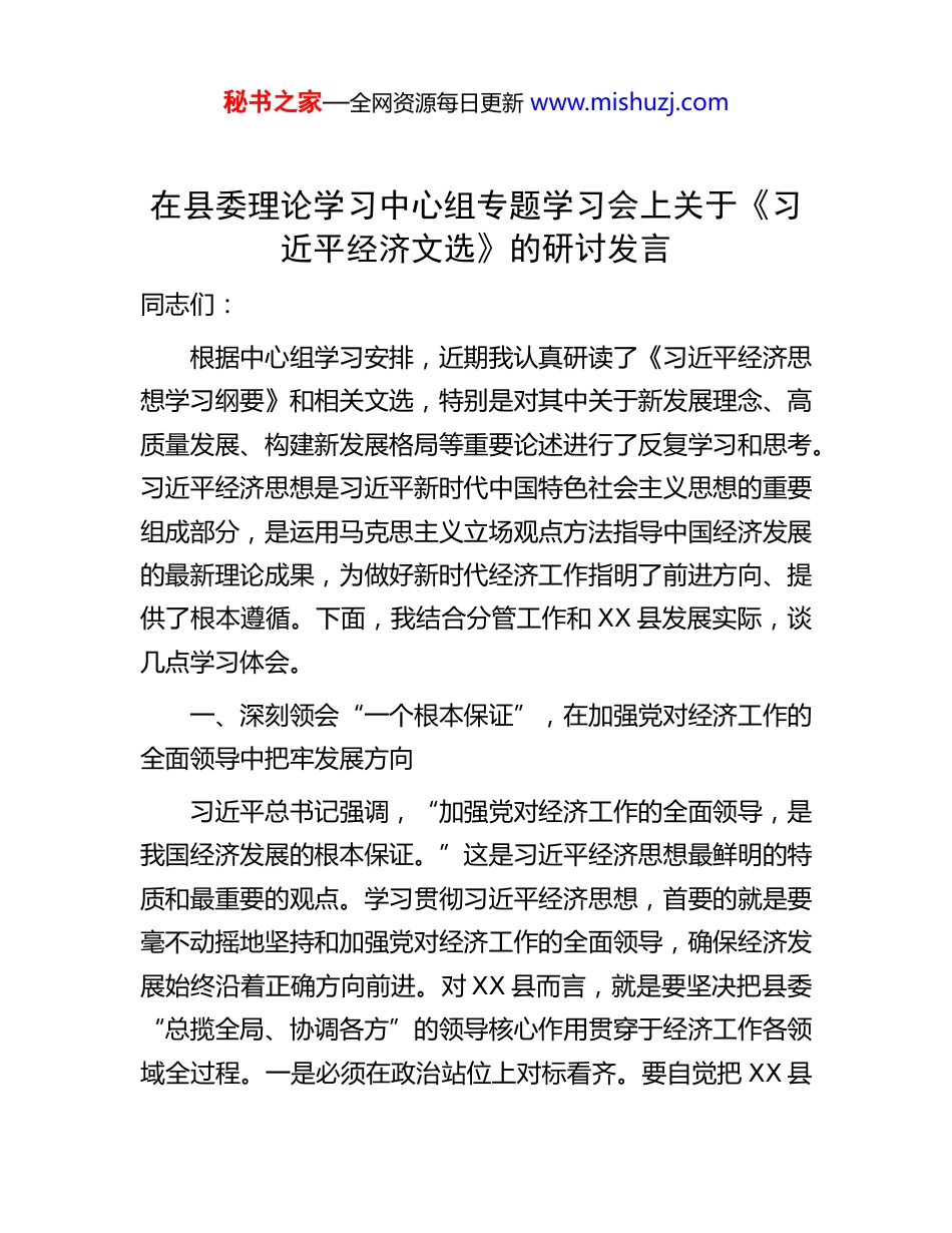 秘书之家—全网资源每日更新 www.mishuzj.com在县委理论学习中心组专题学习会上关于《习近平经济文选》的研讨发言同志们:根据中心组学习安排,近期我认真研读了《习近平经济思想学习纲要》和相关文选,特别是对其中关于新发展理念、高质量发展、构建新发展格局等重要论述进行了反复学习和思考。习近平经济思想是习近平新时代中国特色社会主义思想的重要组成部分,是运用马克思主义立场观点方法指导中国经济发展的最新理论成果,为做好新时代经济工作指明了前进方向、提供了根本遵循。下面,我结合分管工作和 XX 县发展实际,谈几点学习体会。一、深刻领会“一个根本保证”,在加强党对经济工作的全面领导中把牢发展方向习近平总书记强调,“加强党对经济工作的全面领导,是我国经济发展的根本保证。”这是习近平经济思想最鲜明的特质和最重要的观点。学习贯彻习近平经济思想,首要的就是要毫不动摇地坚持和加强党对经济工作的全面领导,确保经济发展始终沿着正确方向前进。对 XX 县而言,就是要坚决把县委“总揽全局、协调各方”的领导核心作用贯穿于经济工作各领域全过程。一是必须在政治站位上对标看齐。要自觉把 XX 县秘书之家—全网资源每日更新 www.mishuzj.com的发展放到全国、全省、全市的大局中去思考和谋划,确保中央和省市的各项决策部署在 XX 县不折不扣地落地生根。政府系统的同志要不断提高政治判断力、政治领悟力、政治执行力,善于从政治上看经济问题,确保做出的每一项决策、推进的每一项工作都符合党中央精神。二是必须在体制机制上保障有力。要健全县委经济工作会议、经济形势分析会等制度,完善县委对经济工作领导的体制机制。要强化党委(党组)在同级各种组织中发挥领导作用,特别是在推动重大项目、深化重点改革、防范重大风险等工作中,必须坚持党组织把方向、管大局、保落实。三是必须在能力作风上锤炼过硬。要加强对经济领域干部队伍的培养,引导大家主动学习经济知识、掌握经济规律,努力成为领导经济工作的行家里手。要大兴调查研究之风,扑下身子、沉到一线,真正把情况摸清、把问题找准、把对策提实。二、准确把握“一个根本立场”,在践行以人民为中心的发展思想中增进民生福祉习近平总书记指出,“人民是我们党执政的最深厚基础和最大底气。”坚持以人民为中心的发展思想,是贯穿习近平经济思想的一条红线。发展的目的是为了人民,发展的成果必须由人民共享。结合我县实际,践行以人民为中心的发展思想,就是要聚焦群众最关心最直接最现实的利益问题,办好民生实事。一是要在促进共同富裕上持续用力。要坚持就业优先,支秘书之家—全网资源每日更新 www.mishuzj.com持多渠道灵活就业,确保零就业家庭动态清零。要大力发展县域富民产业,完善利益联结机制,让更多群众在家门口实现增收致富。要健全社会保障体系,兜住、兜准、兜牢民生底线。二是要在提升公共服务品质上持续用力。要深入推进教育、医疗、养老等领域的改革,努力解决好群众“上好学、看好病、养好老”等急难愁盼问题。要加快补齐城乡基础设施短板,推进城乡基本公共服务均等化。三是要在创造优美生态环境上持续用力。要牢固树立和践行“绿水青山就是金山银山”的理念,协同推进降碳、减污、扩绿、增长,打好蓝天、碧水、净土保卫战,让优良生态环境成为人民幸福生活的增长点。三、深入贯彻“一个新发展理念”,在推动高质量发展中加快转型升级新发展理念是习近平经济思想的主要内容,是管全局、管根本、管长远的战略指引。创新、协调、绿色、开放、共享的发展理念,系统回答了关于发展的目的、动力、方式、路径等一系列理论和实践问题。当前,XX 县正处于传统动能减弱、新动能培育的关键时期,必须坚定不移用新发展理念引领发展行动。一是要以“创新”激活力。要把创新摆在发展的核心位置,大力实施创新驱动发展战略。要强化企业创新主体地位,支持企业建设研发平台,开展关键核心技术攻关。要优化人才发展环境,积极引进和培育高层次创新人才和团队。二是要以“协调”促均衡。要深入实施乡村振兴战略,促进城乡融合发秘书之家—全网资源每日更新 www.mishuzj.com展。要...