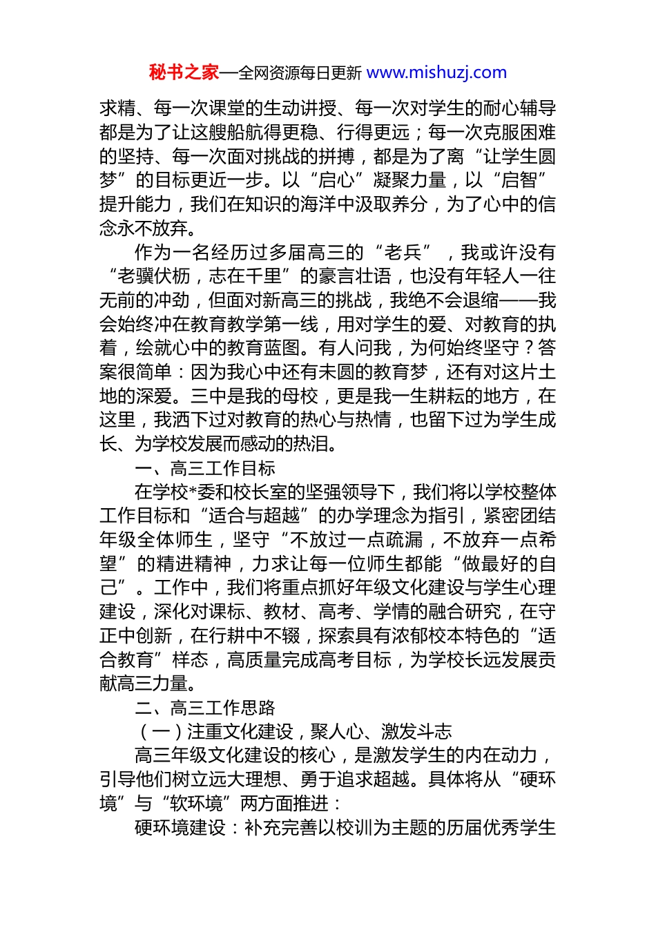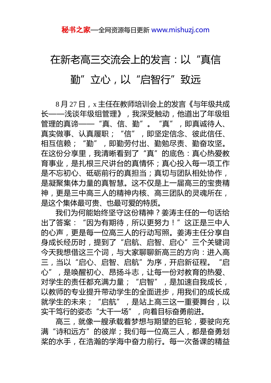 秘书之家—全网资源每日更新 www.mishuzj.com在新老高三交流会上的发言:以“真信勤”立心,以“启智行”致远8 月 27 日,x 主任在教师培训会上的发言《与年级共成长——浅谈年级组管理》,我深受触动,他道出了年级组管理的真谛——“真、信、勤”。“真”,即真诚待人、真实做事、认真履职;“信”,即坚定信念、彼此信任、相互信赖;“勤”,即勤劳付出、勤勉尽责、勤奋攻坚。在这份分享里,我清晰看到了“真”的底色:真心热爱教育事业,是扎根三尺讲台的真情怀;真心投入每一项工作是不忘初心、砥砺前行的真担当;真切与团队相处协作,是凝聚集体力量的真智慧。这不仅是上一届高三的宝贵精神,更是三中高三人的精神内核、高三团队的灵魂所在,是这个集体最可贵、也最可爱的特质。我们为何能始终坚守这份精神?姜涛主任的一句话给出了答案:“因为有期待,所以更努力!”这正是三中人的心声,更是每一位高三人的行动写照。姜涛主任分享自身成长经历时,提到了“启航、启智、启心”三个关键词今天我想借这三个词,与大家聊聊新高三的方向:进入高三,当以“启心、启智、启航”为序,开启新征程。“启心”,是唤醒初心、昂扬斗志,让每一份对教育的热爱、对学生的责任都充满力量;“启智”,是加速自我成长,以教师的专业提升带动学生的全面进步,用我们的成长成就学生的未来;“启航”,是站上高三这一重要舞台,以实干笃行的姿态“大干一场”,向着目标奋勇前进。高三,就像一艘承载着梦想与期望的巨轮,要驶向充满“诗和远方”的彼岸;我们每一位高三人,都是奋勇划桨的水手,在浩瀚的学海中奋力前行。每一次备课的精益秘书之家—全网资源每日更新 www.mishuzj.com求精、每一次课堂的生动讲授、每一次对学生的耐心辅导都是为了让这艘船航得更稳、行得更远;每一次克服困难的坚持、每一次面对挑战的拼搏,都是为了离“让学生圆梦”的目标更近一步。以“启心”凝聚力量,以“启智”提升能力,我们在知识的海洋中汲取养分,为了心中的信念永不放弃。作为一名经历过多届高三的“老兵”,我或许没有“老骥伏枥,志在千里”的豪言壮语,也没有年轻人一往无前的冲劲,但面对新高三的挑战,我绝不会退缩——我会始终冲在教育教学第一线,用对学生的爱、对教育的执着,绘就心中的教育蓝图。有人问我,为何始终坚守?答案很简单:因为我心中还有未圆的教育梦,还有对这片土地的深爱。三中是我的母校,更是我一生耕耘的地方,在这里,我洒下过对教育的热心与热情,也留下过为学生成长、为学校发展而感动的热泪。一、高三工作目标在学校*委和校长室的坚强领导下,我们将以学校整体工作目标和“适合与超越”的办学理念为指引,紧密团结年级全体师生,坚守“不放过一点疏漏,不放弃一点希望”的精进精神,力求让每一位师生都能“做最好的自己”。工作中,我们将重点抓好年级文化建设与学生心理建设,深化对课标、教材、高考、学情的融合研究,在守正中创新,在行耕中不辍,探索具有浓郁校本特色的“适合教育”样态,高质量完成高考目标,为学校长远发展贡献高三力量。二、高三工作思路(一)注重文化建设,聚人心、激发斗志高三年级文化建设的核心,是激发学生的内在动力,引导他们树立远大理想、勇于追求超越。具体将从“硬环境”与“软环境”两方面推进:硬环境建设:补充完善以校训为主题的历届优秀学生秘书之家—全网资源每日更新 www.mishuzj.com展示区,让榜样力量可视化;指导各班围绕年级要求布置班级文化与宿舍文化,在保持年级统一性的同时,鼓励班级突出特色,打造“一班一品牌”的文化氛围。软环境建设:围绕“梦想?奋斗?团结?感恩”主题,结合重要节日(如教师节、元旦、成人礼)与高三关键节点(如一轮复习启动、模考冲刺),开展系列主题活动,让文化浸润日常,让精神融入成长,凝聚师生共识,点燃奋斗激情。(二)注重教与学,着力提高教学质量1.以静制动,保持管理的定力教学管理是一门兼顾智慧与从容的艺术。管理者首先要管好自身情绪,避免“见风就是雨”,管理者的情绪波动,会给团队带来显著的负面影响。因此,教学管理既要“动”(主动作为、及时调整),...