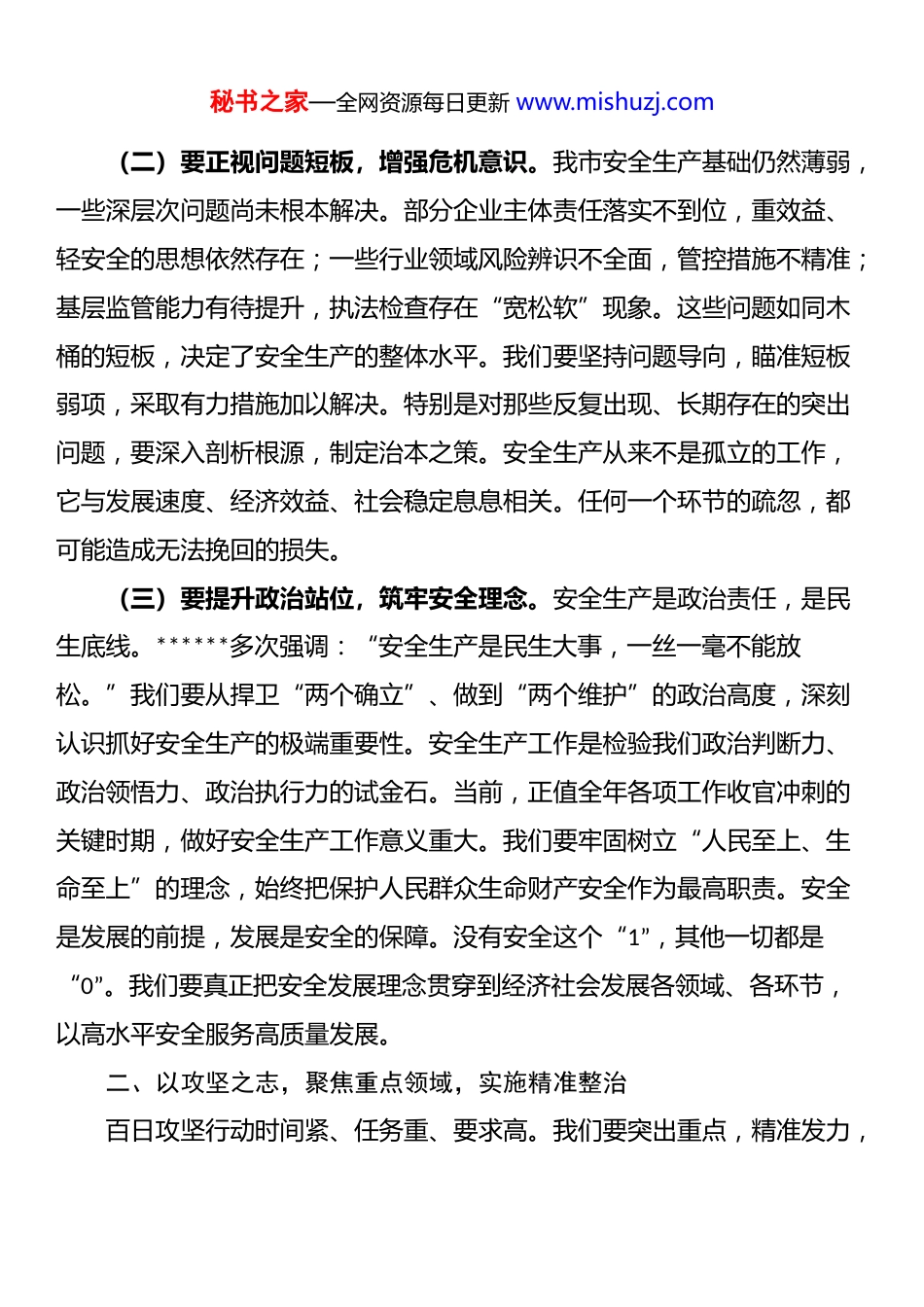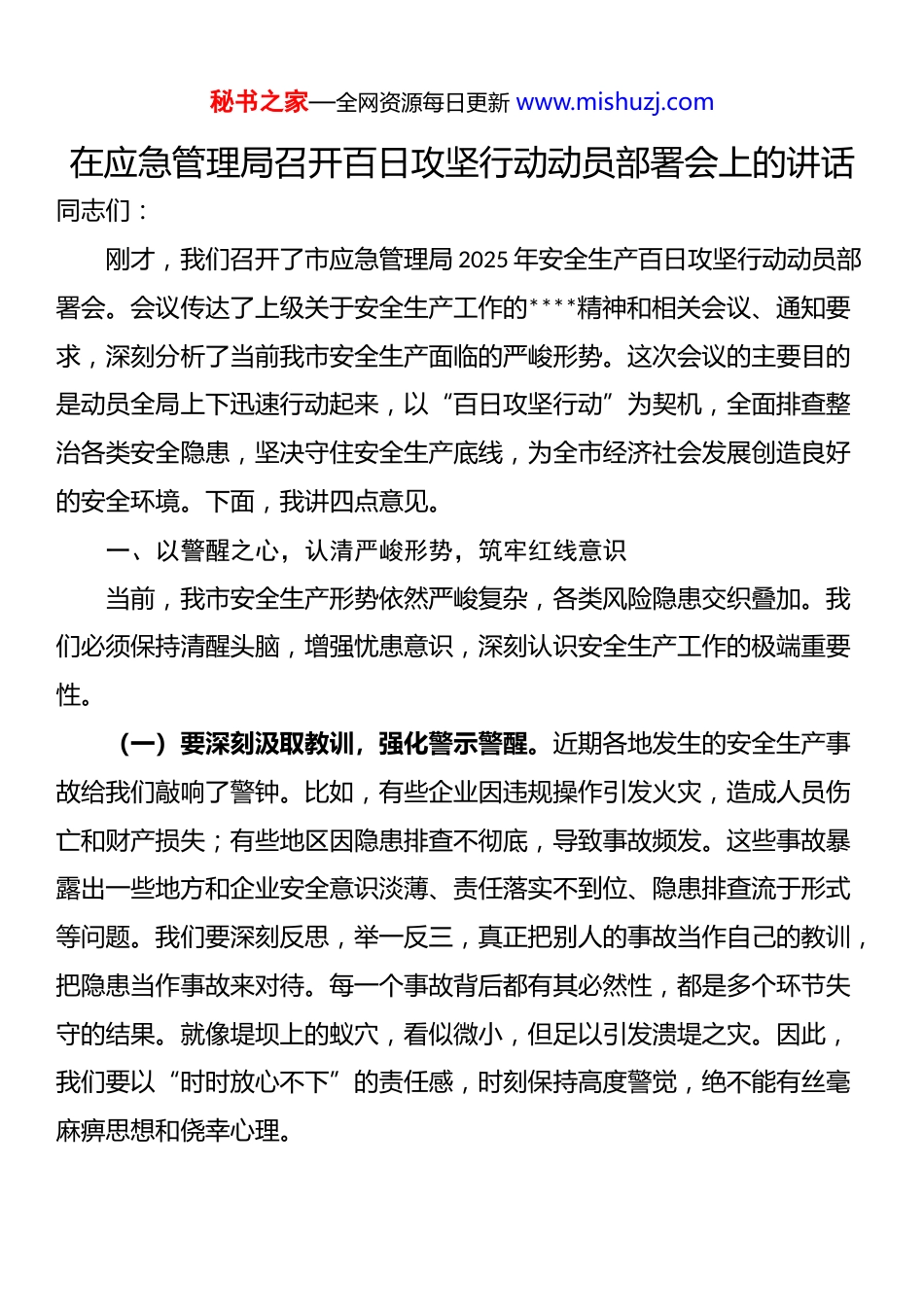 秘书之家—全网资源每日更新 www.mishuzj.com在应急管理局召开百日攻坚行动动员部署会上的讲话同志们:刚才,我们召开了市应急管理局 2025 年安全生产百日攻坚行动动员部署会。会议传达了上级关于安全生产工作的****精神和相关会议、通知要求,深刻分析了当前我市安全生产面临的严峻形势。这次会议的主要目的是动员全局上下迅速行动起来,以“百日攻坚行动”为契机,全面排查整治各类安全隐患,坚决守住安全生产底线,为全市经济社会发展创造良好的安全环境。下面,我讲四点意见。一、以警醒之心,认清严峻形势,筑牢红线意识当前,我市安全生产形势依然严峻复杂,各类风险隐患交织叠加。我们必须保持清醒头脑,增强忧患意识,深刻认识安全生产工作的极端重要性。(一)要深刻汲取教训,强化警示警醒。近期各地发生的安全生产事故给我们敲响了警钟。比如,有些企业因违规操作引发火灾,造成人员伤亡和财产损失;有些地区因隐患排查不彻底,导致事故频发。这些事故暴露出一些地方和企业安全意识淡薄、责任落实不到位、隐患排查流于形式等问题。我们要深刻反思,举一反三,真正把别人的事故当作自己的教训,把隐患当作事故来对待。每一个事故背后都有其必然性,都是多个环节失守的结果。就像堤坝上的蚁穴,看似微小,但足以引发溃堤之灾。因此,我们要以“时时放心不下”的责任感,时刻保持高度警觉,绝不能有丝毫麻痹思想和侥幸心理。秘书之家—全网资源每日更新 www.mishuzj.com(二)要正视问题短板,增强危机意识。我市安全生产基础仍然薄弱,一些深层次问题尚未根本解决。部分企业主体责任落实不到位,重效益、轻安全的思想依然存在;一些行业领域风险辨识不全面,管控措施不精准;基层监管能力有待提升,执法检查存在“宽松软”现象。这些问题如同木桶的短板,决定了安全生产的整体水平。我们要坚持问题导向,瞄准短板弱项,采取有力措施加以解决。特别是对那些反复出现、长期存在的突出问题,要深入剖析根源,制定治本之策。安全生产从来不是孤立的工作,它与发展速度、经济效益、社会稳定息息相关。任何一个环节的疏忽,都可能造成无法挽回的损失。(三)要提升政治站位,筑牢安全理念。安全生产是政治责任,是民生底线。******多次强调:“安全生产是民生大事,一丝一毫不能放松。”我们要从捍卫“两个确立”、做到“两个维护”的政治高度,深刻认识抓好安全生产的极端重要性。安全生产工作是检验我们政治判断力、政治领悟力、政治执行力的试金石。当前,正值全年各项工作收官冲刺的关键时期,做好安全生产工作意义重大。我们要牢固树立“人民至上、生命至上”的理念,始终把保护人民群众生命财产安全作为最高职责。安全是发展的前提,发展是安全的保障。没有安全这个“1”,其他一切都是“0”。我们要真正把安全发展理念贯穿到经济社会发展各领域、各环节,以高水平安全服务高质量发展。二、以攻坚之志,聚焦重点领域,实施精准整治百日攻坚行动时间紧、任务重、要求高。我们要突出重点,精准发力,秘书之家—全网资源每日更新 www.mishuzj.com确保攻坚行动取得实实在在的成效。(一)要聚焦消防燃气,开展拉网式排查。消防和燃气安全事关人民群众生命财产安全,是百日攻坚的重中之重。要针对冬季火灾特点,加强对人员密集场所、商场超市、宾馆饭店、“三合一”场所等的消防安全检查。重点检查消防设施是否完好有效、疏散通道是否畅通、电气线路是否规范等问题。对于燃气安全,要重点整治 20 年以上老化燃气管道带病运行、管道被占压、场站安全间距不足等问题。要全面推进燃气入户检查,加快老化管道更新改造,严厉打击非法充装、非法经营等行为。检查要真正做到“横向到边、纵向到底”,不留死角、不留盲区。对发现的隐患要建立台账,实行清单式管理,整改一处、销号一处。要通过我们的努力,让每一个消防设施都完好有效,每一条疏散通道都畅通无阻,每一段燃气管线都安全可靠。(二)要紧盯危化矿山,强化源头管控。危险化学品和矿山是高风险领域,必须严加管控。要全面加强危险化学品生产、储存、运输、使用等各环节安全管理,特别要强化对石油化工、氯碱、合成...