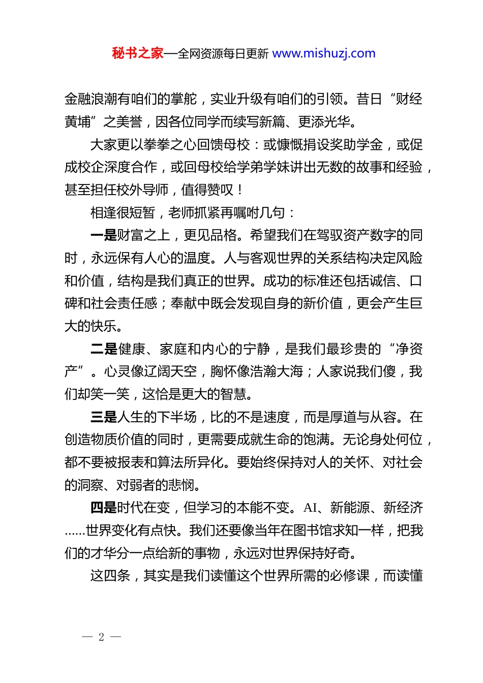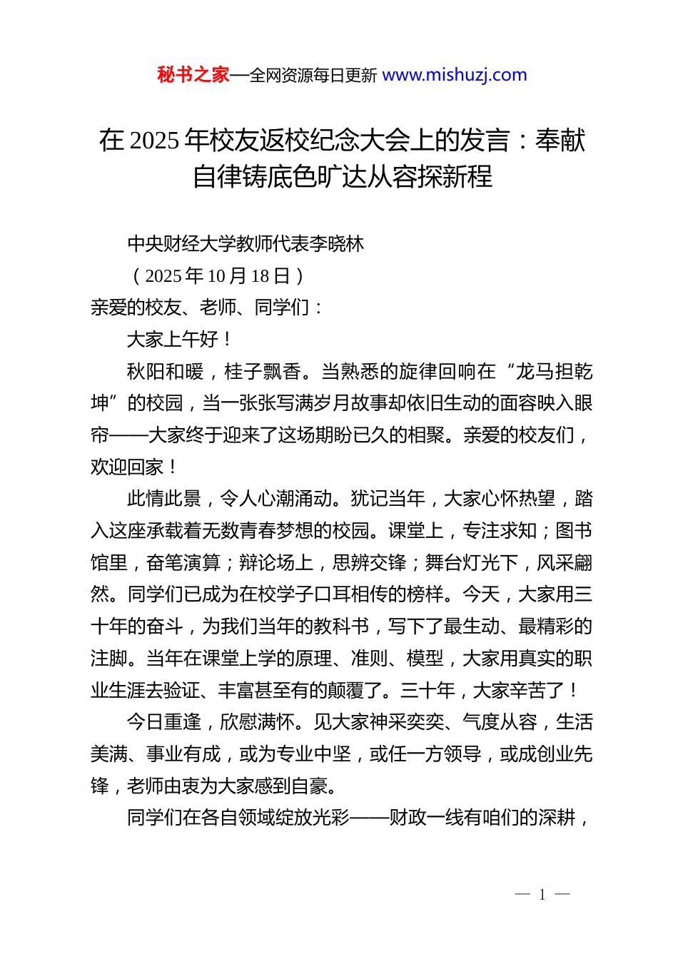 秘书之家—全网资源每日更新 www.mishuzj.com在 2025 年校友返校纪念大会上的发言:奉献自律铸底色旷达从容探新程中央财经大学教师代表李晓林(2025 年 10 月 18 日)亲爱的校友、老师、同学们:大家上午好!秋阳和暖,桂子飘香。当熟悉的旋律回响在“龙马担乾坤”的校园,当一张张写满岁月故事却依旧生动的面容映入眼帘——大家终于迎来了这场期盼已久的相聚。亲爱的校友们,欢迎回家!此情此景,令人心潮涌动。犹记当年,大家心怀热望,踏入这座承载着无数青春梦想的校园。课堂上,专注求知;图书馆里,奋笔演算;辩论场上,思辨交锋;舞台灯光下,风采翩然。同学们已成为在校学子口耳相传的榜样。今天,大家用三十年的奋斗,为我们当年的教科书,写下了最生动、最精彩的注脚。当年在课堂上学的原理、准则、模型,大家用真实的职业生涯去验证、丰富甚至有的颠覆了。三十年,大家辛苦了!今日重逢,欣慰满怀。见大家神采奕奕、气度从容,生活美满、事业有成,或为专业中坚,或任一方领导,或成创业先锋,老师由衷为大家感到自豪。同学们在各自领域绽放光彩——财政一线有咱们的深耕,— 1 —秘书之家—全网资源每日更新 www.mishuzj.com金融浪潮有咱们的掌舵,实业升级有咱们的引领。昔日“财经黄埔”之美誉,因各位同学而续写新篇、更添光华。大家更以拳拳之心回馈母校:或慷慨捐设奖助学金,或促成校企深度合作,或回母校给学弟学妹讲出无数的故事和经验,甚至担任校外导师,值得赞叹!相逢很短暂,老师抓紧再嘱咐几句:一是财富之上,更见品格。希望我们在驾驭资产数字的同时,永远保有人心的温度。人与客观世界的关系结构决定风险和价值,结构是我们真正的世界。成功的标准还包括诚信、口碑和社会责任感;奉献中既会发现自身的新价值,更会产生巨大的快乐。二是健康、家庭和内心的宁静,是我们最珍贵的“净资产”。心灵像辽阔天空,胸怀像浩瀚大海;人家说我们傻,我们却笑一笑,这恰是更大的智慧。三是人生的下半场,比的不是速度,而是厚道与从容。在创造物质价值的同时,更需要成就生命的饱满。无论身处何位,都不要被报表和算法所异化。要始终保持对人的关怀、对社会的洞察、对弱者的悲悯。四是时代在变,但学习的本能不变。AI、新能源、新经济……世界变化有点快。我们还要像当年在图书馆求知一样,把我们的才华分一点给新的事物,永远对世界保持好奇。这四条,其实是我们读懂这个世界所需的必修课,而读懂— 2 —秘书之家—全网资源每日更新 www.mishuzj.com的程度,是我们哲学底色的深厚,也是未来与 AI 时代柔和相处的阶梯高度。还要叮嘱的是,同学们无论辉煌还是平淡,都是母校的赤子,也是后学的灯塔。新的时代栋梁、学校新的辉煌,也将在大家的关心下铸就。而母校和老师,永远是可以停靠的港湾。常回家吧!最后,愿我们此行重温青春,前程似锦,阖家安康!愿中财与时代共进,华章再续!下面是《满江红•贺校友返校》:南路秋深,正弦歌、风云际会。抬望眼、群英列位,气凌霄汉。昔著黄埔传四海,今擎国计安黎元。守初心、忠毅刻丹襟,同磨炼。财政固,邦基璨?;金融锐,长空贯。看会计经纬,锦绣铺展。经管纵横筹大局,保险精算扶危难。基财筑业稳如山,乾坤转。待来日、并辔昆仑巅,鹏程远!祝福大家!— 3 —