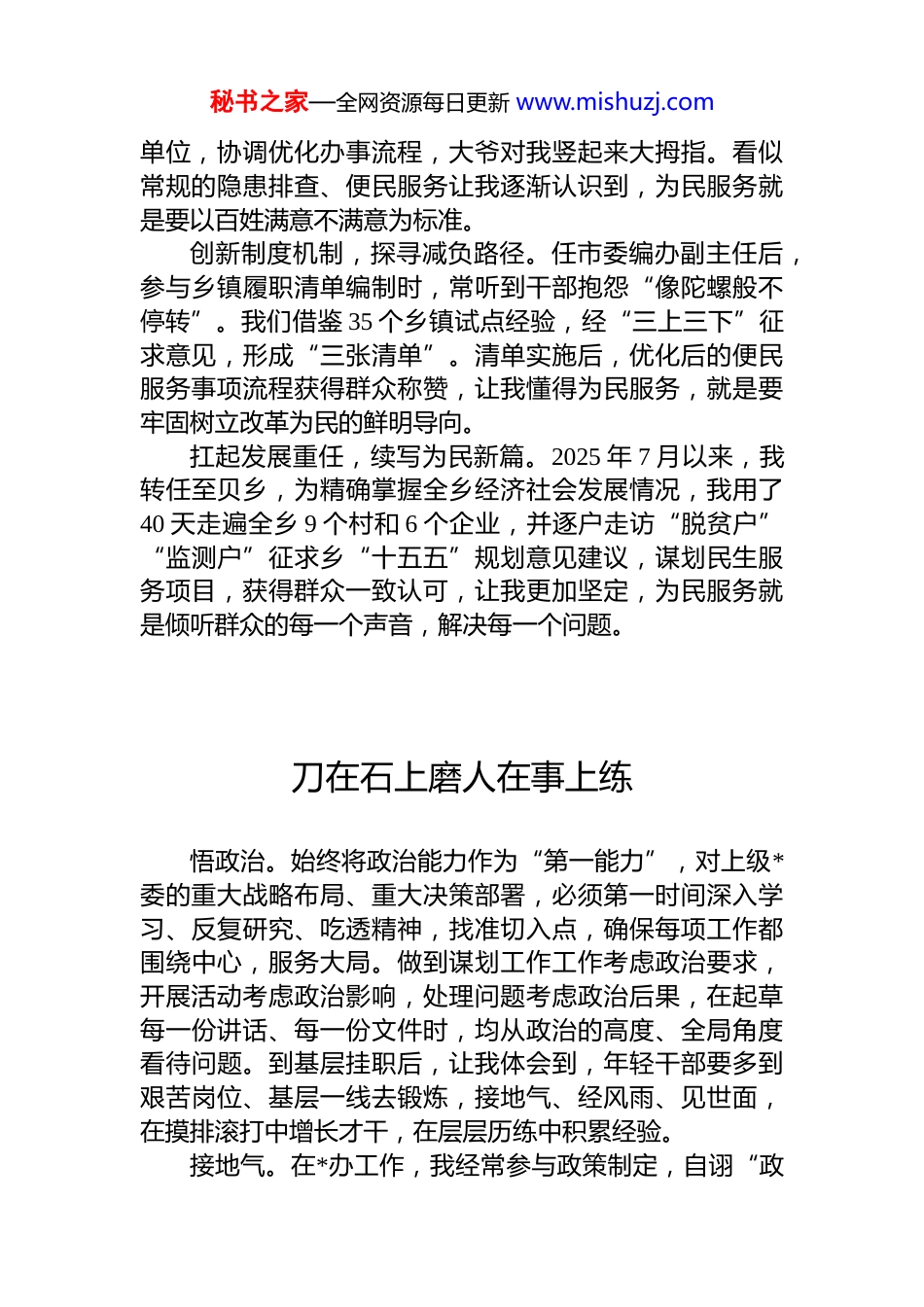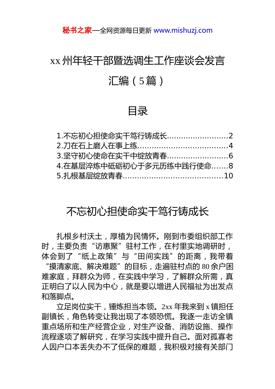 秘书之家—全网资源每日更新 www.mishuzj.comxx 州年轻干部暨选调生工作座谈会发言汇编(5 篇)目录1.不忘初心担使命实干笃行铸成长..........................22.刀在石上磨人在事上练......................................43.坚守初心使命在实干中绽放青春..........................64.在基层淬炼中砥砺初心于多元历练中践行使命.......85.扎根基层绽放青春..........................................10不忘初心担使命实干笃行铸成长扎根乡村沃土,厚植为民情怀。刚到市委组织部工作时,主要负责“访惠聚”驻村工作,在村里实地调研时,体会到了“纸上政策”与“田间实践”的距离,我带着“摸清家底、解决难题”的目标,走遍驻村点的 80 余户困难家庭,拜群众为师,在实践中学习,了解群众所需,真正明白了以人民为中心,就是要以增进人民福祉为出发点和落脚点。立足岗位实干,锤炼担当本领。2xx 年我来到 x 镇担任副镇长,角色转变让我出现了本领恐慌。我逐一走访全镇重点场所和生产经营企业,对生产设备、消防设施、操作流程逐项了解研究,在学习实践中提升自己。面对孤寡老人因户口本丢失办不了低保的难题,我积极对接有关部门秘书之家—全网资源每日更新 www.mishuzj.com单位,协调优化办事流程,大爷对我竖起来大拇指。看似常规的隐患排查、便民服务让我逐渐认识到,为民服务就是要以百姓满意不满意为标准。创新制度机制,探寻减负路径。任市委编办副主任后,参与乡镇履职清单编制时,常听到干部抱怨“像陀螺般不停转”。我们借鉴 35 个乡镇试点经验,经“三上三下”征求意见,形成“三张清单”。清单实施后,优化后的便民服务事项流程获得群众称赞,让我懂得为民服务,就是要牢固树立改革为民的鲜明导向。扛起发展重任,续写为民新篇。2025 年 7 月以来,我转任至贝乡,为精确掌握全乡经济社会发展情况,我用了40 天走遍全乡 9 个村和 6 个企业,并逐户走访“脱贫户”“监测户”征求乡“十五五”规划意见建议,谋划民生服务项目,获得群众一致认可,让我更加坚定,为民服务就是倾听群众的每一个声音,解决每一个问题。刀在石上磨人在事上练悟政治。始终将政治能力作为“第一能力”,对上级*委的重大战略布局、重大决策部署,必须第一时间深入学习、反复研究、吃透精神,找准切入点,确保每项工作都围绕中心,服务大局。做到谋划工作工作考虑政治要求,开展活动考虑政治影响,处理问题考虑政治后果,在起草每一份讲话、每一份文件时,均从政治的高度、全局角度看待问题。到基层挂职后,让我体会到,年轻干部要多到艰苦岗位、基层一线去锻炼,接地气、经风雨、见世面,在摸排滚打中增长才干,在层层历练中积累经验。接地气。在*办工作,我经常参与政策制定,自诩“政秘书之家—全网资源每日更新 www.mishuzj.com策通”,但在基层实践中却屡屡碰壁。有次面对村民关于土地流转的激烈争论,我照搬上级文件答复,结果引发质疑,这让我意识到,闭门造车的决策无异于“空中楼阁”到基层后,我坚持“深实细准效”,走遍全镇 19 个村队,摸实情、查实况、探真需,为推进乡村振兴示范村建设奠定了坚实基础。从“闭门想”到“出门访”,让我懂得,只有把办公桌搬到田间地头,才能听到真话、察到实情、出得实招、求得实效。破难题。机关工作侧重程序规范,而基层工作需要解决难题。面对所在乡镇建筑垃圾随意倾倒的突出问题,经过实地考察、全方位地形地貌勘察,提出施工方将建筑垃圾倾倒入镇区老砖场天然矿坑后进行覆土的思路,在解决问题的同时,也将矿坑变成了可利用土地。从“堵”到“疏”,让我体会到,改革攻坚既要讲政策原则,更要冲破思想观念束缚,始终做到守正创新。办实事。到基层后,我牵头建立“民生台账”,推动解决 9 件民生实事,特别是今年发生旱情时,面对一个牧业村 6000 亩地连续一周未浇水的急难问题,第一时间向上级部门报备,驻扎现场及时解决问题,实现 15 天新打 4 口井,最大限度减少旱情影响,降低群众损失。从“案头”到“地头”,让我明白,群众工作能力的提升,关键在于把“群众满不满意”作为工作标尺。坚守初心使命在...