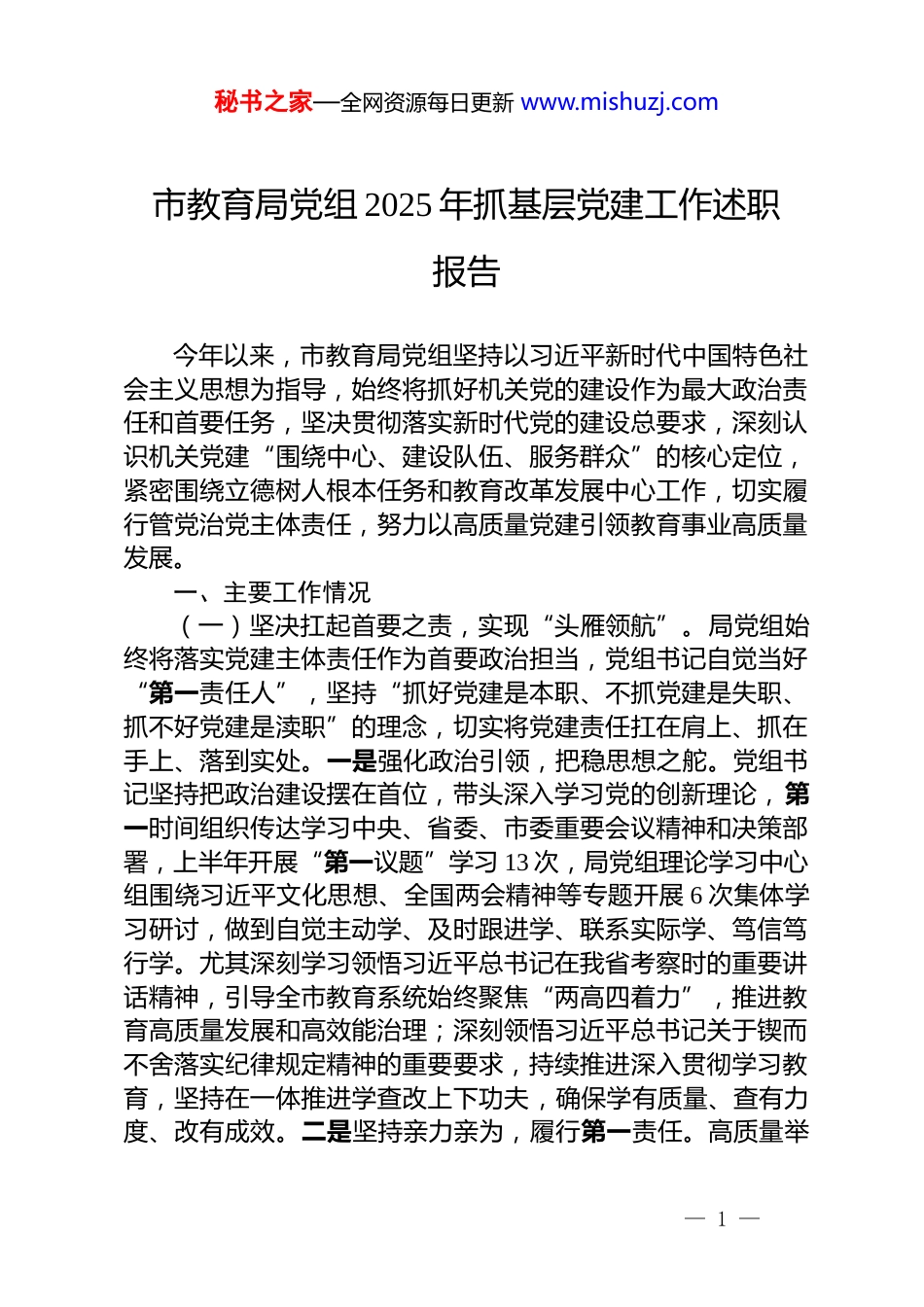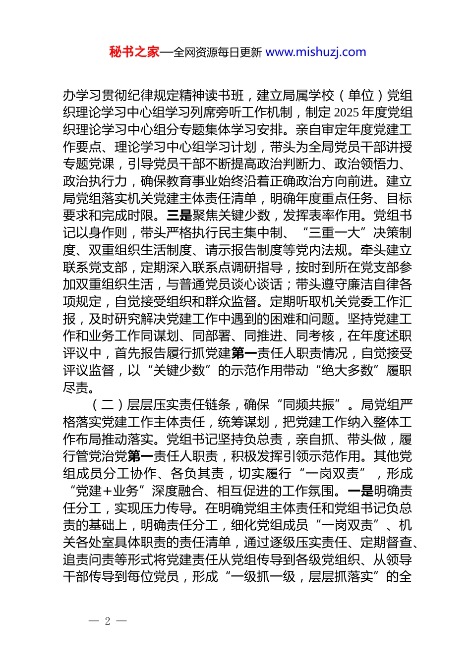 秘书之家—全网资源每日更新 www.mishuzj.com市教育局党组 2025 年抓基层党建工作述职报告今年以来,市教育局党组坚持以习近平新时代中国特色社会主义思想为指导,始终将抓好机关党的建设作为最大政治责任和首要任务,坚决贯彻落实新时代党的建设总要求,深刻认识机关党建“围绕中心、建设队伍、服务群众”的核心定位,紧密围绕立德树人根本任务和教育改革发展中心工作,切实履行管党治党主体责任,努力以高质量党建引领教育事业高质量发展。一、主要工作情况(一)坚决扛起首要之责,实现“头雁领航”。局党组始终将落实党建主体责任作为首要政治担当,党组书记自觉当好“第一责任人”,坚持“抓好党建是本职、不抓党建是失职、抓不好党建是渎职”的理念,切实将党建责任扛在肩上、抓在手上、落到实处。一是强化政治引领,把稳思想之舵。党组书记坚持把政治建设摆在首位,带头深入学习党的创新理论,第一时间组织传达学习中央、省委、市委重要会议精神和决策部署,上半年开展“第一议题”学习 13 次,局党组理论学习中心组围绕习近平文化思想、全国两会精神等专题开展 6 次集体学习研讨,做到自觉主动学、及时跟进学、联系实际学、笃信笃行学。尤其深刻学习领悟习近平总书记在我省考察时的重要讲话精神,引导全市教育系统始终聚焦“两高四着力”,推进教育高质量发展和高效能治理;深刻领悟习近平总书记关于锲而不舍落实纪律规定精神的重要要求,持续推进深入贯彻学习教育,坚持在一体推进学查改上下功夫,确保学有质量、查有力度、改有成效。二是坚持亲力亲为,履行第一责任。高质量举— 1 —秘书之家—全网资源每日更新 www.mishuzj.com办学习贯彻纪律规定精神读书班,建立局属学校(单位)党组织理论学习中心组学习列席旁听工作机制,制定 2025 年度党组织理论学习中心组分专题集体学习安排。亲自审定年度党建工作要点、理论学习中心组学习计划,带头为全局党员干部讲授专题党课,引导党员干部不断提高政治判断力、政治领悟力、政治执行力,确保教育事业始终沿着正确政治方向前进。建立局党组落实机关党建主体责任清单,明确年度重点任务、目标要求和完成时限。三是聚焦关键少数,发挥表率作用。党组书记以身作则,带头严格执行民主集中制、“三重一大”决策制度、双重组织生活制度、请示报告制度等党内法规。牵头建立联系党支部,定期深入联系点调研指导,按时到所在党支部参加双重组织生活,与普通党员谈心谈话;带头遵守廉洁自律各项规定,自觉接受组织和群众监督。定期听取机关党委工作汇报,及时研究解决党建工作中遇到的困难和问题。坚持党建工作和业务工作同谋划、同部署、同推进、同考核,在年度述职评议中,首先报告履行抓党建第一责任人职责情况,自觉接受评议监督,以“关键少数”的示范作用带动“绝大多数”履职尽责。(二)层层压实责任链条,确保“同频共振”。局党组严格落实党建工作主体责任,统筹谋划,把党建工作纳入整体工作布局推动落实。党组书记坚持负总责,亲自抓、带头做,履行管党治党第一责任人职责,积极发挥引领示范作用。其他党组成员分工协作、各负其责,切实履行“一岗双责”,形成“党建+业务”深度融合、相互促进的工作氛围。一是明确责任分工,实现压力传导。在明确党组主体责任和党组书记负总责的基础上,明确责任分工,细化党组成员“一岗双责”、机关各处室具体职责的责任清单,通过逐级压实责任、定期督查、追责问责等形式将党建责任从党组传导到各级党组织、从领导干部传导到每位党员,形成“一级抓一级,层层抓落实”的全— 2 —秘书之家—全网资源每日更新 www.mishuzj.com套链条,确保责任不落空、工作不松懈,各个环节有人抓、有人管。二是强化履职担当,融入日常管理。党组成员自觉将党建工作融入分管业务工作全过程。制定四大班子领导干部上讲台讲思政课实施方案。充分发挥教育信息网、官方微信微博等局属媒体平台的作用,设立全国两会精神宣讲专栏,开展好网上宣讲活动。建立局领导联系党支部制度,指导所在党支部及联系党支部规范开展组织生活、加强党员教育管理监督、抓好意识形态工作,每年至少 2 次听取分...