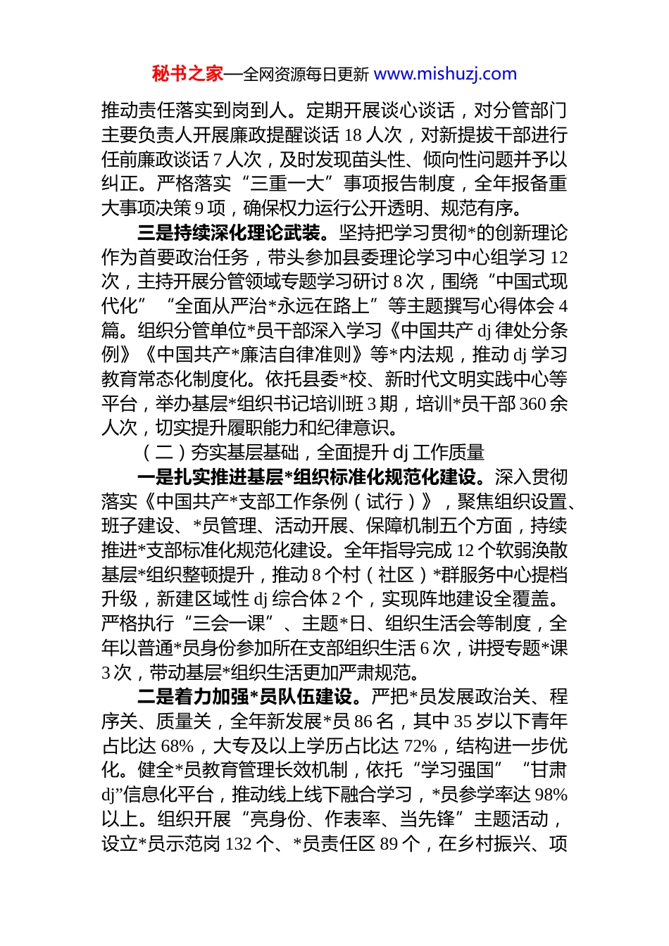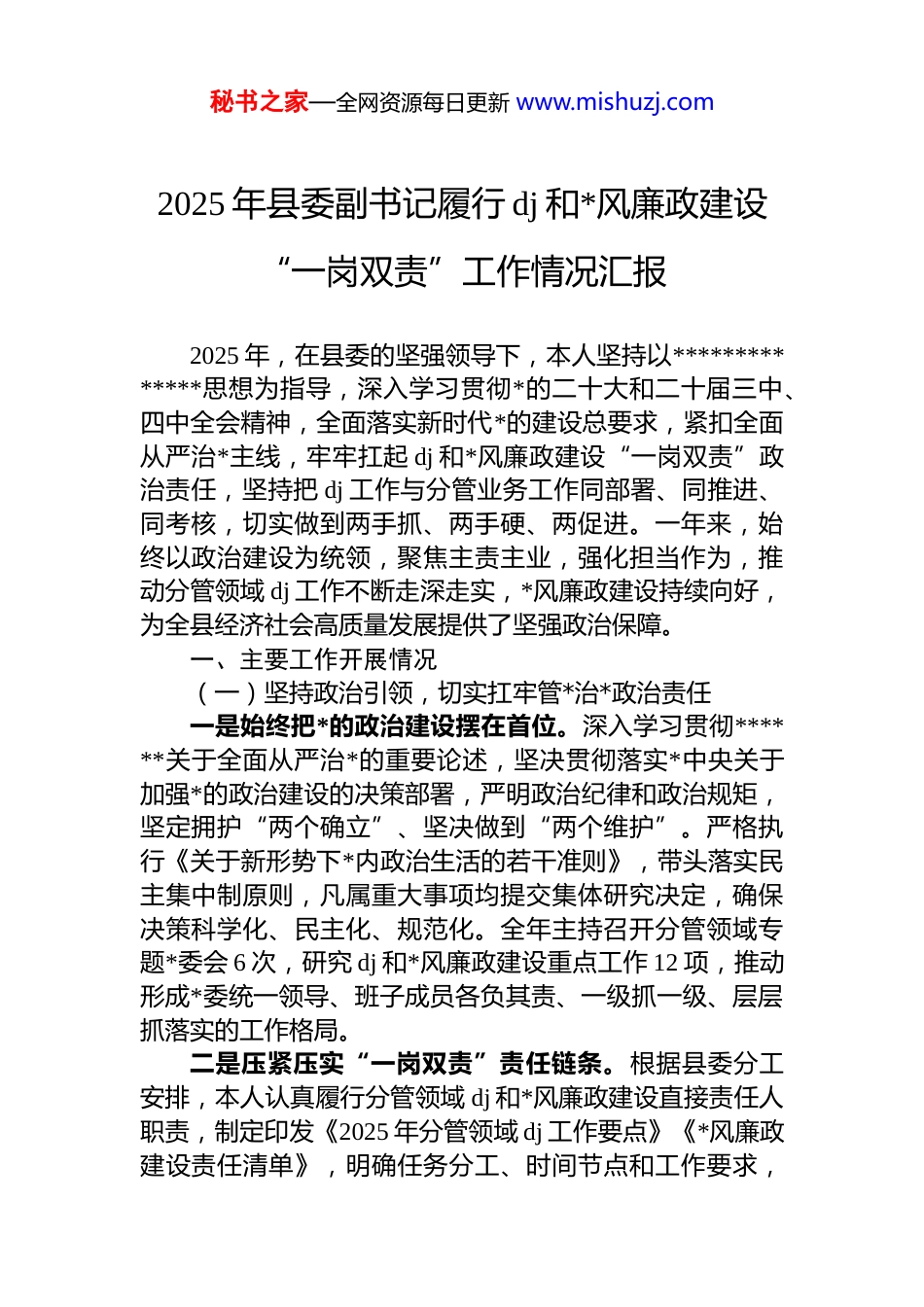 秘书之家—全网资源每日更新 www.mishuzj.com2025 年县委副书记履行 dj 和*风廉政建设“一岗双责”工作情况汇报2025 年,在县委的坚强领导下,本人坚持以**************思想为指导,深入学习贯彻*的二十大和二十届三中、四中全会精神,全面落实新时代*的建设总要求,紧扣全面从严治*主线,牢牢扛起 dj 和*风廉政建设“一岗双责”政治责任,坚持把 dj 工作与分管业务工作同部署、同推进、同考核,切实做到两手抓、两手硬、两促进。一年来,始终以政治建设为统领,聚焦主责主业,强化担当作为,推动分管领域 dj 工作不断走深走实,*风廉政建设持续向好,为全县经济社会高质量发展提供了坚强政治保障。一、主要工作开展情况(一)坚持政治引领,切实扛牢管*治*政治责任一是始终把*的政治建设摆在首位。深入学习贯彻******关于全面从严治*的重要论述,坚决贯彻落实*中央关于加强*的政治建设的决策部署,严明政治纪律和政治规矩,坚定拥护“两个确立”、坚决做到“两个维护”。严格执行《关于新形势下*内政治生活的若干准则》,带头落实民主集中制原则,凡属重大事项均提交集体研究决定,确保决策科学化、民主化、规范化。全年主持召开分管领域专题*委会 6 次,研究 dj 和*风廉政建设重点工作 12 项,推动形成*委统一领导、班子成员各负其责、一级抓一级、层层抓落实的工作格局。二是压紧压实“一岗双责”责任链条。根据县委分工安排,本人认真履行分管领域 dj 和*风廉政建设直接责任人职责,制定印发《2025 年分管领域 dj 工作要点》《*风廉政建设责任清单》,明确任务分工、时间节点和工作要求,秘书之家—全网资源每日更新 www.mishuzj.com推动责任落实到岗到人。定期开展谈心谈话,对分管部门主要负责人开展廉政提醒谈话 18 人次,对新提拔干部进行任前廉政谈话 7 人次,及时发现苗头性、倾向性问题并予以纠正。严格落实“三重一大”事项报告制度,全年报备重大事项决策 9 项,确保权力运行公开透明、规范有序。三是持续深化理论武装。坚持把学习贯彻*的创新理论作为首要政治任务,带头参加县委理论学习中心组学习 12次,主持开展分管领域专题学习研讨 8 次,围绕“中国式现代化”“全面从严治*永远在路上”等主题撰写心得体会 4篇。组织分管单位*员干部深入学习《中国共产 dj 律处分条例》《中国共产*廉洁自律准则》等*内法规,推动 dj 学习教育常态化制度化。依托县委*校、新时代文明实践中心等平台,举办基层*组织书记培训班 3 期,培训*员干部 360 余人次,切实提升履职能力和纪律意识。(二)夯实基层基础,全面提升 dj 工作质量一是扎实推进基层*组织标准化规范化建设。深入贯彻落实《中国共产*支部工作条例(试行)》,聚焦组织设置、班子建设、*员管理、活动开展、保障机制五个方面,持续推进*支部标准化规范化建设。全年指导完成 12 个软弱涣散基层*组织整顿提升,推动 8 个村(社区)*群服务中心提档升级,新建区域性 dj 综合体 2 个,实现阵地建设全覆盖。严格执行“三会一课”、主题*日、组织生活会等制度,全年以普通*员身份参加所在支部组织生活 6 次,讲授专题*课3 次,带动基层*组织生活更加严肃规范。二是着力加强*员队伍建设。严把*员发展政治关、程序关、质量关,全年新发展*员 86 名,其中 35 岁以下青年占比达 68%,大专及以上学历占比达 72%,结构进一步优化。健全*员教育管理长效机制,依托“学习强国”“甘肃dj”信息化平台,推动线上线下融合学习,*员参学率达 98%以上。组织开展“亮身份、作表率、当先锋”主题活动,设立*员示范岗 132 个、*员责任区 89 个,在乡村振兴、项秘书之家—全网资源每日更新 www.mishuzj.com目建设、基层治理一线发挥先锋模范作用。深化农村*员“双带头”行动,培育致富带头人*员 63 名,带动群众发展特色种植养殖项目 47 个,户均年增收超 1.2 万元。三是创新推进 dj 引领基层治理。坚持把 dj 贯穿基层治理全过程,深化“dj+网格”管理模式,全县划分城乡网格1876 个,配备专兼职网格员 2134 名,实现“人在格中走、事在格中办”。推广“红...