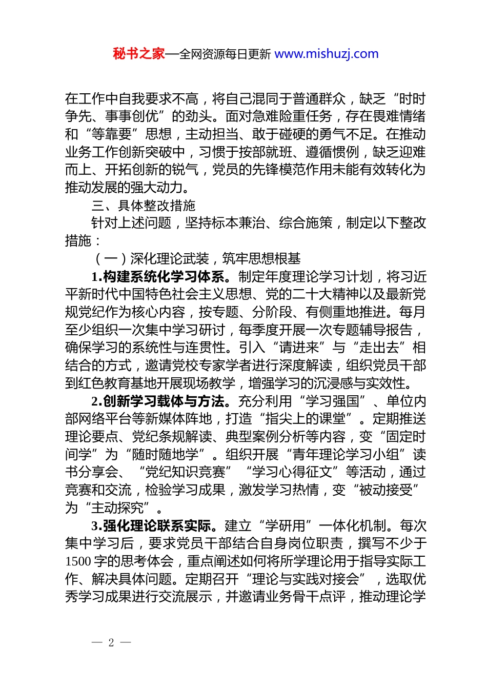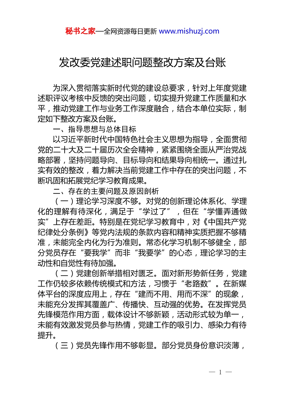 秘书之家—全网资源每日更新 www.mishuzj.com发改委党建述职问题整改方案及台账为深入贯彻落实新时代党的建设总要求,针对上年度党建述职评议考核中反馈的突出问题,切实提升党建工作质量和水平,推动党建工作与业务工作深度融合,结合本单位实际,制定如下整改方案及台账。一、指导思想与总体目标以习近平新时代中国特色社会主义思想为指导,全面贯彻党的二十大及二十届历次全会精神,紧紧围绕全面从严治党战略部署,坚持问题导向、目标导向和结果导向相统一。通过扎实有效的整改,着力解决当前党建工作中存在的突出问题,不断巩固和拓展党纪学习教育成果。二、存在的主要问题及原因剖析(一)理论学习深度不够。对党的创新理论体系化、学理化的理解有待深化,满足于“学过了”,但在“学懂弄通做实”上存在差距。特别是在党纪学习教育中,对《中国共产党纪律处分条例》等党内法规的条款内容和精神实质把握不够精准,未能完全内化为行为准则。常态化学习机制不够健全,部分党员存在“要我学”而非“我要学”的心态,理论学习的主动性和自觉性有待加强。(二)党建创新举措相对匮乏。面对新形势新任务,党建工作仍较多依赖传统模式和方法,习惯于“老路数”。在新媒体平台的深度应用上,存在“建而不用、用而不深”的现象,未能充分发挥其覆盖广、传播快、互动强的优势。在发挥党员先锋模范作用方面,载体设计不够新颖,活动形式较为单一,未能有效激发党员参与热情,党建工作的吸引力、感染力有待提升。(三)党员先锋作用不够彰显。部分党员身份意识淡薄,— 1 —秘书之家—全网资源每日更新 www.mishuzj.com在工作中自我要求不高,将自己混同于普通群众,缺乏“时时争先、事事创优”的劲头。面对急难险重任务,存在畏难情绪和“等靠要”思想,主动担当、敢于碰硬的勇气不足。在推动业务工作创新突破中,习惯于按部就班、遵循惯例,缺乏迎难而上、开拓创新的锐气,党员的先锋模范作用未能有效转化为推动发展的强大动力。三、具体整改措施针对上述问题,坚持标本兼治、综合施策,制定以下整改措施:(一)深化理论武装,筑牢思想根基1.构建系统化学习体系。制定年度理论学习计划,将习近平新时代中国特色社会主义思想、党的二十大精神以及最新党规党纪作为核心内容,按专题、分阶段、有侧重地推进。每月至少组织一次集中学习研讨,每季度开展一次专题辅导报告,确保学习的系统性与连贯性。引入“请进来”与“走出去”相结合的方式,邀请党校专家学者进行深度解读,组织党员干部到红色教育基地开展现场教学,增强学习的沉浸感与实效性。2.创新学习载体与方法。充分利用“学习强国”、单位内部网络平台等新媒体阵地,打造“指尖上的课堂”。定期推送理论要点、党纪条规解读、典型案例分析等内容,变“固定时间学”为“随时随地学”。组织开展“青年理论学习小组”读书分享会、“党纪知识竞赛”“学习心得征文”等活动,通过竞赛和交流,检验学习成果,激发学习热情,变“被动接受”为“主动探究”。3.强化理论联系实际。建立“学研用”一体化机制。每次集中学习后,要求党员干部结合自身岗位职责,撰写不少于1500 字的思考体会,重点阐述如何将所学理论用于指导实际工作、解决具体问题。定期召开“理论与实践对接会”,选取优秀学习成果进行交流展示,并邀请业务骨干点评,推动理论学— 2 —秘书之家—全网资源每日更新 www.mishuzj.com习成果向政策建议、改革方案、工作创新等实践成果转化,切实提升运用理论武器破解发展难题的能力。(二)聚焦创新驱动,激发党建活力1.打造“智慧党建”新平台。对单位现有党建工作网站或公众号进行升级改造,增设“党员风采”“党建动态”“在线学习”“互动交流”等特色栏目。运用大数据、云计算等技术,实现对党员学习时长、参与活动频率、心得体会提交情况等数据的动态采集与分析,为党员教育管理提供精准化、个性化的数据支持。开发微党课、微视频等系列线上学习产品,增强党建工作的时代感和吸引力。2.推行“党建+”项目化运作。围绕中心工作,设立“党建+重大项目攻坚”“党建+优化营商环境”“党建+服务基层群众”等实践项目。每...
