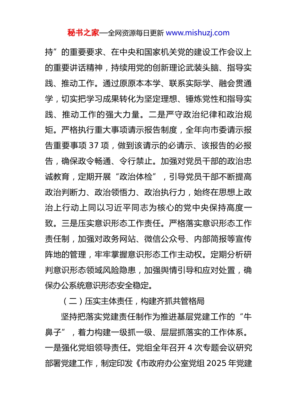 秘书之家—全网资源每日更新 www.mishuzj.com市政府办公室党组 2025 年抓基层党建工作述职报告 2025 年,市政府办公室党组始终坚持以习近平新时代中国特色社会主义思想为指导,深入学习贯彻党的二十大和二十届历次全会精神,全面贯彻落实新时代党的建设总要求和新时代党的组织路线,牢牢把握政治机关定位,坚持把抓基层打基础作为长远之计和固本之举,紧紧围绕服务中心、建设队伍两大任务,持续推动基层党组织全面进步、全面过硬。一年来,市政府办公室党组坚决扛起管党治党政治责任,聚焦主责主业,强化使命担当,把党建工作与“三服务”职能深度融合,为保障市政府高效运转、服务全市高质量发展提供了坚强政治保证。一、主要做法(一)突出政治统领,把准党建方向之舵市政府办公室作为全市行政运行的中枢机构,始终把政治建设摆在首位,坚定不移加强党对办公室工作的全面领导。一是坚持“第一议题”制度不动摇。全年组织党组理论学习中心组学习 18 次,开展专题研讨 6 次,及时跟进学习习近平总书记最新重要讲话和重要指示批示精神,特别是深入学习贯彻习近平总书记关于办公厅工作“五个坚秘书之家—全网资源每日更新 www.mishuzj.com持”的重要要求、在中央和国家机关党的建设工作会议上的重要讲话精神,持续用党的创新理论武装头脑、指导实践、推动工作。通过原原本本学、联系实际学、融会贯通学,切实把学习成果转化为坚定理想、锤炼党性和指导实践、推动工作的强大力量。二是严守政治纪律和政治规矩。严格执行重大事项请示报告制度,全年向市委请示报告重要事项 37 项,做到该请示的必请示、该报告的必报告,确保政令畅通、令行禁止。加强对党员干部的政治忠诚教育,定期开展“政治体检”,引导党员干部不断提高政治判断力、政治领悟力、政治执行力,始终在思想上政治上行动上同以习近平同志为核心的党中央保持高度一致。三是压实意识形态工作责任。严格落实意识形态工作责任制,加强对政务网站、微信公众号、内部简报等宣传阵地的管理,牢牢掌握意识形态工作主动权。定期分析研判意识形态领域风险隐患,加强舆情引导和应对处置,确保办公系统意识形态安全稳定。(二)压实主体责任,构建齐抓共管格局坚持把落实党建责任制作为推进基层党建工作的“牛鼻子”,着力构建一级抓一级、层层抓落实的工作体系。一是强化党组领导责任。党组全年召开 4 次专题会议研究部署党建工作,制定印发《市政府办公室党组 2025 年党建秘书之家—全网资源每日更新 www.mishuzj.com工作要点》和《重点任务清单》,明确年度目标、重点任务和责任分工。将党建工作纳入整体工作统筹谋划,与业务工作同部署、同推进、同考核,实现党建工作与中心任务同频共振。二是落实班子成员“一岗双责”。每位党组成员自觉履行分管领域党建工作责任,定期到所联系党支部调研指导,参加组织生活,帮助解决实际问题。党组书记认真履行第一责任人职责,全年开展党建专题调研 12次,讲专题党课 4 次,对党支部书记开展履职约谈 8 人次,层层传导压力,推动责任落地。三是健全考核评价机制。修订完善党建考核办法,科学设置考核指标,将党建工作成效作为评先评优、干部选拔任用的重要依据,考核权重提升至 25%。通过季度督查、年中评估、年底考评相结合的方式,推动党建工作由“软指标”变为“硬约束”。(三)夯实组织基础,提升支部建设质量牢牢抓住党支部这个基本单元,持续推进党支部标准化规范化建设,不断增强党组织政治功能和组织功能。一是规范党内组织生活。严格落实“三会一课”、主题党日、组织生活会、民主评议党员等制度,全年各党支部累计开展主题党日活动 96 次,召开组织生活会 12 场,党员参与率和民主评议覆盖率均达 100%。注重提升组织生活秘书之家—全网资源每日更新 www.mishuzj.com的政治性、时代性、原则性、战斗性,防止形式化、表面化、娱乐化倾向。二是优化组织设置与班子配备。根据机构职能调整实际,及时完成 3 个党支部的换届改选工作,选优配强支部书记和委员,确保组织健全、运行顺畅。注重从政治素质好、业务能力强、群众威信高的党员干部中选拔支部带...