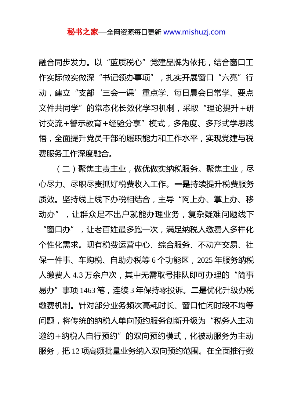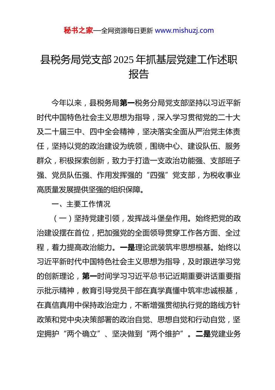 秘书之家—全网资源每日更新 www.mishuzj.com县税务局党支部 2025 年抓基层党建工作述职报告 今年以来,县税务局第一税务分局党支部坚持以习近平新时代中国特色社会主义思想为指导,深入学习贯彻党的二十大及二十届三中、四中全会精神,坚决落实全面从严治党主体责任,坚持以党的政治建设为统领,围绕中心、建设队伍、服务群众,积极探索创新,致力于打造一支政治功能强、支部班子强、党员队伍强、作用发挥强的“四强”党支部,为税收事业高质量发展提供坚强的组织保障。一、主要工作情况(一)坚持党建引领,发挥战斗堡垒作用。始终把党的政治建设摆在首位,把加强党的全面领导贯穿工作各方面、全过程,着力提高政治能力。一是理论武装筑牢思想根基。始终以习近平新时代中国特色社会主义思想为指导,及时跟进学习党的创新理论,第一时间学习习近平总书记近期重要讲话重要指示批示精神,教育引导党员干部在真学真懂中筑牢忠诚根基,在真信真用中保持政治定力,不断增强贯彻执行党的路线方针政策和党中央决策部署的政治自觉、思想自觉和行动自觉,坚定拥护“两个确立”、坚决做到“两个维护”。二是党建业务秘书之家—全网资源每日更新 www.mishuzj.com融合同步发力。以“蓝质税心”党建品牌为依托,结合窗口工作实际做实做深“书记领办事项”,扎实开展窗口“六亮”行动,建立“支部‘三会一课’重点学、每日晨会日常学、要点文件共同学”的常态化长效化学习机制,采取“理论提升+研讨交流+警示教育+经验分享”模式,多角度、多形式学思践悟,全面提升党员干部的履职能力和工作水平,实现党建与税费服务工作深度融合。(二)聚焦主责主业,做优做实纳税服务。聚焦主业,尽心尽力、尽职尽责抓好税费收入工作。一是持续提升税费服务质效。坚持线上线下办税相结合,主导“网上办、掌上办、移动办”,让群众足不出户就能办理业务,复杂疑难问题线下“窗口办”,让老百姓最多跑一次,满足纳税人缴费人多样化个性化需求。现有税费运营中心、综合服务、不动产交易、社保一件事、车购税、自助办税等 6 个功能区,2025 年服务纳税人缴费人 4.3 万余户次,其中无需取号排队即可办理的“简事易办”事项 1463 笔,连续 3 年保持零投诉。二是优化升级办税缴费机制。针对部分业务频次高耗时长、窗口忙闲时段不均等问题,将传统的纳税人单向预约服务创新升级为“税务人主动邀约+纳税人自行预约”的双向预约模式,化被动服务为主动服务,把 12 项高频批量业务纳入双向预约范围。在全面推行数秘书之家—全网资源每日更新 www.mishuzj.com电票期间,预约注销回收税控设备 1160 个;2025 年个人所得税汇算清缴期间,预约办理个人所得税汇算清缴 362 笔,极大地解决了办税人员取号排队等候、办税服务窗口拥堵等问题,既错开了办税高峰期,又提高了办税效率,让老百姓办事有“速度”亦有“温度”。(三)夯实队伍建设,激发干事创业活力。贯彻新时代党的组织路线,激励党员、干部进一步解放思想、转变观念,锐意进取、担当作为。一是选树正面典型发挥示范作用。结合政治素养、业务能力和专业特长,在 6 个功能区选配 6 名年轻税务干部担任负责人,由团队负责人统筹协调、督促管理各区域工作,充分调动年轻干部积极性主动性,给年轻人提供成长成才的机会,提高年轻干部管理能力。每季度评选“党员示范岗”、每月评选“优秀纳税服务员”,挖掘培树一批爱岗敬业、勇于担当的优秀干部,展现新时代税务干部良好精神风貌。二是丰富活动载体彰显队伍合力。积极开展支部“三会一课”、主题党日活动的同时,利用相关节庆节点组织开展敬老助老、帮贫扶困、义务献血、看望特教中心儿童、捡拾怀安河畔垃圾等公益活动。干部职工积极参加省、市、县举办的各项演讲比赛、读书班等活动,在省妇联《习近平走进百姓家》读书视频征集展示活动中获得三等奖、在市“好书悟情怀习语润皖家演秘书之家—全网资源每日更新 www.mishuzj.com讲比赛中荣获二等奖。二、下一步工作打算下一步,县税务局第一税务分局党支部将持续深入学习贯彻习近平新时代中国特色社会主义思想,始终坚持党建引领,对照“四强...