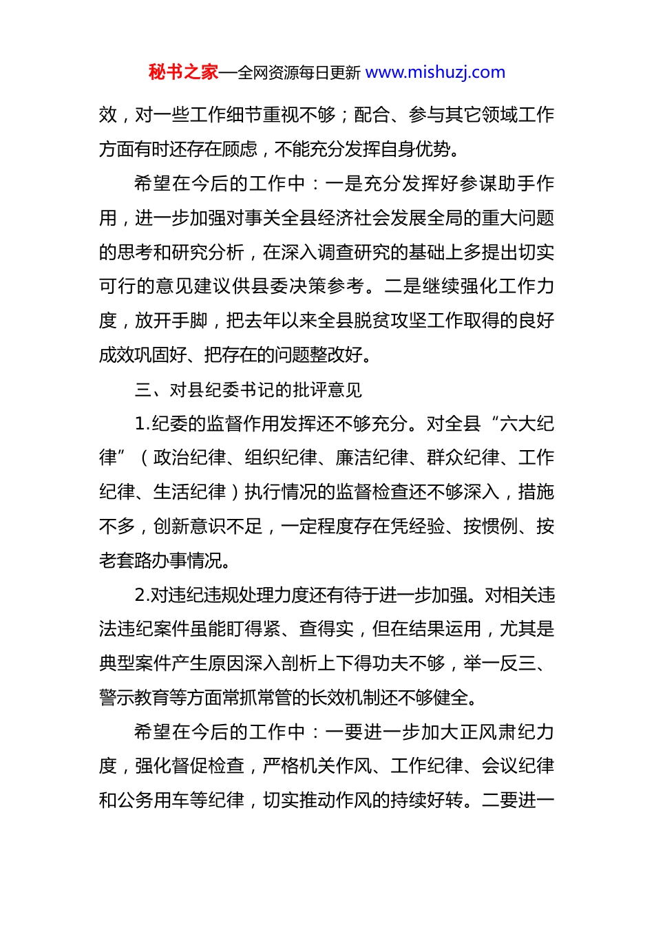 秘书之家—全网资源每日更新 www.mishuzj.com县委书记民主生活会个人批评意见清单 一、对县委副书记、县长的批评意见1.解放思想、大胆开拓精神不够。在面对经济下行压力加大、困难问题增多的情况下,对政府工作如何进一步解放思想、开创新局面,需要思路再宽一点、步子再快一点、胆子再大一点,探索创新更多的思路办法。2.监管督促不够严。有时候存在重部署、轻落实的现象,特别是对一些政府部门的工作落实、执法监督、协作推进等方面的监督管理还够严、抓得还不够紧。希望在今后的工作中:一要进一步加强学习,多思考,多分析,不断增强驾驭玉龙经济社会发展的能力和水平,做到谋其政、尽其责;二要更加注重牵头抓总,善于抓重点、出实招、推进度、求实效;三要坚持高标准、严要求,进一步加强政府工作部门的帮助指导和监督管理,进一步调动和发挥班子成员的积极性。二、对县委副书记的批评意见1.统筹协调全局工作力度不够。对影响全县经济社会发展全局的其他重大问题深入分析、思考和研究有待进一步加强,统筹协调和督促检查力度仍需进一步增强。2.参谋助手作用发挥还不够。抓分管工作更注重面上成秘书之家—全网资源每日更新 www.mishuzj.com效,对一些工作细节重视不够;配合、参与其它领域工作方面有时还存在顾虑,不能充分发挥自身优势。希望在今后的工作中:一是充分发挥好参谋助手作用,进一步加强对事关全县经济社会发展全局的重大问题的思考和研究分析,在深入调查研究的基础上多提出切实可行的意见建议供县委决策参考。二是继续强化工作力度,放开手脚,把去年以来全县脱贫攻坚工作取得的良好成效巩固好、把存在的问题整改好。三、对县纪委书记的批评意见1.纪委的监督作用发挥还不够充分。对全县“六大纪律”(政治纪律、组织纪律、廉洁纪律、群众纪律、工作纪律、生活纪律)执行情况的监督检查还不够深入,措施不多,创新意识不足,一定程度存在凭经验、按惯例、按老套路办事情况。2.对违纪违规处理力度还有待于进一步加强。对相关违法违纪案件虽能盯得紧、查得实,但在结果运用,尤其是典型案件产生原因深入剖析上下得功夫不够,举一反三、警示教育等方面常抓常管的长效机制还不够健全。希望在今后的工作中:一要进一步加大正风肃纪力度,强化督促检查,严格机关作风、工作纪律、会议纪律和公务用车等纪律,切实推动作风的持续好转。二要进一秘书之家—全网资源每日更新 www.mishuzj.com步加大廉洁自律、整风肃纪等方面的宣传教育,强化监督检查、案件查处、问责追究等工作,着眼长远,进一步完善工作机制,着力营造良好政治生态。四、对县委宣传部长的批评意见1.对全县干部队伍了解不够全面深入,深入基层不够,平时主动与干部职工沟通交流不够,全面准确掌握全县基层干部队伍状况还存在差距。2.基层组织建设创新不够、措施不多。对基层党建工作有想法、有点子,但存在安排部署多、督促落实少等问题,没有真正做到常抓不懈、一抓到底;对党员管理、软弱涣散党组织整顿等工作在抓具体落实上还有待于加强。希望在今后的工作中:一要更多地深入基层一线,及时了解基层干部职工的思想动态、工作实绩,为县委推荐更多的优秀人才,为玉龙改革发展稳定凝聚力量;二要立足玉龙实际,进一步加强基层党建工作地指导,统筹抓好党内组织生活制度执行和基础党务规范、党员积分量化考核等工作,着力打造出更多具有玉龙鲜明特色的党建亮点。五、对常务副县长的批评意见1.政府参谋助手的作用发挥不够充分。作为常务副县长,在任务多、压力大的情况下,充分发挥参谋助手作用秘书之家—全网资源每日更新 www.mishuzj.com需进一步加强,在突破一些重点工作上主动作为、超前安排等方面仍需进一步加强。2.思想解放、开拓创新精神不够。面对经济下行压力持续加大的严峻形势,对全县经济工作统筹深入研究不够,面对新形势、新情况、新问题需思想再解放一点、思路再拓宽一些、胆子再放大一点、力度再加强一些。希望在今后工作中:一要多从全局的高度思考谋划,对全县经济社会发展中的大事要事和热点难点多作思考、多提办法措施;二要充分发挥自身优势,自加压力、主动作为,推动政府工作...