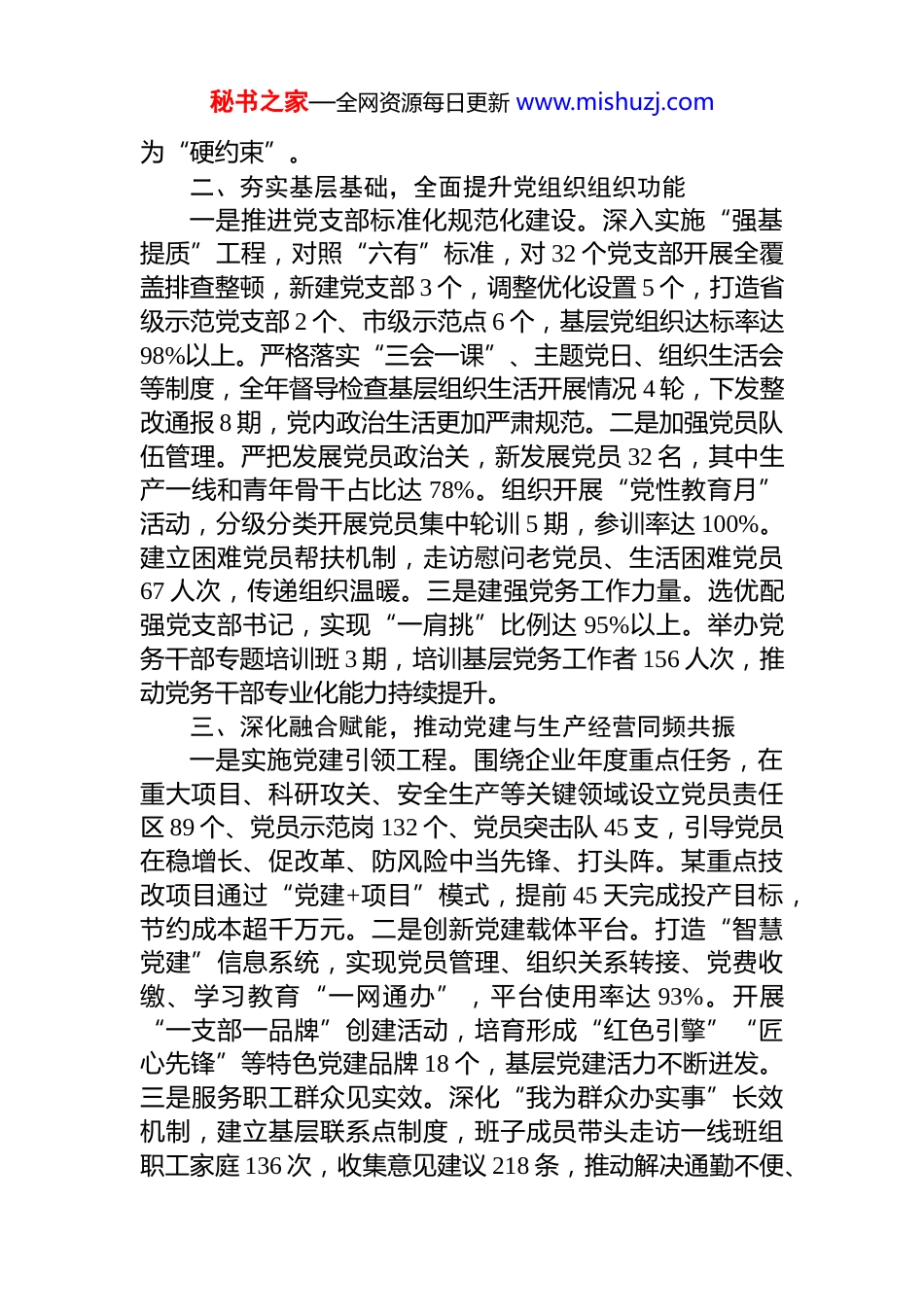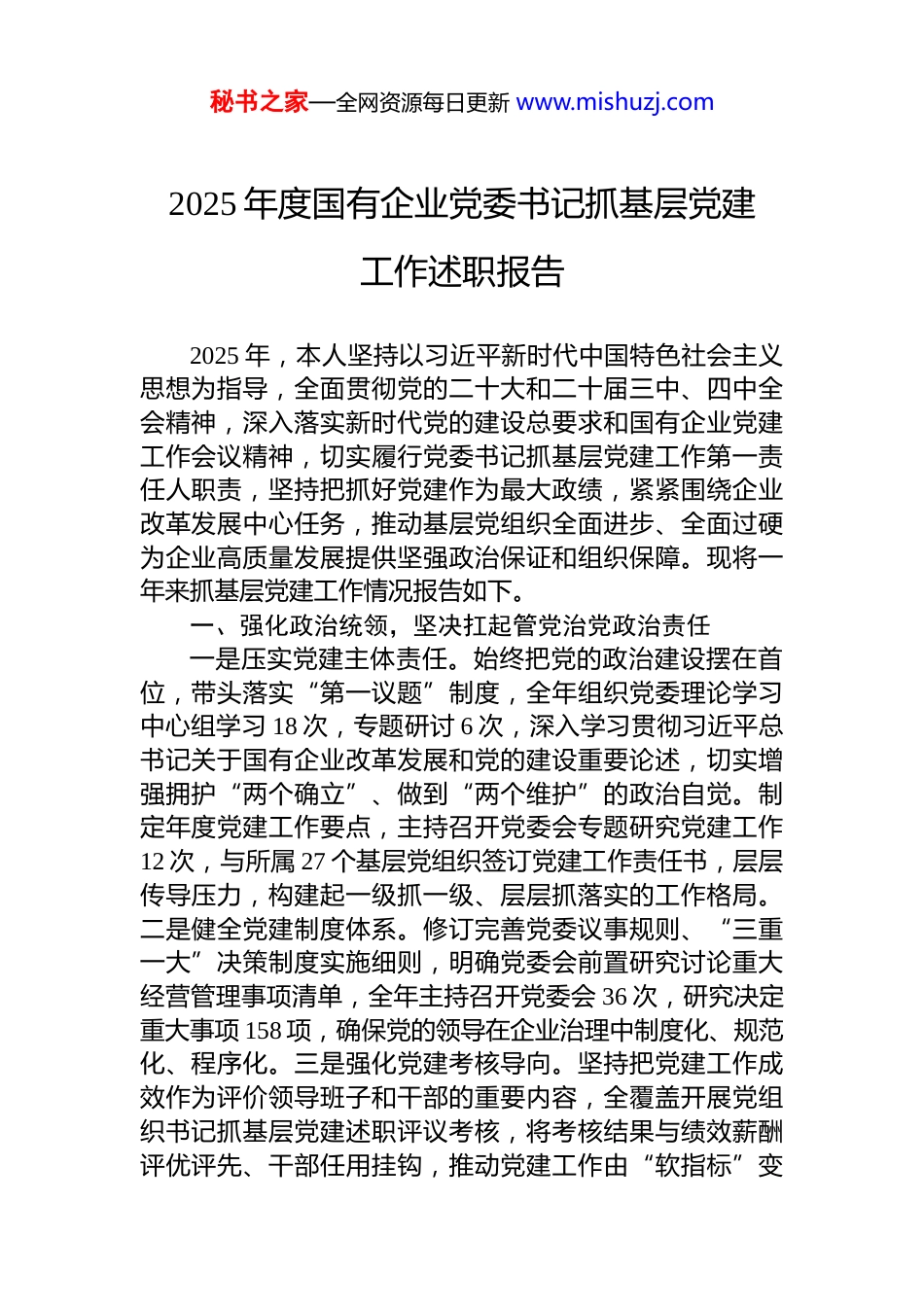 秘书之家—全网资源每日更新 www.mishuzj.com2025 年度国有企业党委书记抓基层党建工作述职报告2025 年,本人坚持以习近平新时代中国特色社会主义思想为指导,全面贯彻党的二十大和二十届三中、四中全会精神,深入落实新时代党的建设总要求和国有企业党建工作会议精神,切实履行党委书记抓基层党建工作第一责任人职责,坚持把抓好党建作为最大政绩,紧紧围绕企业改革发展中心任务,推动基层党组织全面进步、全面过硬为企业高质量发展提供坚强政治保证和组织保障。现将一年来抓基层党建工作情况报告如下。一、强化政治统领,坚决扛起管党治党政治责任一是压实党建主体责任。始终把党的政治建设摆在首位,带头落实“第一议题”制度,全年组织党委理论学习中心组学习 18 次,专题研讨 6 次,深入学习贯彻习近平总书记关于国有企业改革发展和党的建设重要论述,切实增强拥护“两个确立”、做到“两个维护”的政治自觉。制定年度党建工作要点,主持召开党委会专题研究党建工作12 次,与所属 27 个基层党组织签订党建工作责任书,层层传导压力,构建起一级抓一级、层层抓落实的工作格局。二是健全党建制度体系。修订完善党委议事规则、“三重一大”决策制度实施细则,明确党委会前置研究讨论重大经营管理事项清单,全年主持召开党委会 36 次,研究决定重大事项 158 项,确保党的领导在企业治理中制度化、规范化、程序化。三是强化党建考核导向。坚持把党建工作成效作为评价领导班子和干部的重要内容,全覆盖开展党组织书记抓基层党建述职评议考核,将考核结果与绩效薪酬评优评先、干部任用挂钩,推动党建工作由“软指标”变秘书之家—全网资源每日更新 www.mishuzj.com为“硬约束”。二、夯实基层基础,全面提升党组织组织功能一是推进党支部标准化规范化建设。深入实施“强基提质”工程,对照“六有”标准,对 32 个党支部开展全覆盖排查整顿,新建党支部 3 个,调整优化设置 5 个,打造省级示范党支部 2 个、市级示范点 6 个,基层党组织达标率达98%以上。严格落实“三会一课”、主题党日、组织生活会等制度,全年督导检查基层组织生活开展情况 4 轮,下发整改通报 8 期,党内政治生活更加严肃规范。二是加强党员队伍管理。严把发展党员政治关,新发展党员 32 名,其中生产一线和青年骨干占比达 78%。组织开展“党性教育月”活动,分级分类开展党员集中轮训 5 期,参训率达 100%。建立困难党员帮扶机制,走访慰问老党员、生活困难党员67 人次,传递组织温暖。三是建强党务工作力量。选优配强党支部书记,实现“一肩挑”比例达 95%以上。举办党务干部专题培训班 3 期,培训基层党务工作者 156 人次,推动党务干部专业化能力持续提升。三、深化融合赋能,推动党建与生产经营同频共振一是实施党建引领工程。围绕企业年度重点任务,在重大项目、科研攻关、安全生产等关键领域设立党员责任区 89 个、党员示范岗 132 个、党员突击队 45 支,引导党员在稳增长、促改革、防风险中当先锋、打头阵。某重点技改项目通过“党建+项目”模式,提前 45 天完成投产目标,节约成本超千万元。二是创新党建载体平台。打造“智慧党建”信息系统,实现党员管理、组织关系转接、党费收缴、学习教育“一网通办”,平台使用率达 93%。开展“一支部一品牌”创建活动,培育形成“红色引擎”“匠心先锋”等特色党建品牌 18 个,基层党建活力不断迸发。三是服务职工群众见实效。深化“我为群众办实事”长效机制,建立基层联系点制度,班子成员带头走访一线班组职工家庭 136 次,收集意见建议 218 条,推动解决通勤不便、秘书之家—全网资源每日更新 www.mishuzj.com食堂质量、倒班休息室改造等实际问题 192 项,职工满意度测评达 97.6%。四、从严正风肃纪,营造风清气正政治生态一是压实党风廉政建设责任。坚决履行全面从严治党第一责任人职责,定期听取纪委工作汇报,研究部署党风廉政建设和反腐败工作。组织召开党风廉政建设专题会议 4次,开展警示教育 6 场,覆盖党员干部 1200 余人次,通报典型案例 12 起,推动廉洁从业意识入脑入心。二是...