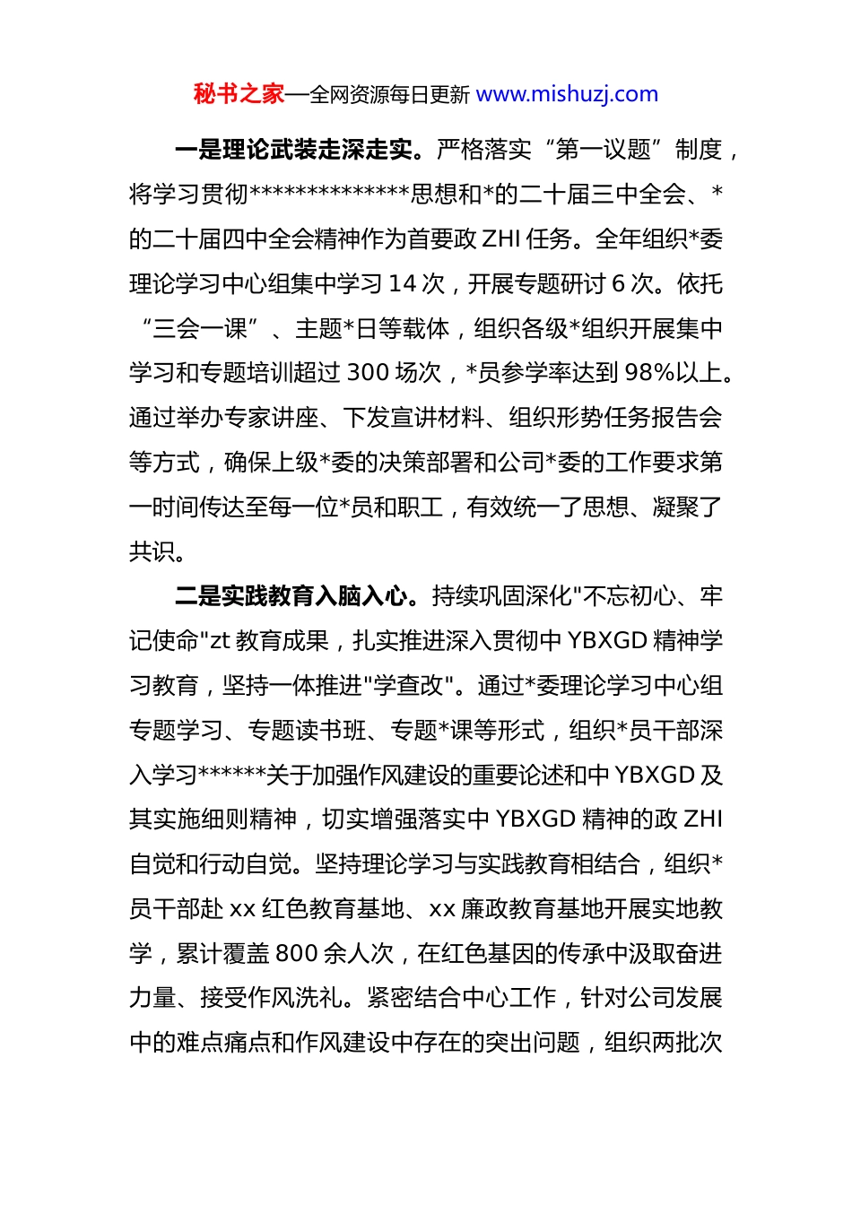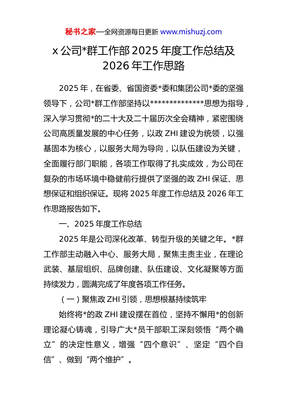 秘书之家—全网资源每日更新 www.mishuzj.comx 公司*群工作部 2025 年度工作总结及2026 年工作思路2025 年,在省委、省国资委*委和集团公司*委的坚强领导下,公司*群工作部坚持以**************思想为指导,深入学习贯彻*的二十大及二十届历次全会精神,紧密围绕公司高质量发展的中心任务,以政 ZHI 建设为统领,以强基固本为核心,以服务大局为导向,以队伍建设为关键,全面履行部门职能,各项工作取得了扎实成效,为公司在复杂的市场环境中稳健前行提供了坚强的政 ZHI 保证、思想保证和组织保证。现将 2025 年度工作总结及 2026 年工作思路报告如下。一、2025 年度工作总结2025 年是公司深化改革、转型升级的关键之年。*群工作部主动融入中心、服务大局,聚焦主责主业,在理论武装、基层组织、品牌创建、队伍建设、文化凝聚等方面持续发力,圆满完成了年度各项工作任务。(一)聚焦政 ZHI 引领,思想根基持续筑牢始终将*的政 ZHI 建设摆在首位,坚持不懈用*的创新理论凝心铸魂,引导广大*员干部职工深刻领悟“两个确立”的决定性意义,增强“四个意识”、坚定“四个自信”、做到“两个维护”。秘书之家—全网资源每日更新 www.mishuzj.com一是理论武装走深走实。严格落实“第一议题”制度,将学习贯彻**************思想和*的二十届三中全会、*的二十届四中全会精神作为首要政 ZHI 任务。全年组织*委理论学习中心组集中学习 14 次,开展专题研讨 6 次。依托“三会一课”、主题*日等载体,组织各级*组织开展集中学习和专题培训超过 300 场次,*员参学率达到 98%以上。通过举办专家讲座、下发宣讲材料、组织形势任务报告会等方式,确保上级*委的决策部署和公司*委的工作要求第一时间传达至每一位*员和职工,有效统一了思想、凝聚了共识。二是实践教育入脑入心。持续巩固深化"不忘初心、牢记使命"zt 教育成果,扎实推进深入贯彻中 YBXGD 精神学习教育,坚持一体推进"学查改"。通过*委理论学习中心组专题学习、专题读书班、专题*课等形式,组织*员干部深入学习******关于加强作风建设的重要论述和中 YBXGD 及其实施细则精神,切实增强落实中 YBXGD 精神的政 ZHI自觉和行动自觉。坚持理论学习与实践教育相结合,组织*员干部赴 xx 红色教育基地、xx 廉政教育基地开展实地教学,累计覆盖 800 余人次,在红色基因的传承中汲取奋进力量、接受作风洗礼。紧密结合中心工作,针对公司发展中的难点痛点和作风建设中存在的突出问题,组织两批次秘书之家—全网资源每日更新 www.mishuzj.com共 40 余名中层干部及业务骨干,赴 xx 地区的行业标杆企业进行对标学习,形成了高质量的调研报告 3 份,既为公司破解发展难题、优化管理模式提供了有益借鉴,又推动*员干部在实践中转作风、树形象,将学习教育成果转化为推动高质量发展的实际成效。三是宣传引导凝聚共识。充分利用公司官网、微信公众号、内部刊物等宣传阵地,构建了全方位、多层次、立体化的宣传矩阵。全年发布各类新闻稿件 500 余篇,其中在省级以上主流媒体刊发 20 余篇。围绕公司年度重点项目“xx 项目”和“xx 技术改造工程”,开展系列深度报道,生动讲述一线故事,有效激发了全体职工投身公司发展的积极性和自豪感。(二)聚焦强基提质,组织堡垒坚强有力坚持大抓基层的鲜明导向,以提升组织力为重点,推动基层*组织全面进步、全面过硬,使每个支部都成为坚强的战斗堡垒。一是基层支部建设全面过硬。深入贯彻《中国共产*支部工作条例(试行)》,全面推进*支部标准化规范化建设。年初对全部 35 个基层*支部进行了一次全面“体检”,针对发现的 3 个“软弱涣散”*支部,制定“一支部一策”整改方案,由*委委员挂点联系,通过选优配强支部书记、优秘书之家—全网资源每日更新 www.mishuzj.com化组织设置、加大资源倾斜等方式,于第三季度末全部完成整改,实现晋位升级。目前,公司“先进”等级*支部占比达到 60%,“合格”等级占比 40%,全面消除了“后进”*支部。二是*员队伍管理精细高效。以打造“政 ZHI 素质好、岗位技能优、先锋作用强”的*员队伍为目标,严格*...
