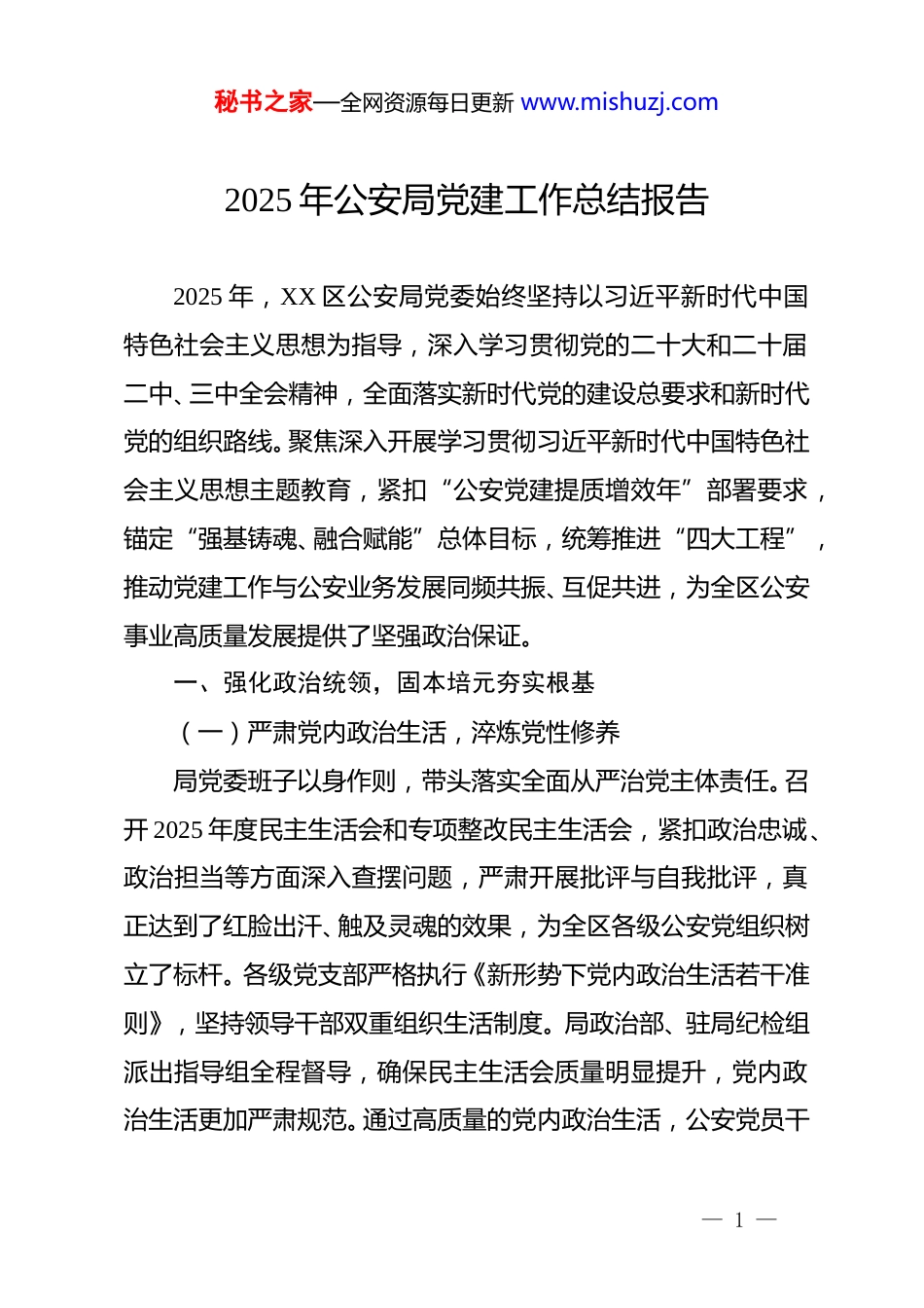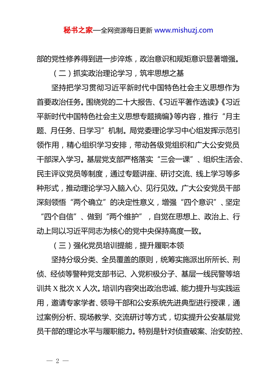 秘书之家—全网资源每日更新 www.mishuzj.com2025 年公安局党建工作总结报告2025 年,XX 区公安局党委始终坚持以习近平新时代中国特色社会主义思想为指导,深入学习贯彻党的二十大和二十届二中、三中全会精神,全面落实新时代党的建设总要求和新时代党的组织路线。聚焦深入开展学习贯彻习近平新时代中国特色社会主义思想主题教育,紧扣“公安党建提质增效年”部署要求,锚定“强基铸魂、融合赋能”总体目标,统筹推进“四大工程”,推动党建工作与公安业务发展同频共振、互促共进,为全区公安事业高质量发展提供了坚强政治保证。一、强化政治统领,固本培元夯实根基(一)严肃党内政治生活,淬炼党性修养局党委班子以身作则,带头落实全面从严治党主体责任。召开 2025 年度民主生活会和专项整改民主生活会,紧扣政治忠诚、政治担当等方面深入查摆问题,严肃开展批评与自我批评,真正达到了红脸出汗、触及灵魂的效果,为全区各级公安党组织树立了标杆。各级党支部严格执行《新形势下党内政治生活若干准则》,坚持领导干部双重组织生活制度。局政治部、驻局纪检组派出指导组全程督导,确保民主生活会质量明显提升,党内政治生活更加严肃规范。通过高质量的党内政治生活,公安党员干— 1 —秘书之家—全网资源每日更新 www.mishuzj.com部的党性修养得到进一步淬炼,政治意识和规矩意识显著增强。(二)抓实政治理论学习,筑牢思想之基坚持把学习贯彻习近平新时代中国特色社会主义思想作为首要政治任务。围绕党的二十大报告、《习近平著作选读》《习近平新时代中国特色社会主义思想专题摘编》等内容,推行“月主题、月任务、日学习”机制。局党委理论学习中心组发挥示范引领作用,精心组织学习安排,带动各级党组织和广大公安党员干部深入学习。基层党支部严格落实“三会一课”、组织生活会、民主评议党员等制度,通过专题讲座、研讨交流、线上学习等多种形式,推动理论学习入脑入心、见行见效。广大公安党员干部深刻领悟“两个确立”的决定性意义,增强“四个意识”、坚定“四个自信”、做到“两个维护”,自觉在思想上、政治上、行动上同以习近平同志为核心的党中央保持高度一致。(三)强化党员培训提能,提升履职本领坚持分级分类、全员覆盖的原则,统筹实施派出所所长、刑侦、经侦等警种党支部书记、入党积极分子、基层一线民警等培训共 X 批次 X 人次。培训内容突出政治忠诚、能力提升与实践运用,邀请专家学者、领导干部和公安系统先进典型进行授课,通过案例分析、现场教学、交流研讨等方式,切实提升公安基层党员干部的理论水平与履职能力。特别是针对侦查破案、治安防控、— 2 —应急处突等公安重点工作领域,开展专题培训,为公安基层党员干部提供了实用的工作方法和思路,有力推动了各项公安工作的开展。(四)提升公安宣传质效,营造良好氛围深化公安党建宣传矩阵建设,充分利用各类媒体平台,广泛宣传公安党建成果和先进典型。2025 年在《XX 公安党建平台》发布公安党建信息 X 条,开设“我的从警初心”“理论学习”“晒整改”等专栏,总阅读量达 X 万人次。《XX 公安微先锋》刊发信息 X 篇,《人民公安报》采用稿件 X 篇,《XX 公安微讯》推送 X 篇,形成了多平台联动、立体化宣传格局。通过宣传,展示了全区公安党建工作的新成效、新亮点,营造了良好的舆论氛围,激发了广大公安党员干部干事创业的热情。二、推动融合共建,多点突破增强效能(一)做强基层所队党建,筑牢公安战斗堡垒深入实施基层所队党建“整警推进、整体提升”行动,选优配强基层所队党组织带头人,加强所队“两委”班子建设。开展公安党员“先锋指数”管理,激励党员在公安工作中发挥先锋模范作用。加强基层所队党员活动场所建设,提升服务功能。实施“党建+业务”发展模式,培育壮大公安特色工作品牌,提升公安工作效能。例如,[具体派出所名称]党支部依托信息化手秘书之家—全网资源每日更新 www.mishuzj.com段,发展智慧警务,成立数据研判小组,带领民警破获多起疑难案件,打击效能大幅提升。(二)推进平安建设,维护社会稳定制定出台《关于加强社会治安防控体...