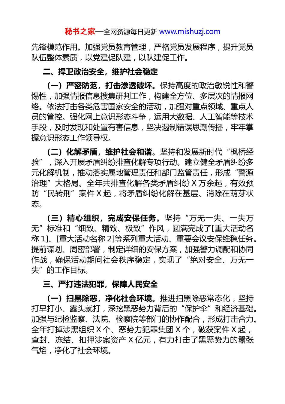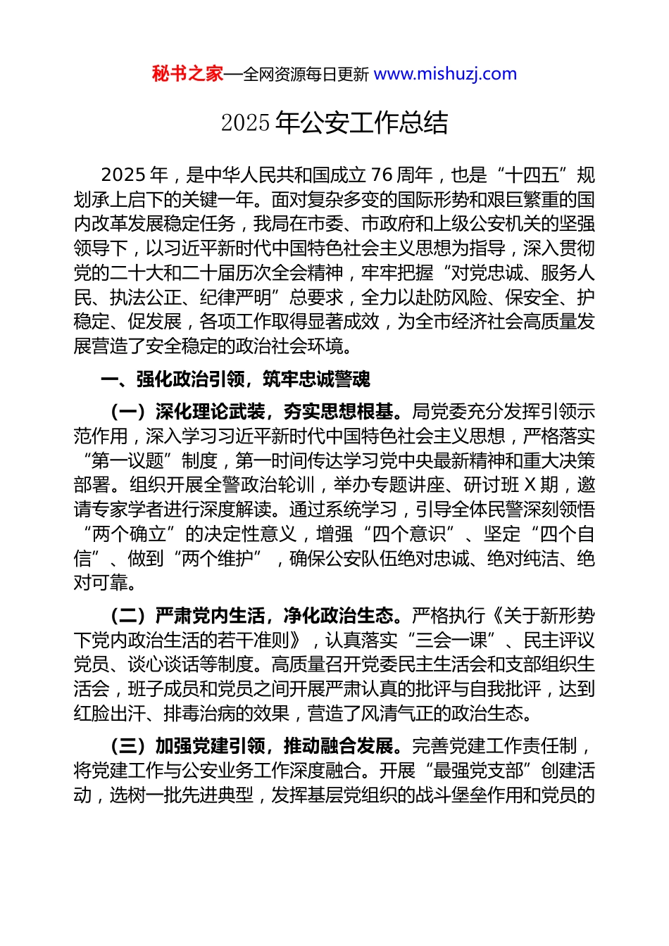 秘书之家—全网资源每日更新 www.mishuzj.com2025 年公安工作总结2025 年,是中华人民共和国成立 76 周年,也是“十四五”规划承上启下的关键一年。面对复杂多变的国际形势和艰巨繁重的国内改革发展稳定任务,我局在市委、市政府和上级公安机关的坚强领导下,以习近平新时代中国特色社会主义思想为指导,深入贯彻党的二十大和二十届历次全会精神,牢牢把握“对党忠诚、服务人民、执法公正、纪律严明”总要求,全力以赴防风险、保安全、护稳定、促发展,各项工作取得显著成效,为全市经济社会高质量发展营造了安全稳定的政治社会环境。一、强化政治引领,筑牢忠诚警魂(一)深化理论武装,夯实思想根基。局党委充分发挥引领示范作用,深入学习习近平新时代中国特色社会主义思想,严格落实“第一议题”制度,第一时间传达学习党中央最新精神和重大决策部署。组织开展全警政治轮训,举办专题讲座、研讨班 X 期,邀请专家学者进行深度解读。通过系统学习,引导全体民警深刻领悟“两个确立”的决定性意义,增强“四个意识”、坚定“四个自信”、做到“两个维护”,确保公安队伍绝对忠诚、绝对纯洁、绝对可靠。(二)严肃党内生活,净化政治生态。严格执行《关于新形势下党内政治生活的若干准则》,认真落实“三会一课”、民主评议党员、谈心谈话等制度。高质量召开党委民主生活会和支部组织生活会,班子成员和党员之间开展严肃认真的批评与自我批评,达到红脸出汗、排毒治病的效果,营造了风清气正的政治生态。(三)加强党建引领,推动融合发展。完善党建工作责任制,将党建工作与公安业务工作深度融合。开展“最强党支部”创建活动,选树一批先进典型,发挥基层党组织的战斗堡垒作用和党员的秘书之家—全网资源每日更新 www.mishuzj.com先锋模范作用。加强党员教育管理,严格党员发展程序,提升党员队伍整体素质,以党建促队建,以队建促工作。二、捍卫政治安全,维护社会稳定(一)严密防范,打击渗透破坏。保持高度的政治敏锐性和警惕性,加强情报信息搜集研判工作,构建全方位、多层次的情报网络。依法打击各类危害国家安全的活动,加强对重点领域、重点人员的管控。强化网上意识形态斗争,运用大数据、人工智能等技术手段,及时发现和处置有害信息,坚决遏制错误思潮传播,牢牢掌握意识形态工作领导权。(二)化解矛盾,维护社会和谐。坚持和发展新时代“枫桥经验”,深入开展矛盾纠纷排查化解专项行动。建立健全矛盾纠纷多元化解机制,推动落实属地管理责任和部门监管责任,形成“警源治理”大格局。全年共排查化解各类矛盾纠纷 X 万余起,有效预防“民转刑”案件 X 起,将矛盾纠纷化解在基层、消除在萌芽状态。(三)精心组织,完成安保任务。坚持“万无一失、一失万无”标准和“细致、精致、极致”作风,圆满完成了[重大活动名称 1]、[重大活动名称 2]等系列重大活动、重要会议安保维稳任务。提前谋划、周密部署,制定详细的安保方案,加强警力调配和协同作战,确保活动期间社会秩序稳定,实现了“绝对安全、万无一失”的工作目标。三、严打违法犯罪,保障人民安全(一)扫黑除恶,净化社会环境。推进扫黑除恶常态化,坚持打早打小、露头就打,深挖黑恶势力背后的“保护伞”和经济基础。加强与纪检监察、法院、检察院等部门的协作配合,形成打击合力。全年打掉涉黑组织 X 个、恶势力犯罪集团 X 个,破获案件 X 起,查封、冻结、扣押涉案资产 X 亿元,有力打击了黑恶势力的嚣张气焰,净化了社会环境。秘书之家—全网资源每日更新 www.mishuzj.com(二)重拳出击,打击突出犯罪。针对群众反映强烈的盗抢骗、黄赌毒、食药环等突出违法犯罪,组织开展“猎鹰-2025”、“利剑 2025”等系列专项打击行动。加强对犯罪规律特点的分析研究,提高打击的精准度和实效性。破获电信网络诈骗案件 X 起,抓获犯罪嫌疑人 X 名,止付冻结资金 X 亿元,有效遏制了电信网络诈骗犯罪高发态势。传统“盗抢骗”案件发案数持续下降,人民群众安全感显著增强。(三)防范风险,打击经济犯罪。密切关注经济金融领域风险,加强对非法集资、合同诈骗、虚开骗税等经济犯罪的打...