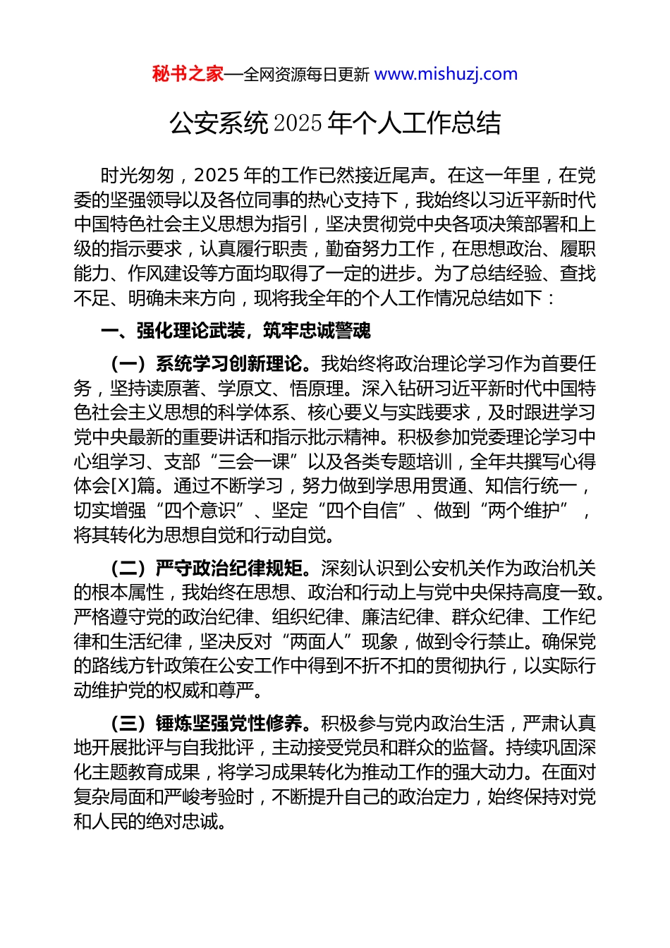 秘书之家—全网资源每日更新 www.mishuzj.com公安系统 2025 年个人工作总结时光匆匆,2025 年的工作已然接近尾声。在这一年里,在党委的坚强领导以及各位同事的热心支持下,我始终以习近平新时代中国特色社会主义思想为指引,坚决贯彻党中央各项决策部署和上级的指示要求,认真履行职责,勤奋努力工作,在思想政治、履职能力、作风建设等方面均取得了一定的进步。为了总结经验、查找不足、明确未来方向,现将我全年的个人工作情况总结如下:一、强化理论武装,筑牢忠诚警魂(一)系统学习创新理论。我始终将政治理论学习作为首要任务,坚持读原著、学原文、悟原理。深入钻研习近平新时代中国特色社会主义思想的科学体系、核心要义与实践要求,及时跟进学习党中央最新的重要讲话和指示批示精神。积极参加党委理论学习中心组学习、支部“三会一课”以及各类专题培训,全年共撰写心得体会[X]篇。通过不断学习,努力做到学思用贯通、知信行统一,切实增强“四个意识”、坚定“四个自信”、做到“两个维护”,将其转化为思想自觉和行动自觉。(二)严守政治纪律规矩。深刻认识到公安机关作为政治机关的根本属性,我始终在思想、政治和行动上与党中央保持高度一致。严格遵守党的政治纪律、组织纪律、廉洁纪律、群众纪律、工作纪律和生活纪律,坚决反对“两面人”现象,做到令行禁止。确保党的路线方针政策在公安工作中得到不折不扣的贯彻执行,以实际行动维护党的权威和尊严。(三)锤炼坚强党性修养。积极参与党内政治生活,严肃认真地开展批评与自我批评,主动接受党员和群众的监督。持续巩固深化主题教育成果,将学习成果转化为推动工作的强大动力。在面对复杂局面和严峻考验时,不断提升自己的政治定力,始终保持对党和人民的绝对忠诚。秘书之家—全网资源每日更新 www.mishuzj.com二、聚焦主责主业,提升履职效能(一)维护稳定,守护一方平安。密切关注影响社会稳定的各类风险隐患,加强情报信息的搜集与研判工作。积极投身重大活动安保、突发事件应急处置等任务,全年牵头或参与化解涉稳矛盾[X]起,有效处置群体性事件苗头[X]起。通过精准的情报分析和果断的行动,为辖区的持续稳定贡献了自己的力量。(二)打击犯罪,彰显执法威力。紧盯突出违法犯罪活动,深入研究其规律和特点,不断提升精准打击能力。深度参与“猎狐2025”“云剑 2025”等专项行动,在侦办一起跨境网络赌博案件中,发挥骨干作用,通过细致的侦查工作,梳理资金流向,固定关键证据,为案件的成功侦破提供了有力支撑。全年参与破获各类刑事案件[X]起,抓获犯罪嫌疑人[X]名,有力打击了违法犯罪分子的嚣张气焰。(三)治安管控,构建安全屏障。结合分管领域工作,积极推进社会治安防控体系建设。加强对重点区域、重点行业和重点要素的管控力度,常态化开展安全隐患排查整治工作。充分利用智慧公安建设成果,运用大数据、物联网等先进技术,提升预测预警预防能力。通过一系列有效措施,全年负责区域的治安案件发案率同比下降[X]%,群众的安全感得到进一步增强。(四)服务群众,践行初心使命。牢固树立以人民为中心的发展思想,深入开展“我为群众办实事”实践活动。优化窗口服务流程,提高办事效率,为群众提供更加便捷、高效的服务。积极回应群众的报警求助,及时解决群众的急难愁盼问题。深入社区、学校、企业开展法治宣传和安全教育活动,提升群众的法治意识和自防能力。全年共收到群众感谢信(锦旗)[X]封(面),赢得了群众的广泛赞誉。三、加强作风建设,坚守廉洁底线秘书之家—全网资源每日更新 www.mishuzj.com(一)力戒形式主义官僚主义。严格落实中央八项规定及其实施细则精神,坚决反对“四风”,特别是形式主义和官僚主义的新表现。坚持实事求是,深入基层一线开展调查研究,掌握真实情况,解决实际问题。精简文件会议,改进文风会风,将更多的时间和精力投入到实际工作中,切实提高工作效率。(二)严格遵守廉洁从警规定。认真学习《中国共产党廉洁自律准则》和公安机关的各项铁规禁令,时刻保持自重、自省、自警、自励。严格规范执法行为,自觉净化社交圈、生活圈和朋友圈,坚决抵制各种诱...
