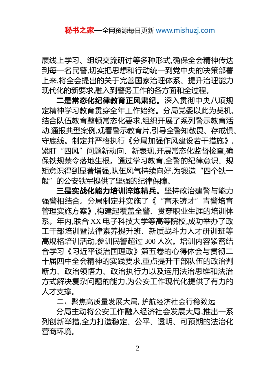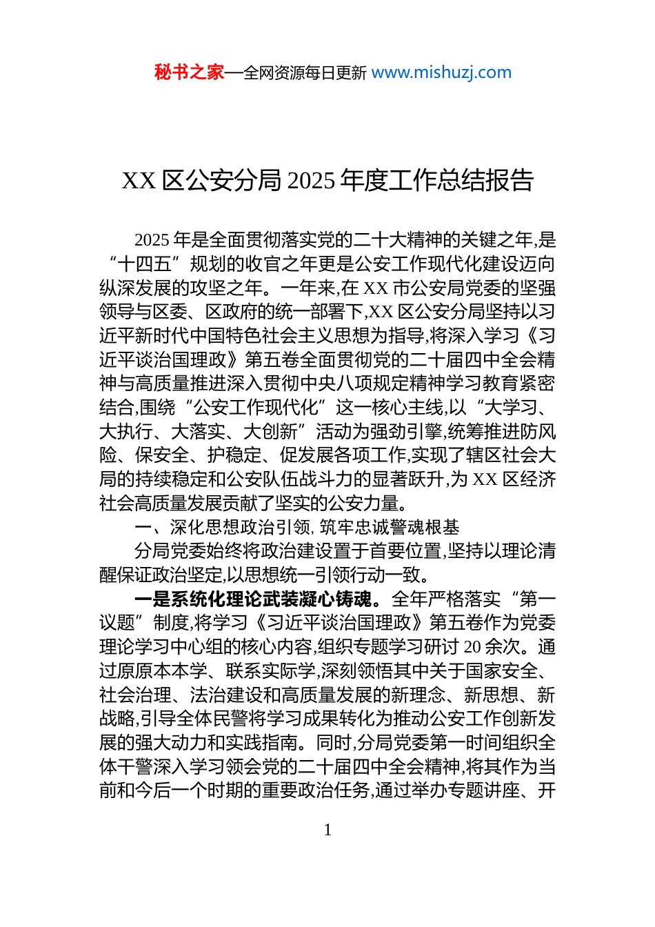 秘书之家—全网资源每日更新 www.mishuzj.comXX 区公安分局 2025 年度工作总结报告2025 年是全面贯彻落实党的二十大精神的关键之年,是“十四五”规划的收官之年更是公安工作现代化建设迈向纵深发展的攻坚之年。一年来,在 XX 市公安局党委的坚强领导与区委、区政府的统一部署下,XX 区公安分局坚持以习近平新时代中国特色社会主义思想为指导,将深入学习《习近平谈治国理政》第五卷全面贯彻党的二十届四中全会精神与高质量推进深入贯彻中央八项规定精神学习教育紧密结合,围绕“公安工作现代化”这一核心主线,以“大学习、大执行、大落实、大创新”活动为强劲引擎,统筹推进防风险、保安全、护稳定、促发展各项工作,实现了辖区社会大局的持续稳定和公安队伍战斗力的显著跃升,为 XX 区经济社会高质量发展贡献了坚实的公安力量。一、深化思想政治引领,筑牢忠诚警魂根基分局党委始终将政治建设置于首要位置,坚持以理论清醒保证政治坚定,以思想统一引领行动一致。一是系统化理论武装凝心铸魂。全年严格落实“第一议题”制度,将学习《习近平谈治国理政》第五卷作为党委理论学习中心组的核心内容,组织专题学习研讨 20 余次。通过原原本本学、联系实际学,深刻领悟其中关于国家安全、社会治理、法治建设和高质量发展的新理念、新思想、新战略,引导全体民警将学习成果转化为推动公安工作创新发展的强大动力和实践指南。同时,分局党委第一时间组织全体干警深入学习领会党的二十届四中全会精神,将其作为当前和今后一个时期的重要政治任务,通过举办专题讲座、开1秘书之家—全网资源每日更新 www.mishuzj.com展线上学习、组织交流研讨等多种形式,确保全会精神传达到每一名民警,切实把思想和行动统一到党中央的决策部署上来,将全会提出的关于完善国家治理体系、提升治理能力现代化的新要求,融入到警务工作的各方面和全过程。二是常态化纪律教育正风肃纪。深入贯彻中央八项规定精神学习教育贯穿全年工作始终。分局党委以此为契机,结合队伍教育整顿常态化要求,组织开展了系列警示教育活动,通报典型案例,观看警示教育片,引导全警知敬畏、存戒惧、守底线。制定并严格执行《分局加强作风建设若干措施》,紧盯“四风”问题新动向、新表现,开展常态化监督检查,确保铁规禁令落地生根。通过学习教育,全警的纪律意识、规矩意识得到显著增强,队伍风气持续向好,为锻造“四个铁一般”的公安铁军提供了坚强的纪律保障。三是实战化能力培训淬炼精兵。坚持政治建警与能力强警相结合。分局制定并实施了《“育禾铸才”青警培育管理实施方案》,构建起覆盖全警、贯穿职业生涯的培训体系。年内,联合 XX 电子科技大学等高等院校,成功举办了政工干部培训暨法律素养提升班、新质战斗力人才研训班等高规格培训活动,参训民警超过 300 人次。培训内容紧密结合学习《习近平谈治国理政》第五卷的心得体会与贯彻二十届四中全会精神的实践要求,重点提升干部队伍的政治判断力、政治领悟力、政治执行力以及运用法治思维和法治方式解决复杂问题的能力,为公安工作现代化提供了有力的人才支撑。二、聚焦高质量发展大局,护航经济社会行稳致远分局主动将公安工作融入经济社会发展大局,推出一系列创新举措,全力打造稳定、公平、透明、可预期的法治化营商环境。2秘书之家—全网资源每日更新 www.mishuzj.com一是创新“法务+警务”协同机制,破解企业发展难题。为精准服务企业,分局联合区公证处创新打造了“警证协同”合作机制。该机制深度整合公安机关的社会管理职能与公证机构的法律服务功能,共同设计推出涵盖知识产权保护、经济合同纠纷调解、员工背景审查等 7 大类 23 项“法务代办套餐”。全年,通过该机制为辖区企业提供民商事法律事务代办服务 35 起,协助处理涉企纠纷 12 起,有效保障了20 余家企业的正常生产经营秩序,避免了因法律问题导致的重大经济损失。二是构建“法护瞭望”监督模式,规范涉企执法行为。针对异地办案可能出现的程序不规范、趋利性执法等问题,分局在 XX 市局指导下,创新建立了归口统一、流程明确的规范异地办案协作“法护瞭望”模式。该模式通过设立专门的协作审查岗,对所有进入辖区的异地办...