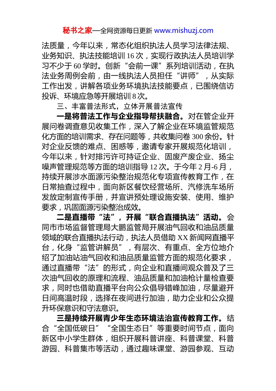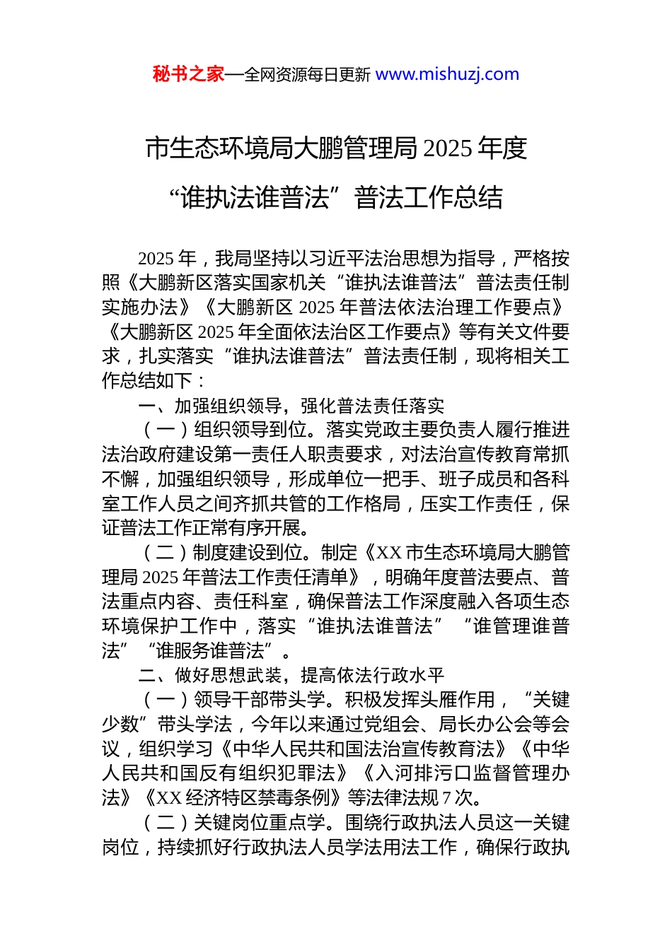 秘书之家—全网资源每日更新 www.mishuzj.com市生态环境局大鹏管理局 2025 年度“谁执法谁普法”普法工作总结2025 年,我局坚持以习近平法治思想为指导,严格按照《大鹏新区落实国家机关“谁执法谁普法”普法责任制实施办法》《大鹏新区 2025 年普法依法治理工作要点》《大鹏新区 2025 年全面依法治区工作要点》等有关文件要求,扎实落实“谁执法谁普法”普法责任制,现将相关工作总结如下:一、加强组织领导,强化普法责任落实(一)组织领导到位。落实党政主要负责人履行推进法治政府建设第一责任人职责要求,对法治宣传教育常抓不懈,加强组织领导,形成单位一把手、班子成员和各科室工作人员之间齐抓共管的工作格局,压实工作责任,保证普法工作正常有序开展。(二)制度建设到位。制定《XX 市生态环境局大鹏管理局 2025 年普法工作责任清单》,明确年度普法要点、普法重点内容、责任科室,确保普法工作深度融入各项生态环境保护工作中,落实“谁执法谁普法”“谁管理谁普法”“谁服务谁普法”。二、做好思想武装,提高依法行政水平(一)领导干部带头学。积极发挥头雁作用,“关键少数”带头学法,今年以来通过党组会、局长办公会等会议,组织学习《中华人民共和国法治宣传教育法》《中华人民共和国反有组织犯罪法》《入河排污口监督管理办法》《XX 经济特区禁毒条例》等法律法规 7 次。(二)关键岗位重点学。围绕行政执法人员这一关键岗位,持续抓好行政执法人员学法用法工作,确保行政执秘书之家—全网资源每日更新 www.mishuzj.com法质量,今年以来,常态化组织执法人员学习法律法规、业务知识、执法技能培训 16 次,实现行政执法人员培训学习不少于 60 学时。创新“会前一课”系列培训活动,在执法业务周例会前,由一线执法人员担任“讲师”,从实际工作出发,讲解各项业务环境执法技能要点,已围绕信访投诉、环境应急等开展培训 8 次。三、丰富普法形式,立体开展普法宣传一是将普法工作与企业指导帮扶融合。对在管企业开展问卷调查意见收集工作,深入了解企业在环境监管规范化方面的培训需求、存在问题等,共收集问卷 300 余份。针对企业反馈的难点、困惑等,邀请专家开展规范化培训,今年以来,针对排污许可持证企业、固废产废企业、扬尘噪声管理规范等方面的培训指导 12 次。于今年 2 月-6 月,持续开展涉水面源污染整治规范化专项宣传教育工作,在日常抽查过程中,面向新区餐饮经营场所、汽修洗车场所发放定制宣传手册,并宣讲预处理设施安装、使用、维护要求,巩固面源污染整治成效。二是直播带“法”,开展“联合直播执法”活动。会同市市场监督管理局大鹏监管局开展油气回收和油品质量领域的联合直播执法行动,执法人员借助 XX 新闻网直播平台,化身“监管讲解员”,有层次、有重点、全方位地介绍了加油站油气回收和油品质量监管方面的规范化要求,通过直播带“法”的形式,向企业和直播间观众普及了三次油气回收的原理和流程、油品质量和加油枪计量检查要求,同时也借助直播平台向公众倡导错峰加油,尽量避开日间高温时段,选择在夜间进行加油,助力企业和公众提升环保意识和守法意识。三是持续开展青少年生态环境法治宣传教育工作。结合“全国低碳日”“全国生态日”等重要时间节点,面向新区中小学生群体,组织开展科普讲座、科普课堂、科普游园、科普集市等活动,通过趣味课堂、游园参观、互动秘书之家—全网资源每日更新 www.mishuzj.com体验等方式,将法治宣传教育融入其中,极大地增强了普法教育的吸引力、互动性和实效性,在寓教于乐中引导青少年自觉养成尊法学法守法用法的良好习惯。四、下一步计划(一)持续加强组织领导。贯彻落实党政主要负责人履行推进法治政府建设第一责任人职责要求,坚持党对法治宣传教育的领导,进一步提高思想站位,用法治思维武装头脑,用法治方式开展工作,做到有法可依、有法必依执法必严、违法必究。(二)不断加强法治队伍建设。全面树立法治精神、培养法治思维,以普法宣传为抓手,加强工作人员专业知识、执法能力、执法水平的法治教育培训工作,全面提升工作人员依法行政、依法治理、...