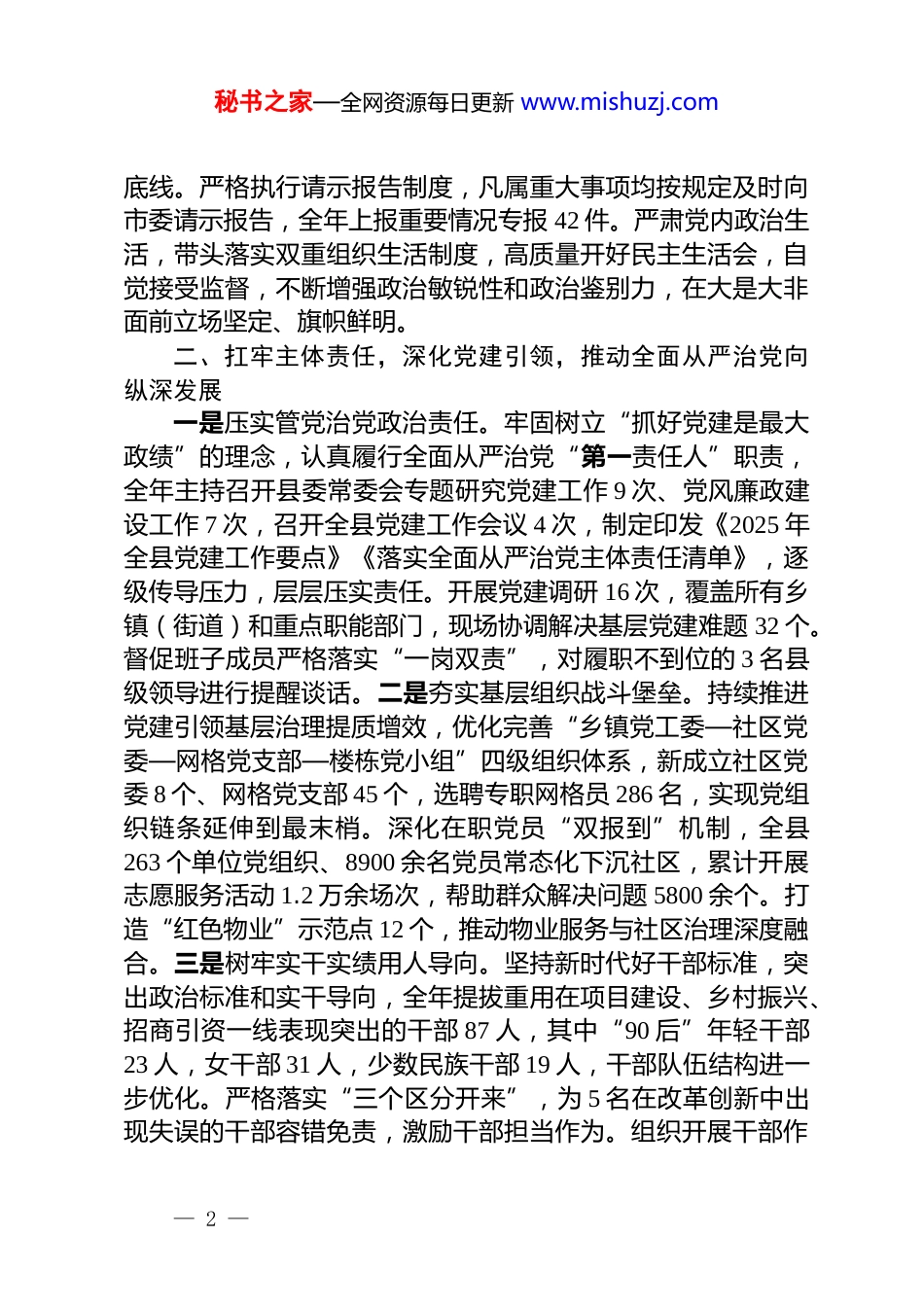 秘书之家—全网资源每日更新 www.mishuzj.com县委书记 2025 年度个人述德述职述廉报告2025 年,在市委、市政府的坚强领导下,本人始终坚持以习近平新时代中国特色社会主义思想为指导,深入学习贯彻党的二十大和二十届二中、三中、四中全会精神,牢牢把握“全面从严治党永远在路上”的政治要求,切实履行县委书记第一责任人职责,团结带领全县广大干部群众聚焦高质量发展首要任务,扎实推进中国式现代化县域实践。现将本人 2025 年度履责情况报告如下:一、突出政治统领,坚定理想信念,全面提升政治判断力政治领悟力、政治执行力一是强化理论武装铸忠诚。坚持把学习贯彻习近平新时代中国特色社会主义思想作为首要政治任务,严格落实“第一议题”制度,主持召开县委常委会会议 38 次、县委理论学习中心组集中学习 12 次,带头原原本本学习党的创新理论,深入研读《习近平谈治国理政》第四卷和系列重要讲话精神,深刻领悟“两个确立”的决定性意义,不断增强“四个意识”、坚定“四个自信”、做到“两个维护”。通过专题党课、基层宣讲等方式,推动党的创新理论进机关、进企业、进校园、进社区、进农村,切实把学习成果转化为坚定理想、锤炼党性和指导实践、推动工作的强大动力。二是坚决贯彻党中央决策部署。始终在思想上政治上行动上同以习近平同志为核心的党中央保持高度一致,紧紧围绕全省“四区一高地”战略定位和全市“强省会”行动部署,立足我县资源禀赋和发展基础,系统谋划县域经济社会发展路径,统筹推进产业升级、城乡融合、民生改善、安全稳定等重点工作,确保方向不偏、执行有力。全年召开县委常委会专题研究重大事项 67 项,形成决策意见 213 条,全部建立台账、闭环管理、跟踪问效。三是严守政治纪律规矩— 1 —秘书之家—全网资源每日更新 www.mishuzj.com底线。严格执行请示报告制度,凡属重大事项均按规定及时向市委请示报告,全年上报重要情况专报 42 件。严肃党内政治生活,带头落实双重组织生活制度,高质量开好民主生活会,自觉接受监督,不断增强政治敏锐性和政治鉴别力,在大是大非面前立场坚定、旗帜鲜明。二、扛牢主体责任,深化党建引领,推动全面从严治党向纵深发展一是压实管党治党政治责任。牢固树立“抓好党建是最大政绩”的理念,认真履行全面从严治党“第一责任人”职责,全年主持召开县委常委会专题研究党建工作 9 次、党风廉政建设工作 7 次,召开全县党建工作会议 4 次,制定印发《2025 年全县党建工作要点》《落实全面从严治党主体责任清单》,逐级传导压力,层层压实责任。开展党建调研 16 次,覆盖所有乡镇(街道)和重点职能部门,现场协调解决基层党建难题 32 个。督促班子成员严格落实“一岗双责”,对履职不到位的 3 名县级领导进行提醒谈话。二是夯实基层组织战斗堡垒。持续推进党建引领基层治理提质增效,优化完善“乡镇党工委—社区党委—网格党支部—楼栋党小组”四级组织体系,新成立社区党委 8 个、网格党支部 45 个,选聘专职网格员 286 名,实现党组织链条延伸到最末梢。深化在职党员“双报到”机制,全县263 个单位党组织、8900 余名党员常态化下沉社区,累计开展志愿服务活动 1.2 万余场次,帮助群众解决问题 5800 余个。打造“红色物业”示范点 12 个,推动物业服务与社区治理深度融合。三是树牢实干实绩用人导向。坚持新时代好干部标准,突出政治标准和实干导向,全年提拔重用在项目建设、乡村振兴、招商引资一线表现突出的干部 87 人,其中“90 后”年轻干部23 人,女干部 31 人,少数民族干部 19 人,干部队伍结构进一步优化。严格落实“三个区分开来”,为 5 名在改革创新中出现失误的干部容错免责,激励干部担当作为。组织开展干部作— 2 —秘书之家—全网资源每日更新 www.mishuzj.com风专项整顿行动,调整不适宜担任现职领导干部 6 人,形成能上能下、优胜劣汰的良好氛围。三、聚焦中心大局,统筹发展和安全,奋力谱写高质量发展新篇章一是经济运行稳中有进。坚持以高质量发展统揽全局,全力稳增长、调结构、促转型,预计 2025 年全县地区生产总值达...