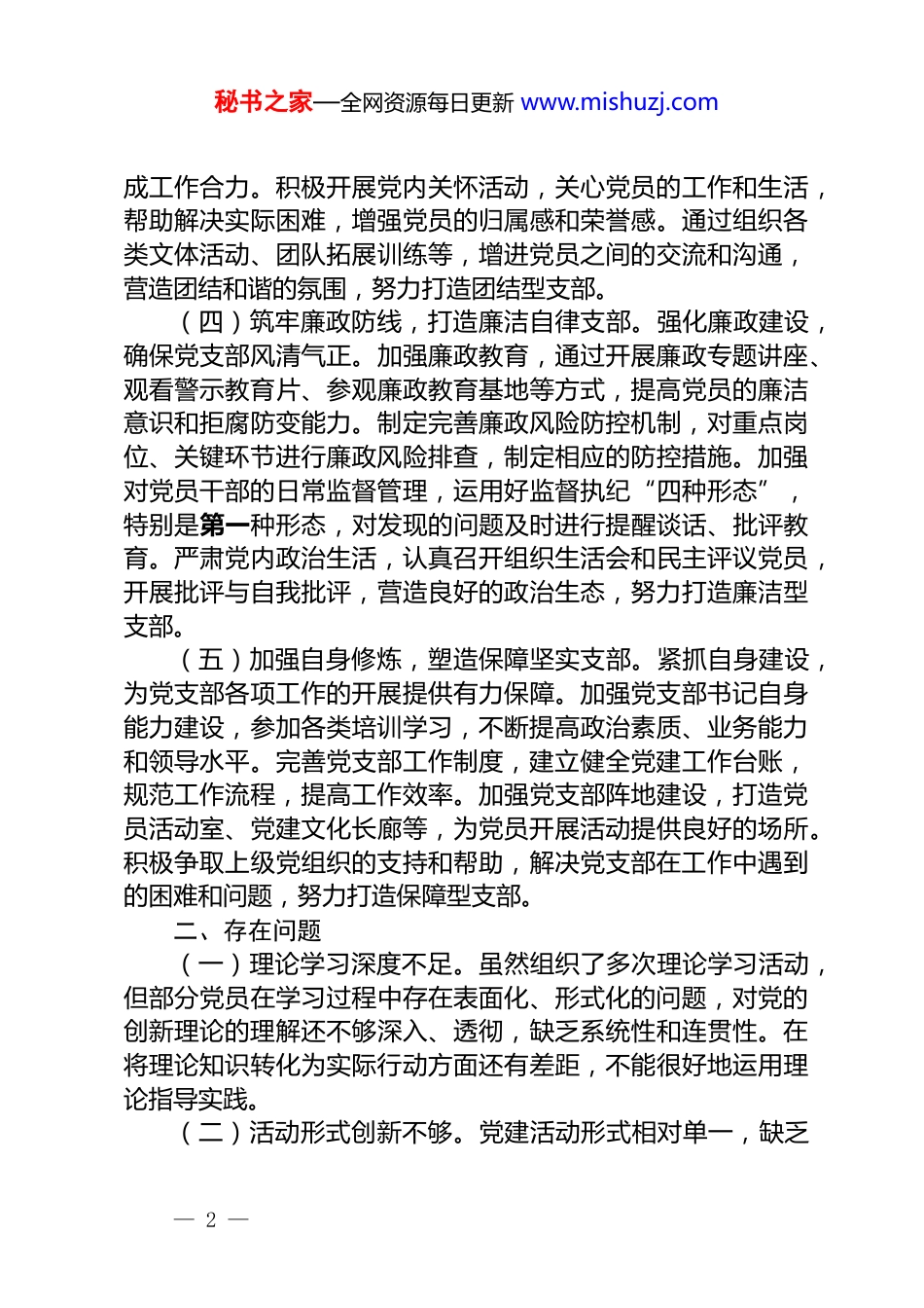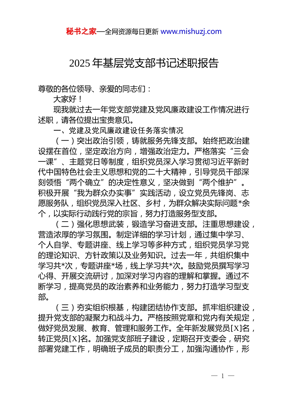秘书之家—全网资源每日更新 www.mishuzj.com2025 年基层党支部书记述职报告尊敬的各位领导、亲爱的同志们:大家好!现我就过去一年党支部党建及党风廉政建设工作情况进行述职,请各位提出宝贵意见。一、党建及党风廉政建设任务落实情况(一)突出政治引领,铸就服务先锋支部。始终把政治建设摆在首位,坚定政治方向,增强政治定力。严格落实“三会一课”、主题党日等制度,组织党员深入学习贯彻习近平新时代中国特色社会主义思想和党的二十大精神,引导党员干部深刻领悟“两个确立”的决定性意义,坚决做到“两个维护”。积极开展“我为群众办实事”实践活动,设立党员先锋岗、志愿服务队,组织党员深入社区、乡村,为群众解决实际问题*余个,以实际行动践行党的宗旨,努力打造服务型支部。(二)强化思想武装,锻造学习奋进支部。注重思想建设,营造浓厚的学习氛围。制定详细的学习计划,通过集中学习、个人自学、专题讲座、线上学习等多种方式,组织党员学习党的理论知识、方针政策以及业务知识。过去一年,共组织集中学习共*次,专题讲座*场,线上学习共*次。鼓励党员撰写学习心得、开展交流研讨,加深对学习内容的理解和掌握。通过不断学习,提高党员的政治素养和业务能力,努力打造学习型支部。(三)夯实组织根基,构建团结协作支部。抓牢组织建设,提升党支部的凝聚力和战斗力。严格按照党章和党内有关规定,做好党员发展、教育、管理和服务工作。全年新发展党员[X]名,转正党员[X]名。加强党支部班子建设,定期召开支委会,研究部署党建工作,明确班子成员的职责分工,加强沟通协作,形— 1 —秘书之家—全网资源每日更新 www.mishuzj.com成工作合力。积极开展党内关怀活动,关心党员的工作和生活,帮助解决实际困难,增强党员的归属感和荣誉感。通过组织各类文体活动、团队拓展训练等,增进党员之间的交流和沟通,营造团结和谐的氛围,努力打造团结型支部。(四)筑牢廉政防线,打造廉洁自律支部。强化廉政建设,确保党支部风清气正。加强廉政教育,通过开展廉政专题讲座、观看警示教育片、参观廉政教育基地等方式,提高党员的廉洁意识和拒腐防变能力。制定完善廉政风险防控机制,对重点岗位、关键环节进行廉政风险排查,制定相应的防控措施。加强对党员干部的日常监督管理,运用好监督执纪“四种形态”,特别是第一种形态,对发现的问题及时进行提醒谈话、批评教育。严肃党内政治生活,认真召开组织生活会和民主评议党员,开展批评与自我批评,营造良好的政治生态,努力打造廉洁型支部。(五)加强自身修炼,塑造保障坚实支部。紧抓自身建设,为党支部各项工作的开展提供有力保障。加强党支部书记自身能力建设,参加各类培训学习,不断提高政治素质、业务能力和领导水平。完善党支部工作制度,建立健全党建工作台账,规范工作流程,提高工作效率。加强党支部阵地建设,打造党员活动室、党建文化长廊等,为党员开展活动提供良好的场所。积极争取上级党组织的支持和帮助,解决党支部在工作中遇到的困难和问题,努力打造保障型支部。二、存在问题(一)理论学习深度不足。虽然组织了多次理论学习活动,但部分党员在学习过程中存在表面化、形式化的问题,对党的创新理论的理解还不够深入、透彻,缺乏系统性和连贯性。在将理论知识转化为实际行动方面还有差距,不能很好地运用理论指导实践。(二)活动形式创新不够。党建活动形式相对单一,缺乏— 2 —秘书之家—全网资源每日更新 www.mishuzj.com吸引力和创新性。主题党日活动大多以集中学习、参观考察为主,形式较为传统,不能充分满足党员的多样化需求。活动内容与实际工作结合不够紧密,不能有效激发党员的参与热情和积极性。(三)服务精准度有待提高。在开展服务群众工作时,对群众的需求了解还不够精准、全面,服务的针对性和实效性还有待提高。服务方式和手段相对落后,不能充分利用现代信息技术为群众提供更加便捷、高效的服务。(四)党员管理力度不够。在党员管理方面,存在宽、松、软的问题。对个别党员的日常监督不够严格,对党员的考核评价机制还不够完善,不能充分发挥考核评价的导向作用。对党员的...