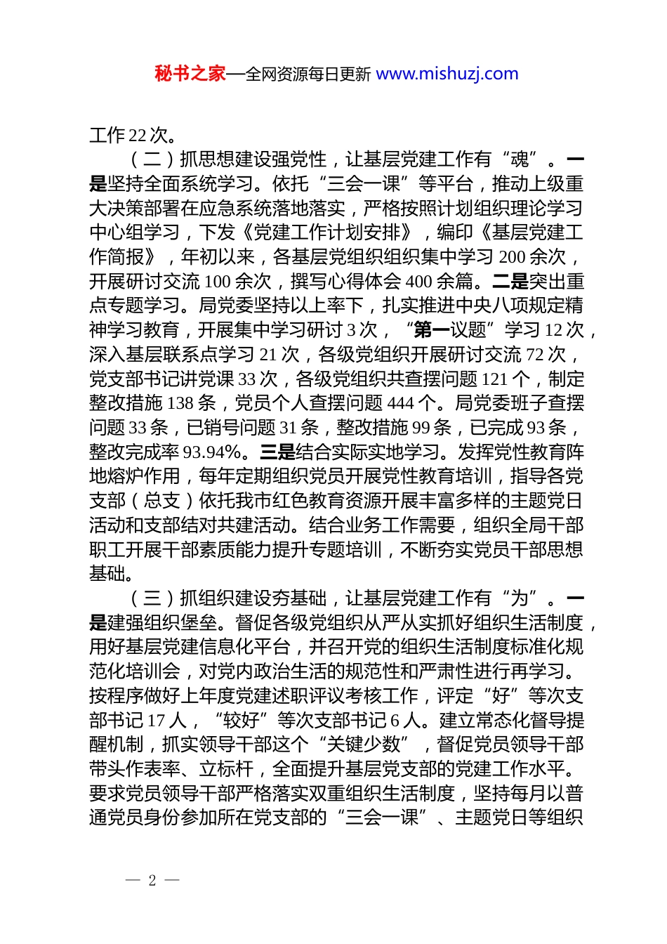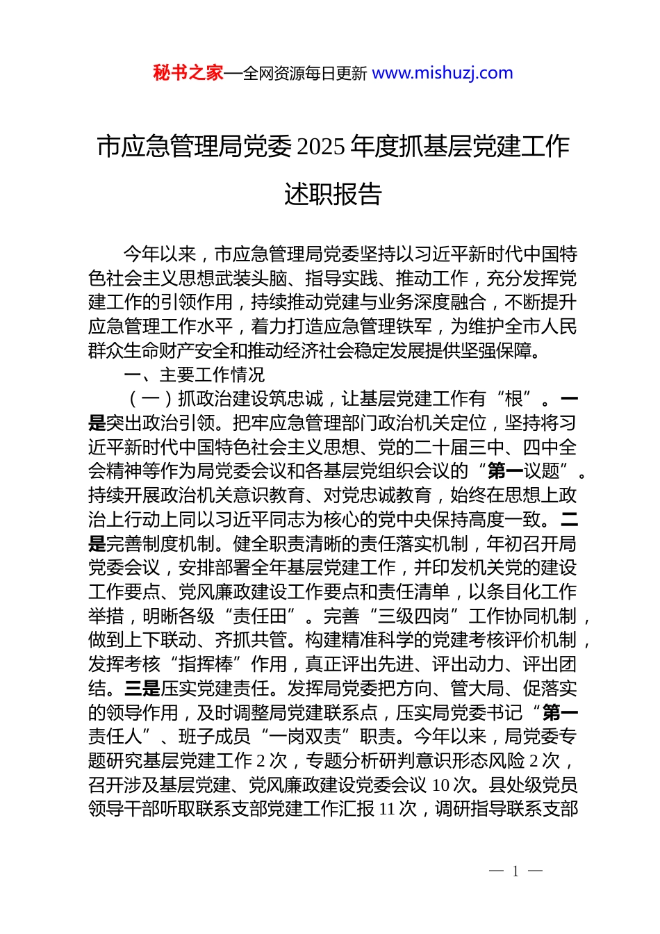 秘书之家—全网资源每日更新 www.mishuzj.com市应急管理局党委 2025 年度抓基层党建工作述职报告今年以来,市应急管理局党委坚持以习近平新时代中国特色社会主义思想武装头脑、指导实践、推动工作,充分发挥党建工作的引领作用,持续推动党建与业务深度融合,不断提升应急管理工作水平,着力打造应急管理铁军,为维护全市人民群众生命财产安全和推动经济社会稳定发展提供坚强保障。一、主要工作情况(一)抓政治建设筑忠诚,让基层党建工作有“根”。一是突出政治引领。把牢应急管理部门政治机关定位,坚持将习近平新时代中国特色社会主义思想、党的二十届三中、四中全会精神等作为局党委会议和各基层党组织会议的“第一议题”。持续开展政治机关意识教育、对党忠诚教育,始终在思想上政治上行动上同以习近平同志为核心的党中央保持高度一致。二是完善制度机制。健全职责清晰的责任落实机制,年初召开局党委会议,安排部署全年基层党建工作,并印发机关党的建设工作要点、党风廉政建设工作要点和责任清单,以条目化工作举措,明晰各级“责任田”。完善“三级四岗”工作协同机制,做到上下联动、齐抓共管。构建精准科学的党建考核评价机制,发挥考核“指挥棒”作用,真正评出先进、评出动力、评出团结。三是压实党建责任。发挥局党委把方向、管大局、促落实的领导作用,及时调整局党建联系点,压实局党委书记“第一责任人”、班子成员“一岗双责”职责。今年以来,局党委专题研究基层党建工作 2 次,专题分析研判意识形态风险 2 次,召开涉及基层党建、党风廉政建设党委会议 10 次。县处级党员领导干部听取联系支部党建工作汇报 11 次,调研指导联系支部— 1 —秘书之家—全网资源每日更新 www.mishuzj.com工作 22 次。(二)抓思想建设强党性,让基层党建工作有“魂”。一是坚持全面系统学习。依托“三会一课”等平台,推动上级重大决策部署在应急系统落地落实,严格按照计划组织理论学习中心组学习,下发《党建工作计划安排》,编印《基层党建工作简报》,年初以来,各基层党组织组织集中学习 200 余次,开展研讨交流 100 余次,撰写心得体会 400 余篇。二是突出重点专题学习。局党委坚持以上率下,扎实推进中央八项规定精神学习教育,开展集中学习研讨 3 次,“第一议题”学习 12 次,深入基层联系点学习 21 次,各级党组织开展研讨交流 72 次,党支部书记讲党课 33 次,各级党组织共查摆问题 121 个,制定整改措施 138 条,党员个人查摆问题 444 个。局党委班子查摆问题 33 条,已销号问题 31 条,整改措施 99 条,已完成 93 条,整改完成率 93.94%。三是结合实际实地学习。发挥党性教育阵地熔炉作用,每年定期组织党员开展党性教育培训,指导各党支部(总支)依托我市红色教育资源开展丰富多样的主题党日活动和支部结对共建活动。结合业务工作需要,组织全局干部职工开展干部素质能力提升专题培训,不断夯实党员干部思想基础。(三)抓组织建设夯基础,让基层党建工作有“为”。一是建强组织堡垒。督促各级党组织从严从实抓好组织生活制度,用好基层党建信息化平台,并召开党的组织生活制度标准化规范化培训会,对党内政治生活的规范性和严肃性进行再学习。按程序做好上年度党建述职评议考核工作,评定“好”等次支部书记 17 人,“较好”等次支部书记 6 人。建立常态化督导提醒机制,抓实领导干部这个“关键少数”,督促党员领导干部带头作表率、立标杆,全面提升基层党支部的党建工作水平。要求党员领导干部严格落实双重组织生活制度,坚持每月以普通党员身份参加所在党支部的“三会一课”、主题党日等组织— 2 —秘书之家—全网资源每日更新 www.mishuzj.com生活,带头参加学习讨论、讲党课、开展民主评议,形成上行下效、整体联动的良好局面。持续推进“四强”党支部创建,经层层筛选、优中选优,推荐优秀党支部参评市直机关“四强”党支部。二是擦亮党建品牌。指导各党支部紧密结合处室专业特色与优势,深度探索党建与业务的有机融合,不断推进党建工作精细化与品牌化建设。认真践行重要训词精神,引导全市应急管...