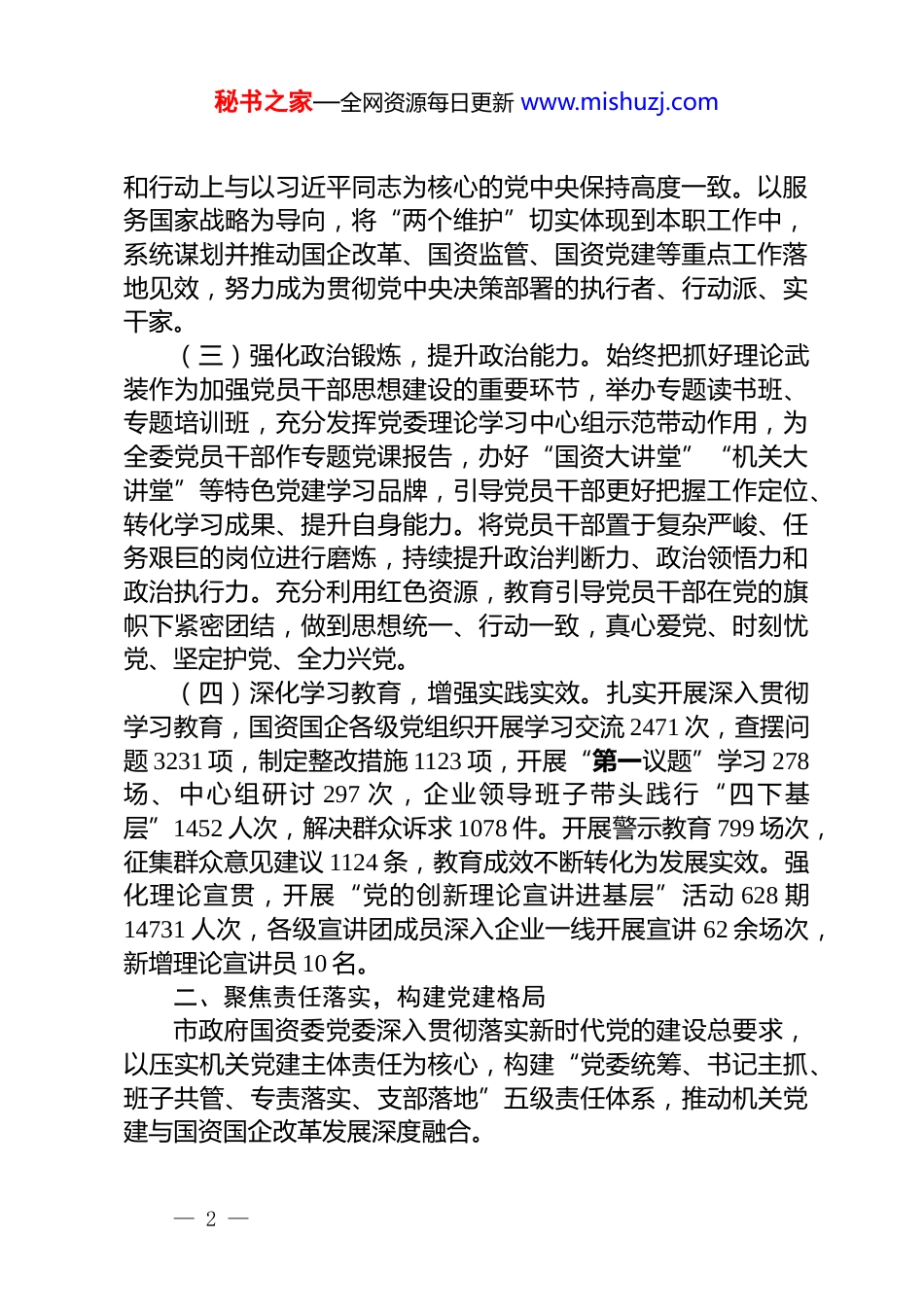 秘书之家—全网资源每日更新 www.mishuzj.com市政府国资委党委书记 2025 年抓基层党建工作述职报告今年以来,我坚持以习近平新时代中国特色社会主义思想为指导,坚决扛牢基层党建第一责任人责任,始终将抓好机关党的建设作为最大政治责任和首要任务,坚决贯彻落实新时代党的建设总要求,认真贯彻落实《市直单位党组(党委)落实机关党建主体责任实施办法》,坚决扛起机关党建主体责任,牢记新时代新征程国资工作使命任务,聚焦“两高四着力”,不断强化“三标”意识,持续深化“两转一提”,以机关、国企系统党建“双融双促”为主线,为国资国企高质量发展提供坚强的政治保障。一、聚焦政治统领,筑牢思想根基坚持把党的政治建设摆在首位,时刻牢记党的政治机关定位,深刻把握机关党建的职责使命和工作着力点,把坚定拥护“两个确立”、坚决做到“两个维护”贯穿国资国企工作全过程各方面,坚持和加强党对国资国企工作的全面领导,不折不扣贯彻落实习近平总书记重要指示批示精神和党中央决策部署,确保工作始终沿着正确政治方向前进。(一)锻造政治机关,强化政治意识。持续加强政治机关意识教育和对党忠诚教育,组织机关党员干部深入学习习近平总书记关于机关党建的重要讲话和指示精神。机关党组织书记以身作则,带头讲授强化政治机关意识专题党课,引导党员干部将政治意识融入工作实践,以做强做优主责主业的实际行动投身模范机关建设,坚定走好践行“两个维护”第一方阵。(二)锤炼政治担当,对标党中央决策。坚定不移向党中央看齐,时刻将党中央决策部署作为行动指南,在思想、政治— 1 —秘书之家—全网资源每日更新 www.mishuzj.com和行动上与以习近平同志为核心的党中央保持高度一致。以服务国家战略为导向,将“两个维护”切实体现到本职工作中,系统谋划并推动国企改革、国资监管、国资党建等重点工作落地见效,努力成为贯彻党中央决策部署的执行者、行动派、实干家。(三)强化政治锻炼,提升政治能力。始终把抓好理论武装作为加强党员干部思想建设的重要环节,举办专题读书班、专题培训班,充分发挥党委理论学习中心组示范带动作用,为全委党员干部作专题党课报告,办好“国资大讲堂”“机关大讲堂”等特色党建学习品牌,引导党员干部更好把握工作定位、转化学习成果、提升自身能力。将党员干部置于复杂严峻、任务艰巨的岗位进行磨炼,持续提升政治判断力、政治领悟力和政治执行力。充分利用红色资源,教育引导党员干部在党的旗帜下紧密团结,做到思想统一、行动一致,真心爱党、时刻忧党、坚定护党、全力兴党。(四)深化学习教育,增强实践实效。扎实开展深入贯彻学习教育,国资国企各级党组织开展学习交流 2471 次,查摆问题 3231 项,制定整改措施 1123 项,开展“第一议题”学习 278场、中心组研讨 297 次,企业领导班子带头践行“四下基层”1452 人次,解决群众诉求 1078 件。开展警示教育 799 场次,征集群众意见建议 1124 条,教育成效不断转化为发展实效。强化理论宣贯,开展“党的创新理论宣讲进基层”活动 628 期14731 人次,各级宣讲团成员深入企业一线开展宣讲 62 余场次,新增理论宣讲员 10 名。二、聚焦责任落实,构建党建格局市政府国资委党委深入贯彻落实新时代党的建设总要求,以压实机关党建主体责任为核心,构建“党委统筹、书记主抓、班子共管、专责落实、支部落地”五级责任体系,推动机关党建与国资国企改革发展深度融合。— 2 —秘书之家—全网资源每日更新 www.mishuzj.com(一)压实党委主体责任,强化党建引领“主心骨”。委党委始终坚持将党的领导贯穿工作的各个环节,履行机关党建主体责任,牢固树立“抓机关党建是本职、不抓机关党建是失职、抓不好机关党建是渎职”的理念,发挥把方向、管大局、保落实的领导作用,坚决扛起全面从严治党主体责任。将党建工作纳入年度重点任务清单,与业务工作同部署、同推进、同考核,召开 6 次党委会议专题研究机关党建工作。制定《市政府国资委机关党建工作要点》《市政府国资委领导班子分包企业责任制》等多个文件,明确三级四岗责任清单,从顶层设计出发,将党...
