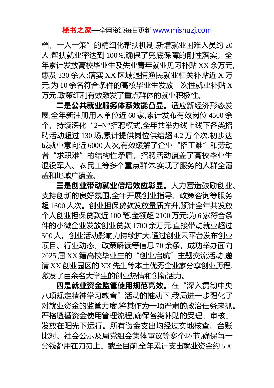 秘书之家—全网资源每日更新 www.mishuzj.comXX 区人力资源和社会保障局 2025 年度工作总结2025 年,是全面贯彻落实党的二十大及二十届三中全会精神的关键之年,也是实施“十四五”规划承上启下的攻坚之年。在 XX 区委、区政府的坚强领导和上级人社部门的悉心指导下,XX 区人力资源和社会保障局坚持以习近平新时代中国特色社会主义思想为指导,深入学习《习近平谈治国理政》第五卷的精髓要义,全面贯彻党的二十届四中全会作出的系列重大部署,并结合开展的“深入贯彻中央八项规定精神学习教育”要求,聚焦“保民生、促发展、稳就业、构和谐”的核心职责,攻坚克难,砥砺奋进,各项工作均取得显著成效,为 XX 区经济社会高质量发展提供了坚实的人力资源与社会保障支撑。现将全年工作情况总结如下。一、聚焦主责主业,年度核心任务全面达成2025 年,我局紧扣年度工作目标,将理论学习成果转化为推动工作的强大动力,以务实作风和创新举措,确保各项核心指标圆满完成,部分指标超额达成,整体工作呈现稳中有进、进中提质的良好态势。(一)就业创业服务精准发力,发展根基愈加稳固我局始终将稳就业、保就业置于工作首位,坚决落实就业优先政策,通过政策扶持与服务优化双轮驱动,实现了就业局势的持续稳定和就业质量的稳步提升。一是重点群体就业保障坚实有力。截至 12 月底,预计全年城镇新增就业实名制人数达 2600 余人,超额完成 2500 人的年度指标任务。全年累计登记失业人员约 1800 人,实现失业人员再就业 1785 人,再就业率保持在 99%以上,展现了强大的就业吸纳与转化能力。针对就业困难人员,建立“一人一秘书之家—全网资源每日更新 www.mishuzj.com档、一人一策”的精细化帮扶机制,新增就业困难人员约 20人,帮扶就业率达到 100%,确保了兜底保障的刚性落实。全年累计发放高校毕业生及失业青年就业见习补贴 XX 余万元,惠及 330 余人;落实 XX 区域退捕渔民就业相关补贴近 X 万元;为 10 余名符合条件的高校毕业生发放一次性就业补贴 X万元,政策红利有效激发了重点群体的就业积极性。二是公共就业服务体系效能凸显。适应新经济形态发展,全年新注册用人单位近 60 家,累计发布有效岗位 4500 余个。持续深化“2+N”招聘模式,全年共举办线上线下各类招聘活动超过 130 场,累计提供岗位供给超 4.2 万个次,初步达成就业意向近 6000 人次,有效缓解了企业“招工难”和劳动者“求职难”的结构性矛盾。招聘活动覆盖了高校毕业生退役军人、农民工等多个重点群体,实现了服务的人群全覆盖和地域广覆盖。三是创业带动就业倍增效应彰显。大力营造鼓励创业、支持创新的良好氛围,全年开展创业指导、政策咨询等服务超 1600 人次。创业担保贷款发放量质齐升,预计全年共发放个人创业担保贷款近 100 笔,金额超 2100 万元;为 6 家符合条件的小微企业发放创业贷款 1700 余万元,直接带动就业超过500 人。创业活动影响力持续扩大,通过创业云平台发布创业项目、行业动态、政策解读等信息 70 余条。成功举办面向2025 届 XX 籍高校毕业生的“创业启航”主题交流活动,邀请 XX 创业园区的 XX 先生等本土优秀企业家分享创业历程,激发了百余名大学生的创业热情和创新活力。四是就业资金监管使用规范高效。在“深入贯彻中央八项规定精神学习教育”活动的推动下,我局进一步强化了对就业资金的监管力度,将其作为一项严肃的政治任务来抓。严格遵循资金使用管理流程,确保各类补贴的受理、审核、发放在阳光下运行。所有资金支出均经过实地核查、台账比对、社会公示及局党组会集体审议等多个环节,确保每一分钱都用在刀刃上。截至目前,全年累计支出就业资金约 500秘书之家—全网资源每日更新 www.mishuzj.com万元,资金使用规范、安全、高效,未发生任何违规违纪事件。(二)社会保障体系织密扎牢,民生福祉持续增进以《习近平谈治国理政》第五卷中关于“在发展中保障和改善民生”的重要论述为根本遵循,我局致力于构建覆盖全民、统筹城乡、公平统一、可持续的多层次社会保障体系,不断增强人民群众的获得感、幸福感和安全感。一是全民参保计划纵深推进。围绕“应保尽保”目标,持续加大社...