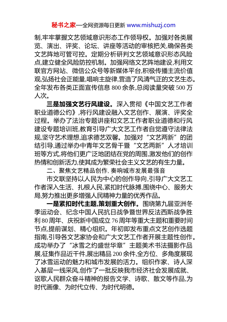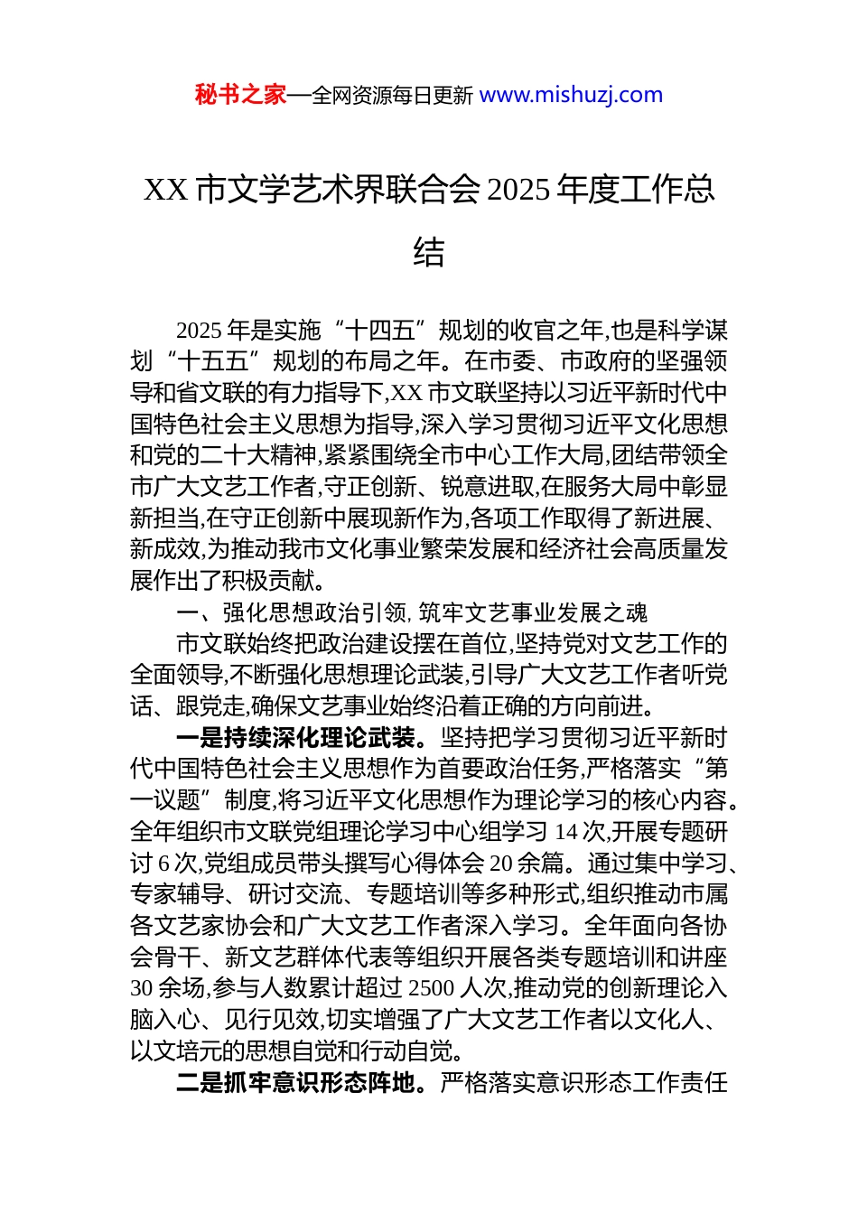 秘书之家—全网资源每日更新 www.mishuzj.comXX 市文学艺术界联合会 2025 年度工作总结2025 年是实施“十四五”规划的收官之年,也是科学谋划“十五五”规划的布局之年。在市委、市政府的坚强领导和省文联的有力指导下,XX 市文联坚持以习近平新时代中国特色社会主义思想为指导,深入学习贯彻习近平文化思想和党的二十大精神,紧紧围绕全市中心工作大局,团结带领全市广大文艺工作者,守正创新、锐意进取,在服务大局中彰显新担当,在守正创新中展现新作为,各项工作取得了新进展、新成效,为推动我市文化事业繁荣发展和经济社会高质量发展作出了积极贡献。一、强化思想政治引领,筑牢文艺事业发展之魂市文联始终把政治建设摆在首位,坚持党对文艺工作的全面领导,不断强化思想理论武装,引导广大文艺工作者听党话、跟党走,确保文艺事业始终沿着正确的方向前进。一是持续深化理论武装。坚持把学习贯彻习近平新时代中国特色社会主义思想作为首要政治任务,严格落实“第一议题”制度,将习近平文化思想作为理论学习的核心内容。全年组织市文联党组理论学习中心组学习 14 次,开展专题研讨 6 次,党组成员带头撰写心得体会 20 余篇。通过集中学习、专家辅导、研讨交流、专题培训等多种形式,组织推动市属各文艺家协会和广大文艺工作者深入学习。全年面向各协会骨干、新文艺群体代表等组织开展各类专题培训和讲座30 余场,参与人数累计超过 2500 人次,推动党的创新理论入脑入心、见行见效,切实增强了广大文艺工作者以文化人、以文培元的思想自觉和行动自觉。二是抓牢意识形态阵地。严格落实意识形态工作责任秘书之家—全网资源每日更新 www.mishuzj.com制,牢牢掌握文艺领域意识形态工作领导权。加强对各类展览、演出、评奖、论坛、讲座等活动的审核把关,确保各类文艺阵地可管可控。定期分析研判文艺领域意识形态风险点,建立健全风险防控机制。加强网络文艺阵地建设,利用文联官方网站、微信公众号等新媒体平台,积极传播主流价值观,弘扬社会正能量,唱响主旋律,营造了风清气正的文艺生态。全年发布各类正面宣传信息 800 余条,总阅读量突破 500 万人次。三是加强文艺行风建设。深入贯彻《中国文艺工作者职业道德公约》,将行风建设融入文艺创作、展演、评奖全过程。举办了法治专题讲座和文艺工作者职业道德和行风建设专题培训班,教育引导广大文艺工作者自觉遵守法律法规,坚守艺术理想,追求德艺双馨。加强对“文艺两新”的团结引导,通过举办中青年文艺骨干暨“文艺两新”人才培训班等方式,将他们更广泛地团结在党的周围,激发他们的创作热情和创新活力,使其成为繁荣社会主义文艺的有生力量。二、聚焦文艺精品创作,奏响城市发展最强音市文联坚持以人民为中心的创作导向,引导广大文艺工作者深入生活、扎根人民,紧扣时代脉搏,围绕中心、服务大局,努力推出更多增强人民精神力量的优秀作品。一是紧扣时代主题,策划重大创作。围绕第九届亚洲冬季运动会、纪念中国人民抗日战争暨世界反法西斯战争胜利 80 周年、庆祝新中国成立 76 周年等重大主题和重要时间节点,提前谋划、精心组织。年初即发布重点文艺创作选题指南,引导各文艺家协会和广大文艺工作者开展主题性创作。成功举办了“冰雪之约盛世华章”主题美术书法摄影作品展,征集作品近千件,展出精品 200 余件,全方位、多角度展现了冰雪运动的魅力和城市发展的活力。组织作家、诗人深入基层一线采风,创作了一批反映我市经济社会发展成就、讴歌人民群众奋斗精神的报告文学、诗歌、散文等作品,为时代画像、为时代立传、为时代明德。秘书之家—全网资源每日更新 www.mishuzj.com二是打造城市品牌,彰显文化魅力。整合全市文艺资源,借势发力,成功创建并荣获“中国诗歌之城”国家级文化品牌,极大提升了我市的文化知名度和美誉度。以此为契机,精心策划开展“第二届 XX 冰雪诗会”,邀请国内外知名诗人齐聚 XX,以诗歌为媒,共赏冰雪神韵。举办“丁香诗笺·音乐朗诵会”,在城市地标奏响诗与音乐的和谐旋律,吸引数万市民和游客驻足欣赏。积极推动文艺“走出去”,携 300 余种本土优秀书籍赴 XX 文博会,在“XX 融媒·书韵共生”板块集中展示 XX 作...