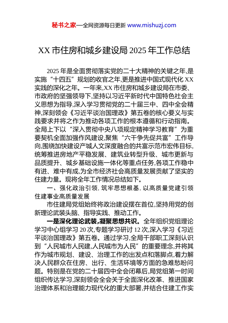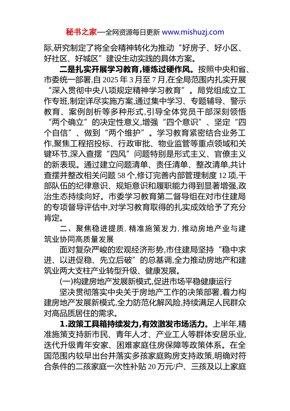 秘书之家—全网资源每日更新 www.mishuzj.comXX 市住房和城乡建设局 2025 年工作总结2025 年是全面贯彻落实党的二十大精神的关键之年,是实施“十四五”规划的收官之年,更是推进中国式现代化 XX实践的深化之年。一年来,XX 市住房和城乡建设局在市委、市政府的坚强领导下,坚持以习近平新时代中国特色社会主义思想为指导,深入学习贯彻党的二十届三中、四中全会精神,深刻领会《习近平谈治国理政》第五卷的核心要义与实践要求并将之作为推动各项工作的根本遵循和行动指南。全局上下以“深入贯彻中央八项规定精神学习教育”为重要契机全面加强作风建设,聚焦“六干争先促共富”工作导向,围绕加快建设产城人文深度融合的共富示范市宏伟目标,统筹推进房地产平稳发展、建筑业转型升级、城市更新与品质提升、城乡基础设施一体化等重点任务,各项工作稳中有进、难中有成,为全市经济社会高质量发展贡献了坚实的住建力量。现将全年工作情况总结如下。一、强化政治引领,筑牢思想根基,以高质量党建引领住建事业高质量发展市住建局党组始终将政治建设摆在首位,坚持用党的创新理论武装头脑、指导实践、推动工作。一是深化理论武装,凝聚思想共识。全年组织党组理论学习中心组学习 20 次,专题学习研讨 12 次,深入学习《习近平谈治国理政》第五卷。通过学习,全局干部职工深刻认识到“人民城市人民建,人民城市为人民”的重要理念,并将其作为城市规划、建设、治理工作的出发点和落脚点,着力解决人民群众在住房、出行、生活环境等方面的急难愁盼问题。特别是在党的二十届四中全会闭幕后,局党组第一时间组织传达学习,深刻领会全会关于全面深化改革、推进国家治理体系和治理能力现代化的重大部署,并结合住建工作实秘书之家—全网资源每日更新 www.mishuzj.com际,研究制定了将全会精神转化为推动“好房子、好小区、好社区、好城区”建设生动实践的具体方案。二是扎实开展学习教育,锤炼过硬作风。按照中央和省、市委统一部署,自 2025 年 3 月至 7 月,在全局范围内扎实开展“深入贯彻中央八项规定精神学习教育”。局党组成立工作专班,制定详尽实施方案,通过集中学习、专题辅导、警示教育、案例剖析等多种形式,引导全体党员干部深刻领悟“两个确立”的决定性意义,增强“四个意识”、坚定“四个自信”、做到“两个维护”。学习教育紧密结合业务工作,聚焦工程招投标、行政审批、物业监管等重点领域和关键环节,深入查摆“四风”问题特别是形式主义、官僚主义的新表现。通过建立问题清单、责任清单、整改清单,共计查摆并整改相关问题 58 个,修订完善内部管理制度 12 项,干部队伍的纪律意识、规矩意识和履职能力得到显著增强,政治生态持续向好。市委学习教育第二督导组在对市住建局的专项督导评估中,对学习教育取得的扎实成效给予了充分肯定。二、聚焦稳进提质,精准施策发力,推动房地产业与建筑业协同高质量发展面对复杂严峻的宏观经济形势,市住建局坚持“稳中求进、以进促稳、先立后破”的总基调,全力推动房地产和建筑业两大支柱产业转型升级、健康发展。(一)构建房地产发展新模式,促进市场平稳健康运行坚决贯彻落实中央关于房地产工作的决策部署,着力构建房地产发展新模式,全力防范化解风险,持续满足人民群众对高品质居住的需求。1.政策工具箱持续发力,有效激发市场活力。上半年,精准施策支持新市民、青年人才、产业工人等群体安居乐业,迭代升级青年安家、困难家庭住房保障等政策体系。在全国范围内较早出台并落实多孩家庭购房支持政策,明确对符合条件的二孩家庭一次性补贴 20 万元/户、三孩及以上家庭秘书之家—全网资源每日更新 www.mishuzj.com一次性补贴 40 万元/户,全年累计为超过 800 户多孩家庭提供了安家支持,政策的示范效应和共富成效显著。下半年,为进一步巩固市场回稳态势,全力落实去库存举措,持续推进购房消费券、住房“以旧换新”、人才安居团购等一揽子政策落地见效。全年通过“以旧换新”模式帮助 1200 余户家庭改善了居住条件,有效畅通了一二手房市场的循环。同时,积极研究谋划“以房换地”、“以拆代改”等创新性政策工具,支持房地双向联动,有效创造和激发了新的购-...